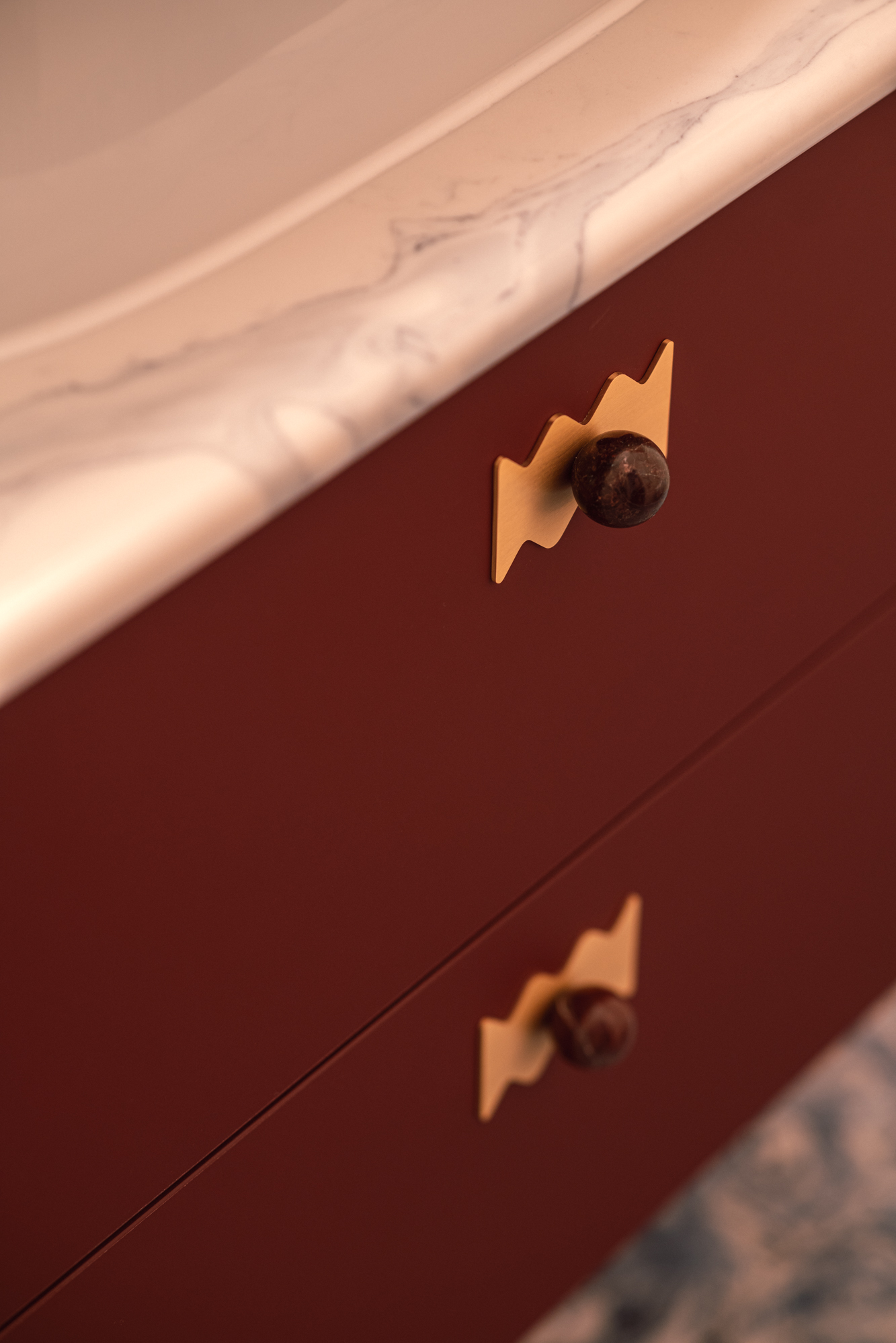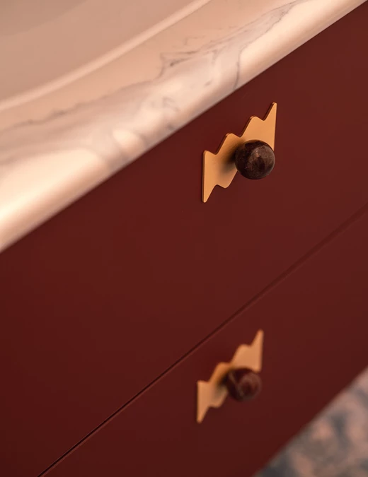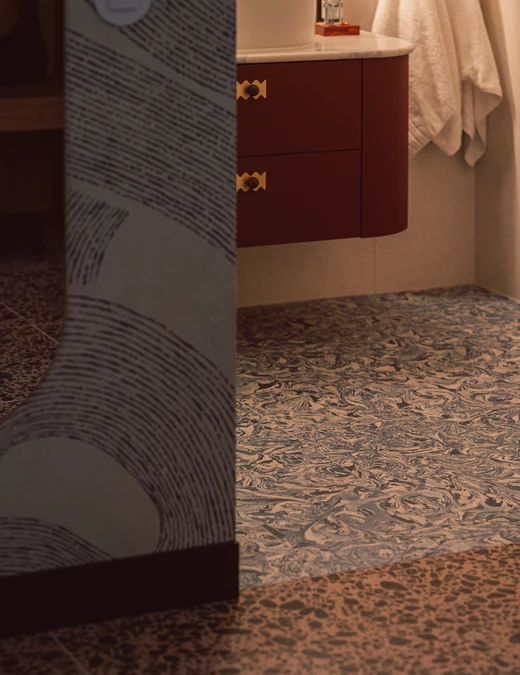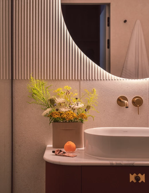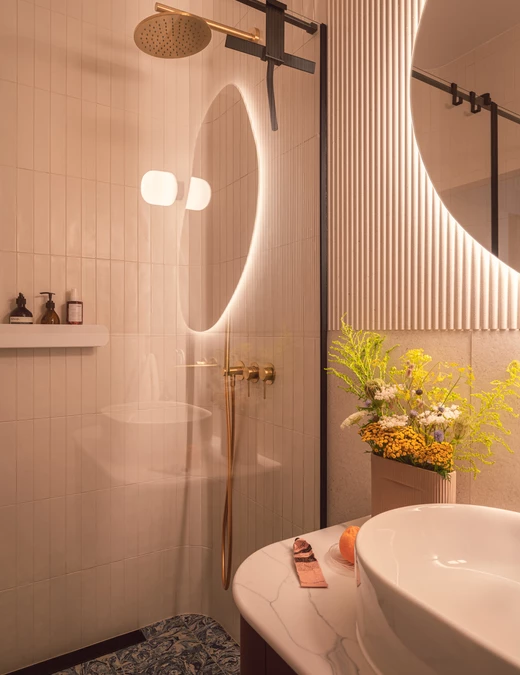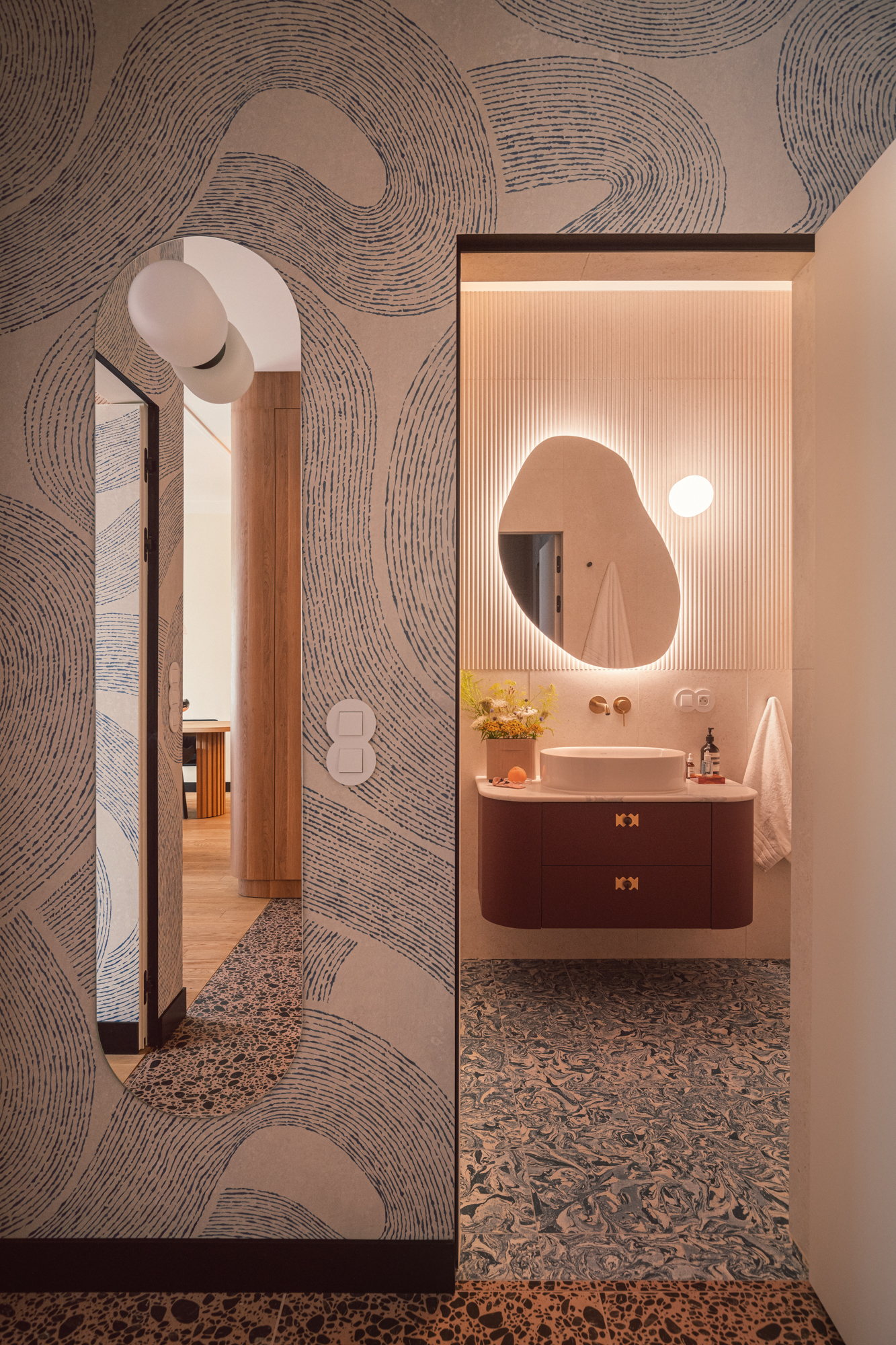 W łazience zastosowano płytki marki Arcana imitujące powierzchnię wody. Bordowa szafka umywalkowa kontrastuje z wyrazistą podłogą, a reszta pomieszczenia utrzymana jest w neutralnych tonach beżu i bieli. Organiczne formy – od zaokrąglonego blatu i strefy prysznicowej, przez frezowane płytki, po lustro o miękkiej linii – konsekwentnie podtrzymują założenia projektowe.