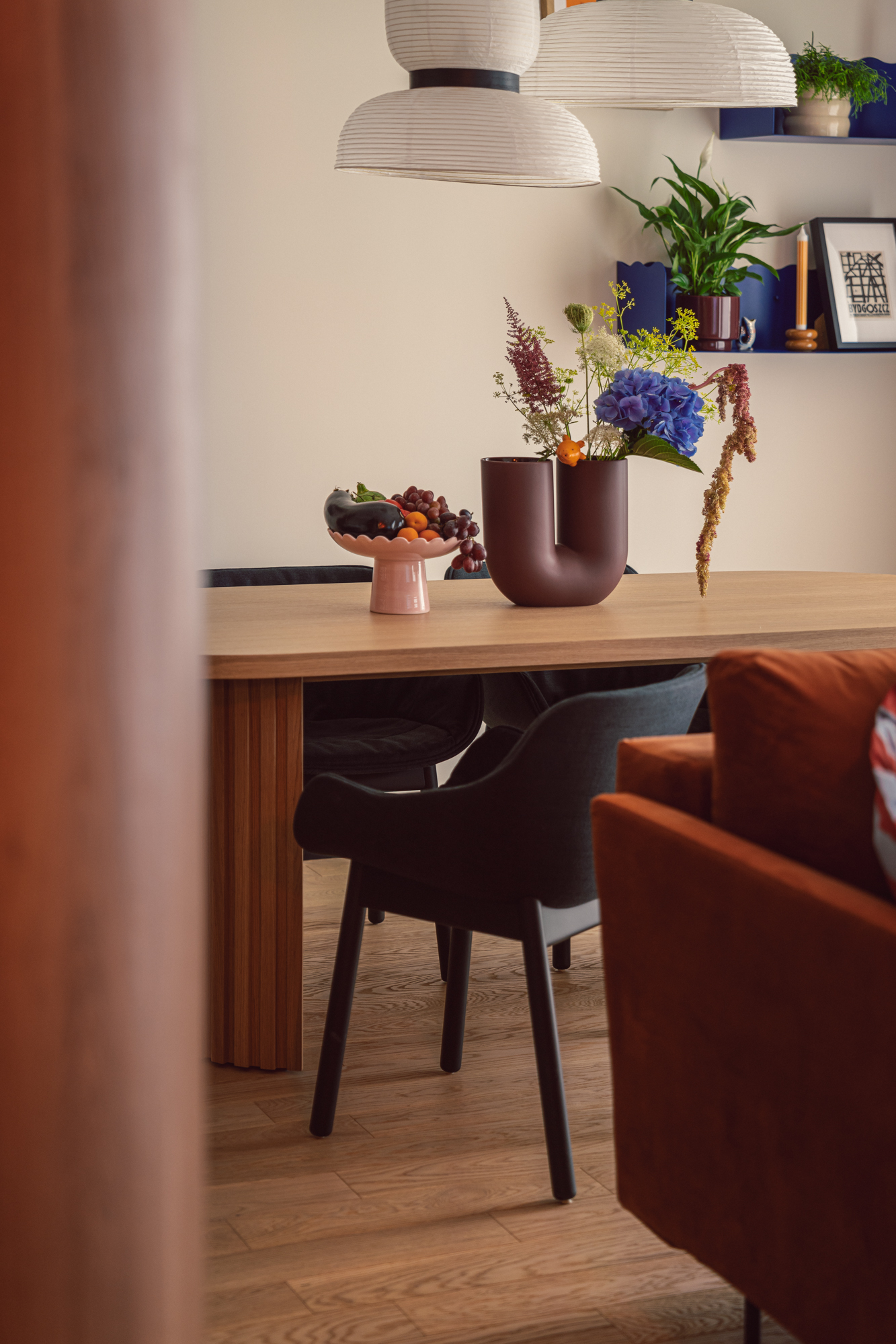 W części jadalnianej znalazły się meble polskich marek: stół Tabell, krzesła MDD oraz falowane półki Desiva. Ich delikatne, obłe formy nawiązują do pozostałych elementów wnętrza. Nad stołem zawisły lekkie, papierowe lampy Formakami marki &Tradition, a ściany zdobią grafiki Ryszarda Kai i Sylwii Szyrszeń-Jaskierskiej, doskonale wpisujące się w bydgoski kontekst.