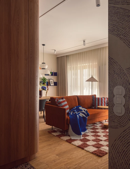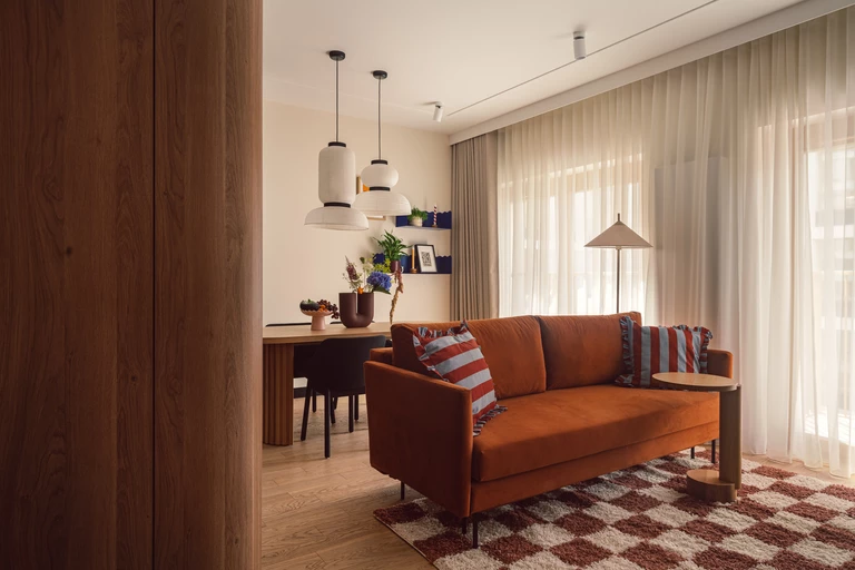 Salon uzupełnia ruda sofa marki Optisofa, stolik Tamo, wyrazista szafka RTV Desiva, ciepła drewniana podłoga i miękki dywan. Dzięki rozkładanej sofie przestrzeń dzienna może pełnić również funkcję sypialni dla gości – co ma szczególne znaczenie w przypadku najmu krótkoterminowego.