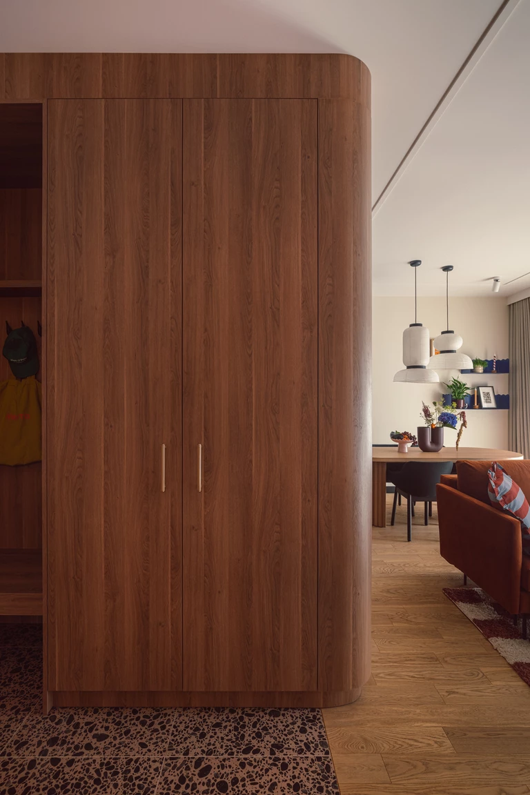 Od strony holu zabudowa skrywa przestrzeń do przechowywania, pralkę i sprzęty gospodarcze. W salonie pełni funkcję regału z lustrzanym tłem, optycznie powiększającym wnętrze, a w kuchni – mieści lodówkę i zabudowę kuchenną. Ta wielofunkcyjna, płynna forma stała się osią całej aranżacji, umożliwiając centralne ustawienie sofy i podział strefy dziennej na wypoczynkową oraz jadalnianą.