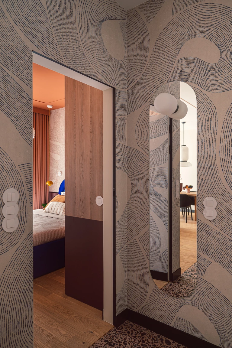 Hol to śmiałe zestawienie wzorów i odcieni: tapeta Sandberg z wyrazistym, niebieskim, graficznym motywem, różowo-czarne płytki przypominające bruk z bydgoskiej starówki oraz zabudowa meblowa, która spaja całość i nadaje ton przestrzeni.
