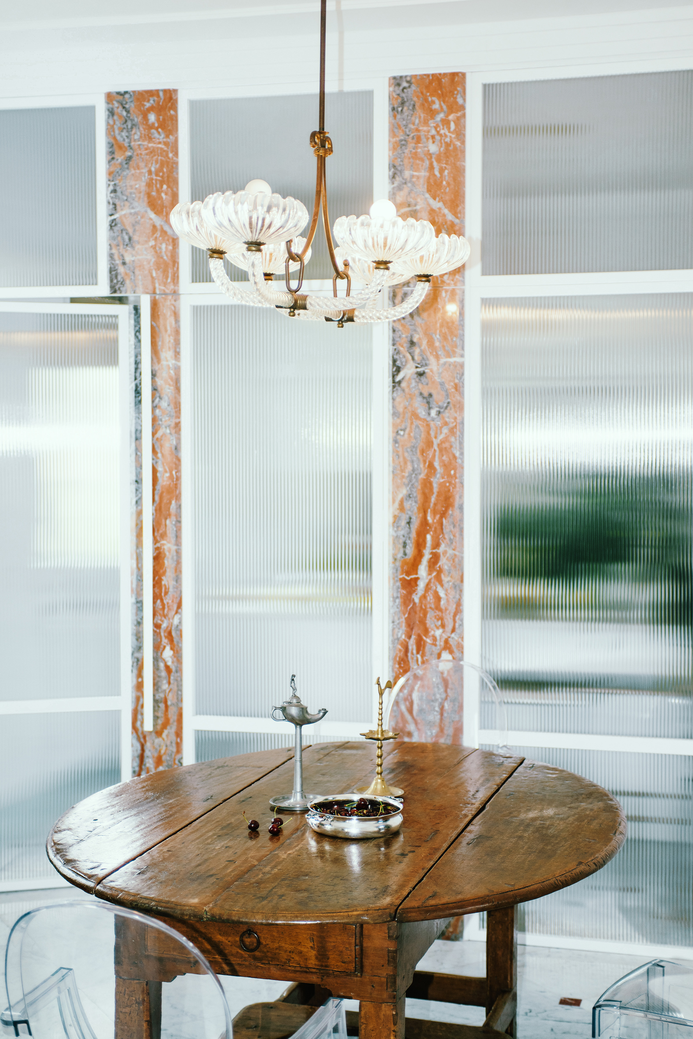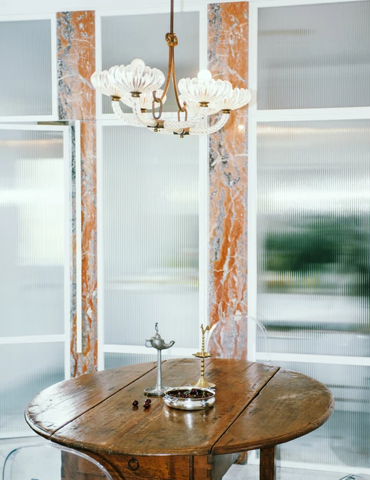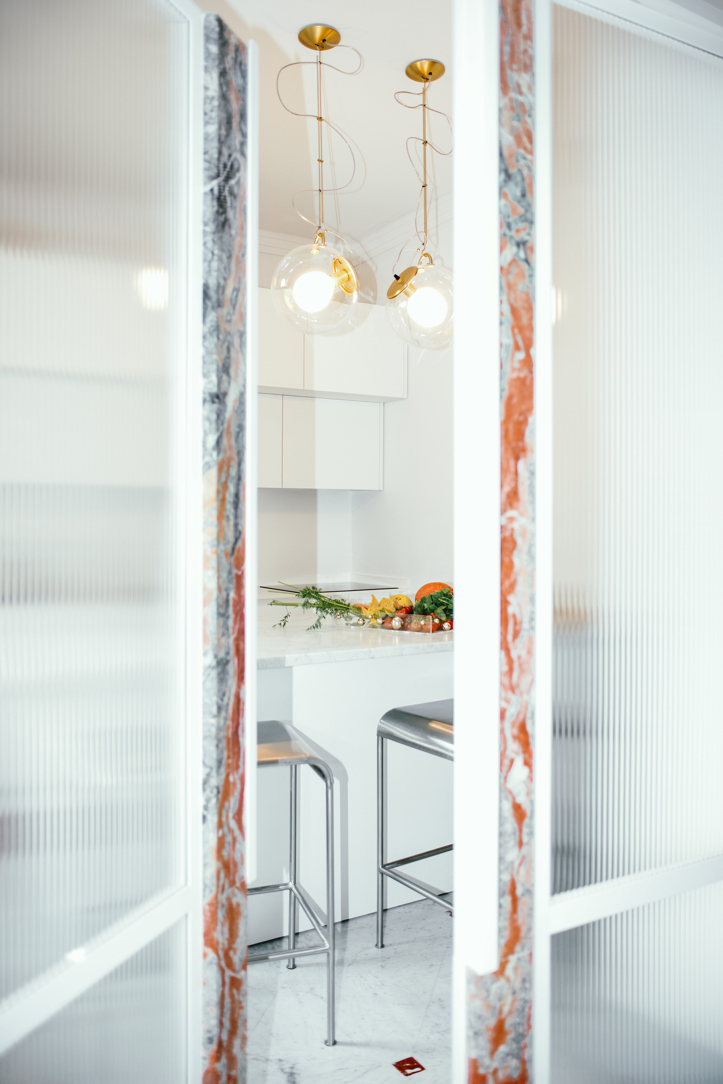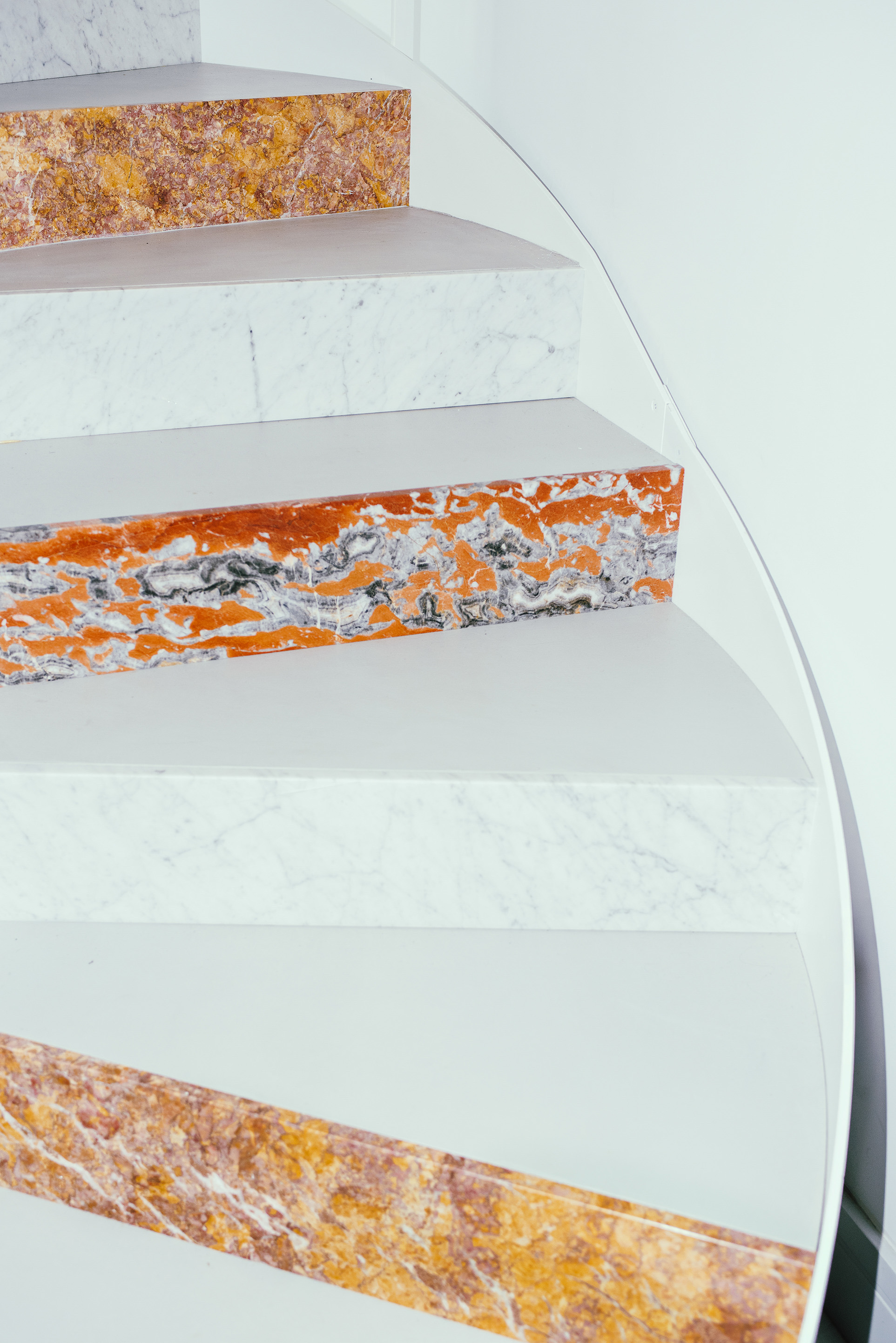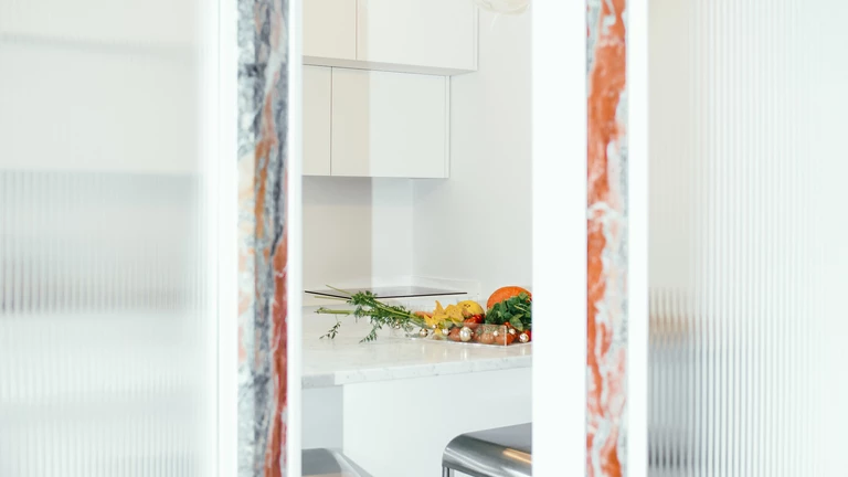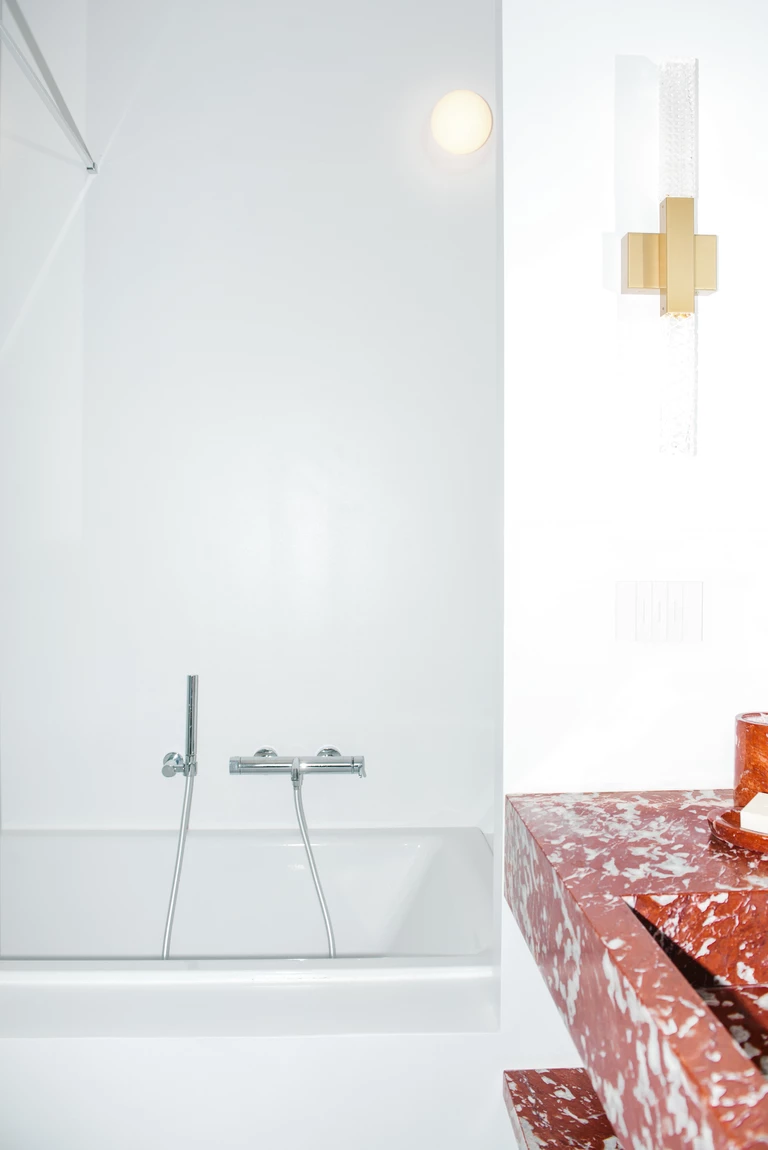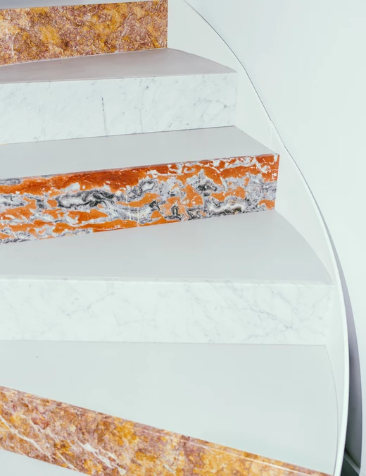Wnętrze definiują odważne, materiałowe interwencje. Na tle nieskazitelnej bieli pojawiają się wstawki z marmuru Rouge de France, Broccatello i białej Carrary. Nie są to jednak typowe okładziny, lecz raczej „znaki” i „epifanie”, które zakotwiczają przestrzeń w kulturowym dziedzictwie. Podłoga z jasnoszarego mikrocementu została poprzecinana fragmentami kamienia, co przywodzi na myśl wydobywane z ziemi starożytne relikty i symbolizuje nawarstwianie się czasu.