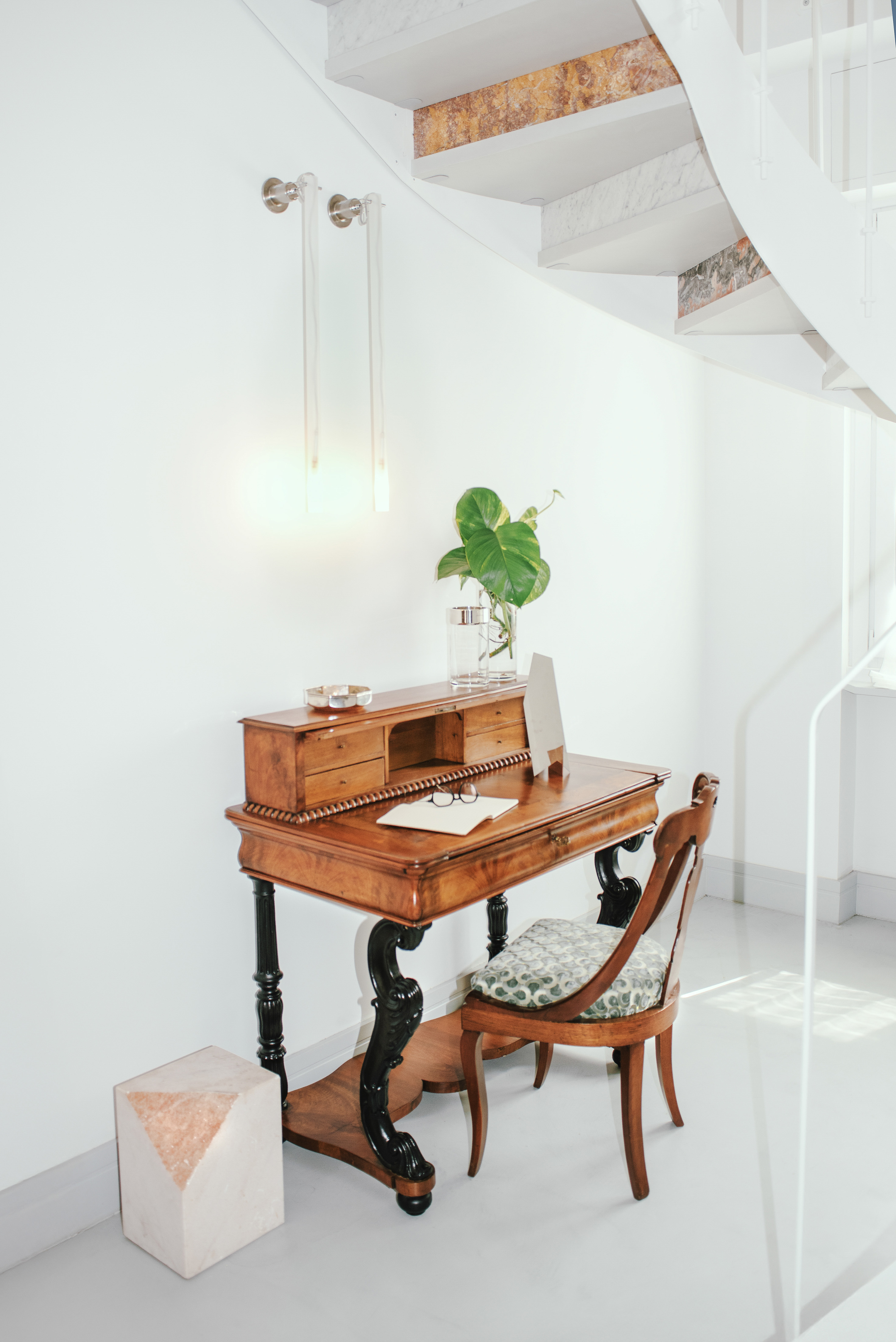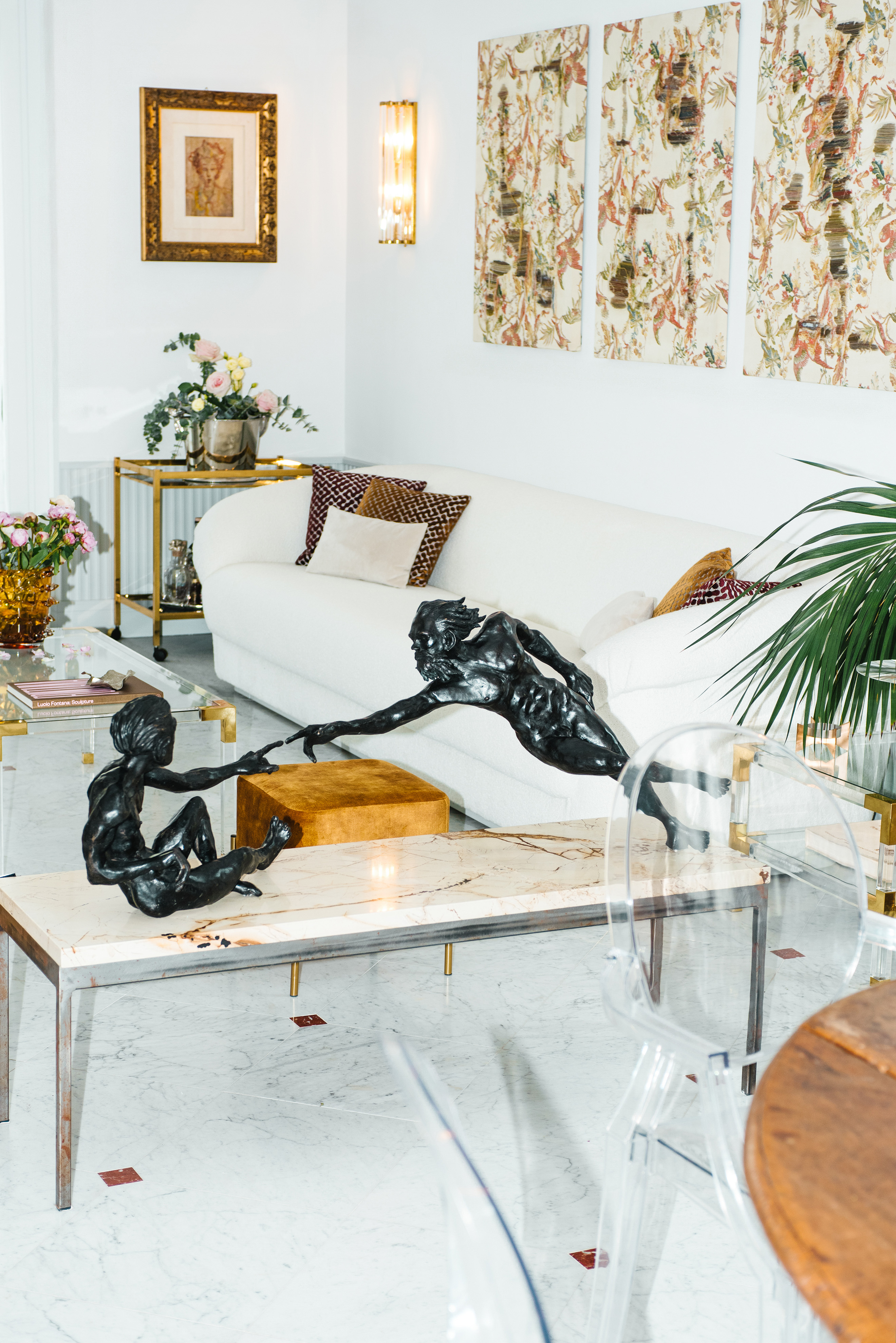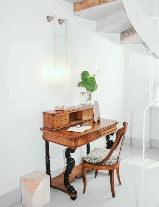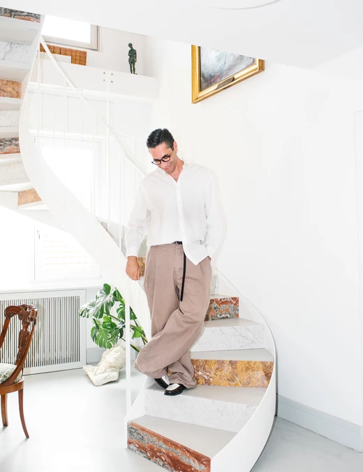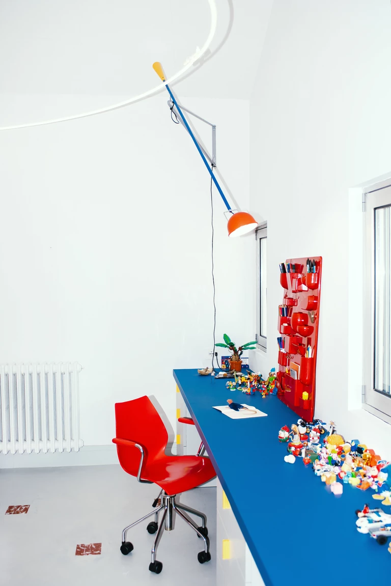 Górny poziom, zaprojektowany z myślą o synu inwestorów, reinterpretuje te same materiały w sposób bardziej zabawny i dynamiczny. Tutaj „pamięć” staje się elastyczna, sprzyjająca eksploracji. W tej części apartamentu znalazły się meble zaprojektowane specjalnie przez studio EUTOPIARCH, w tym stolik kawowy Golgotha, sofa w tkaninie bouclé oraz ławka Ionica.