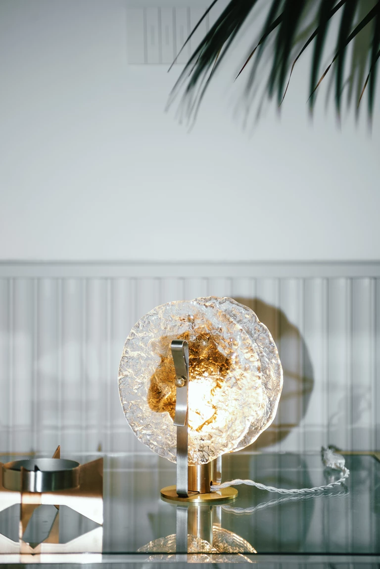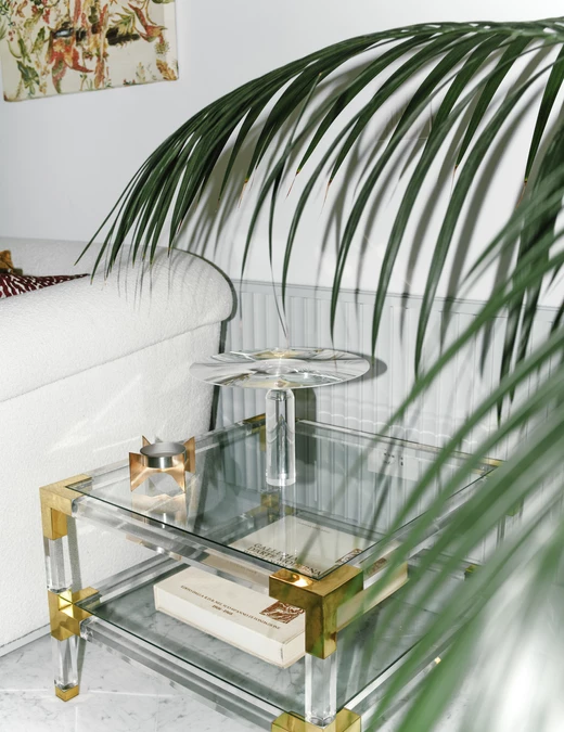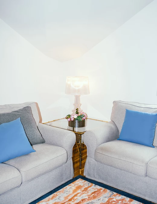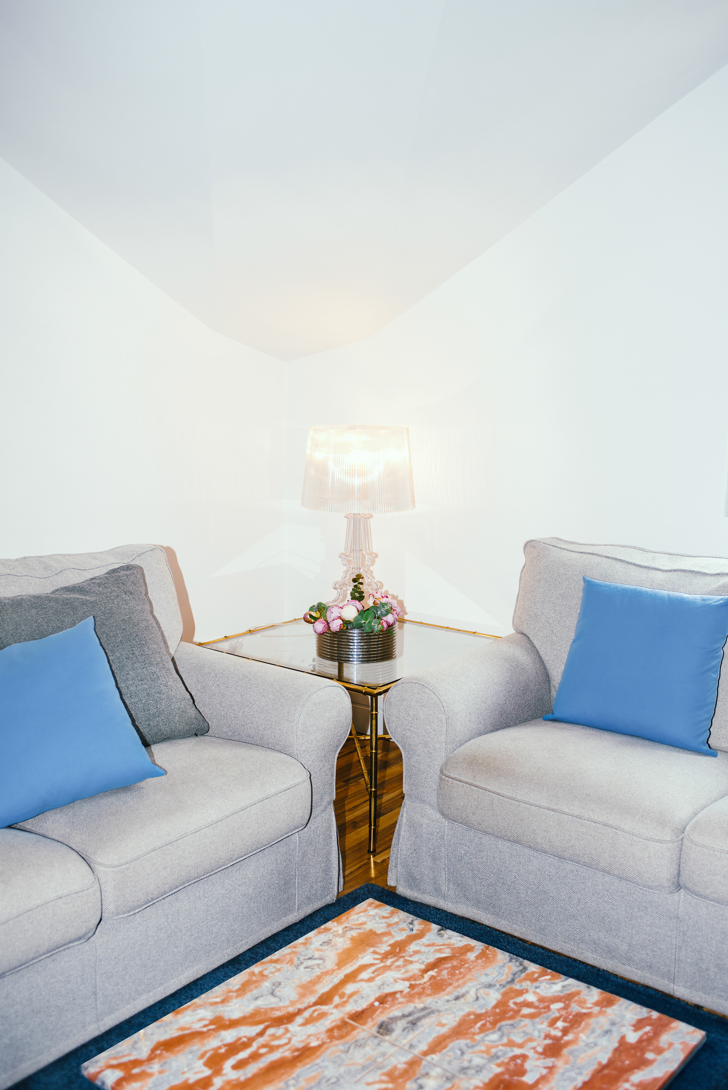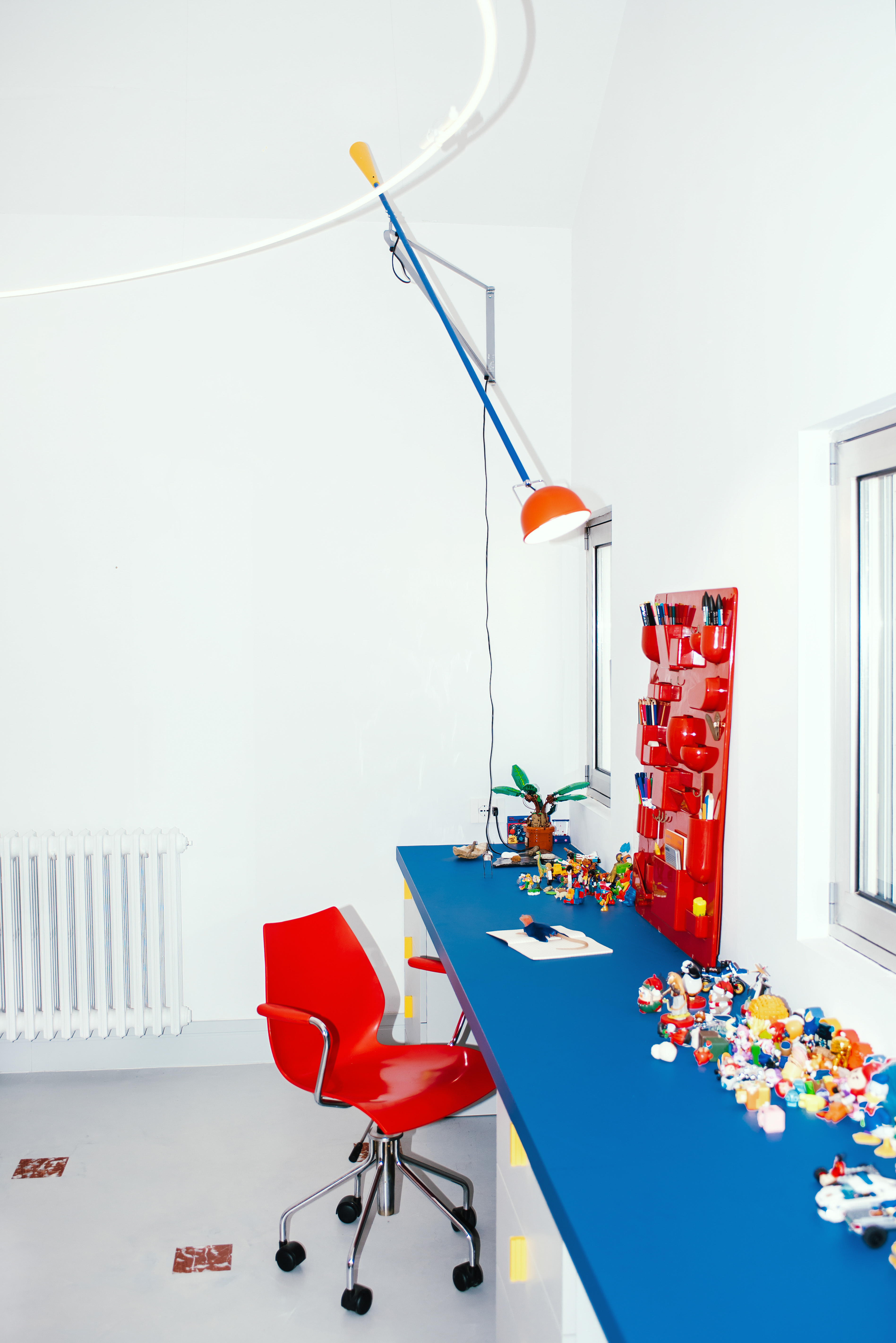 Górny poziom, zaprojektowany z myślą o synu inwestorów, reinterpretuje te same materiały w sposób bardziej zabawny i dynamiczny. Tutaj „pamięć” staje się elastyczna, sprzyjająca eksploracji. W tej części apartamentu znalazły się meble zaprojektowane specjalnie przez studio EUTOPIARCH, w tym stolik kawowy Golgotha, sofa w tkaninie bouclé oraz ławka Ionica.