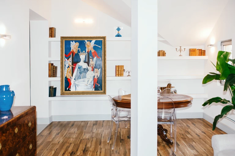 Sercem tej strefy jest klatka schodowa, która w zamyśle twórców ewokować ma dramatyzm fontann Wersalu. To w tej przestrzeni umieszczono imponujący obraz św. Hieronima, przypisywany Francesco Hayezowi, który stał się wizualną i duchową ikoną domu.