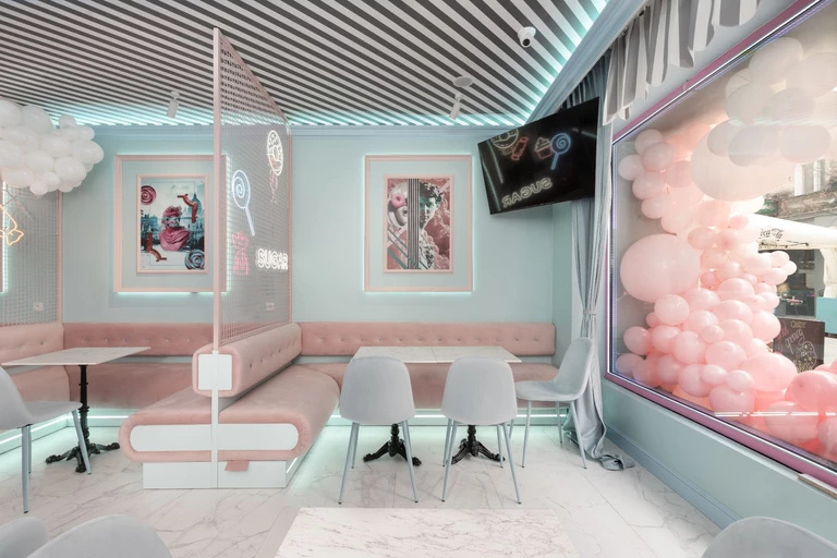 We wnętrzu nie ma tradycyjnych lamp. Główne oświetlenie to neony o kształtach słodyczy i ukryte podświetlenie liniowe. Charakterystyczna poświata podkreśla bajkowy klimat wnętrza i dodaje mu młodzieżowego vibe'u.