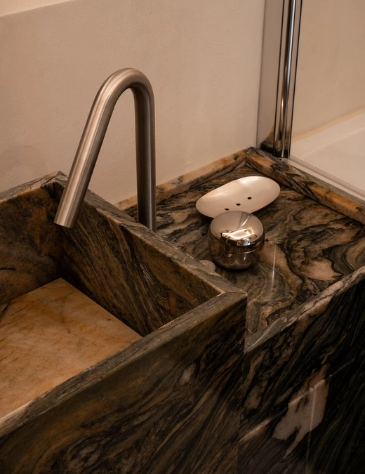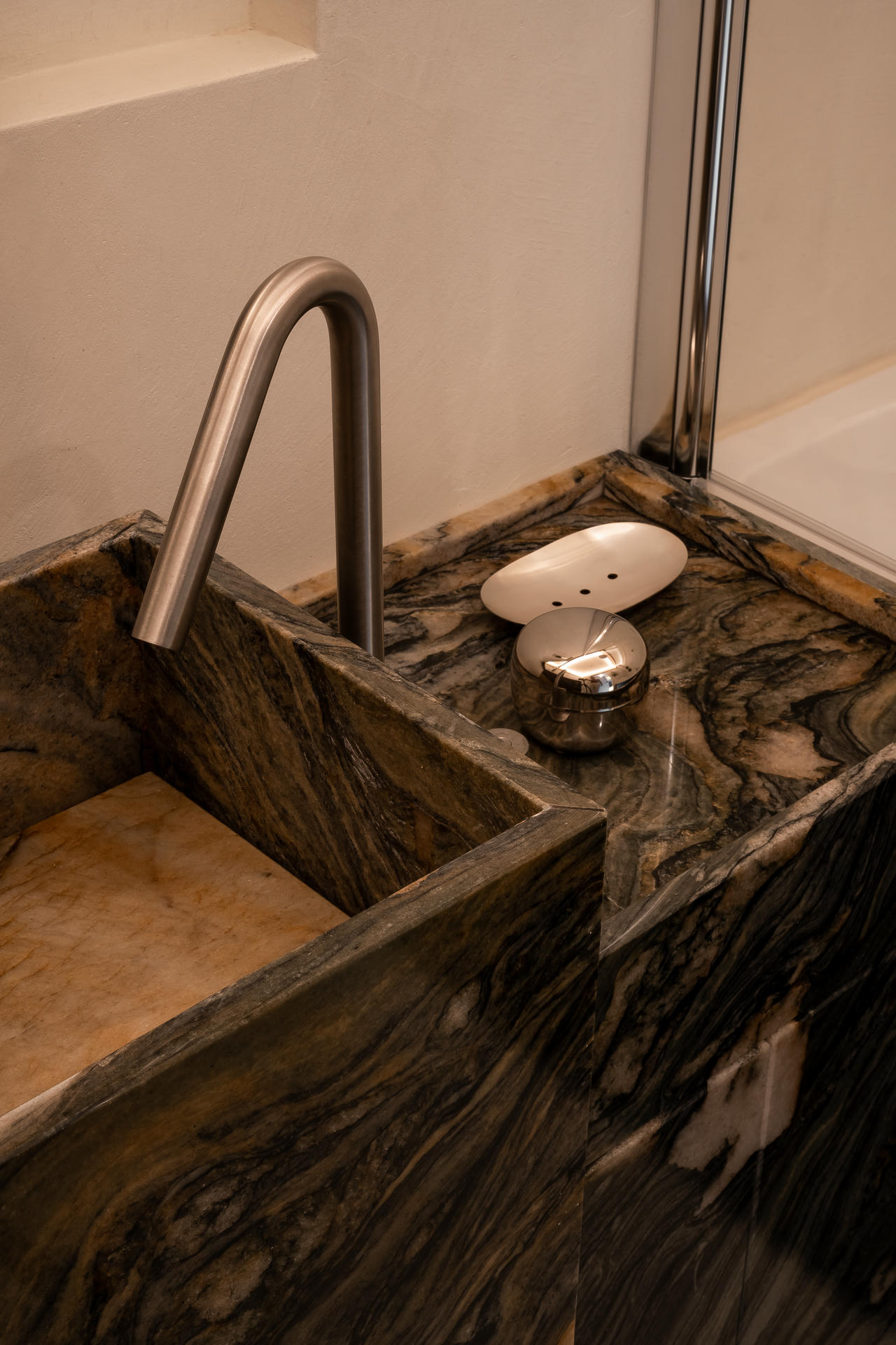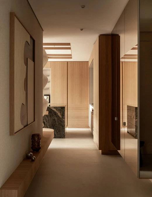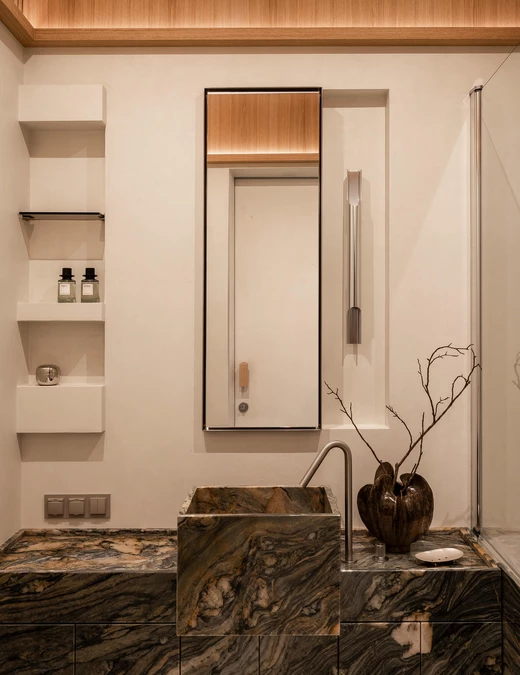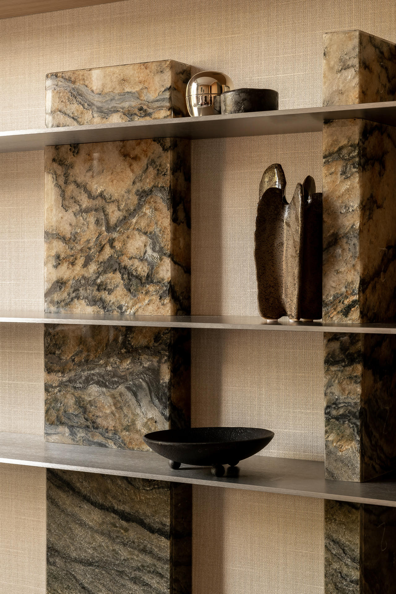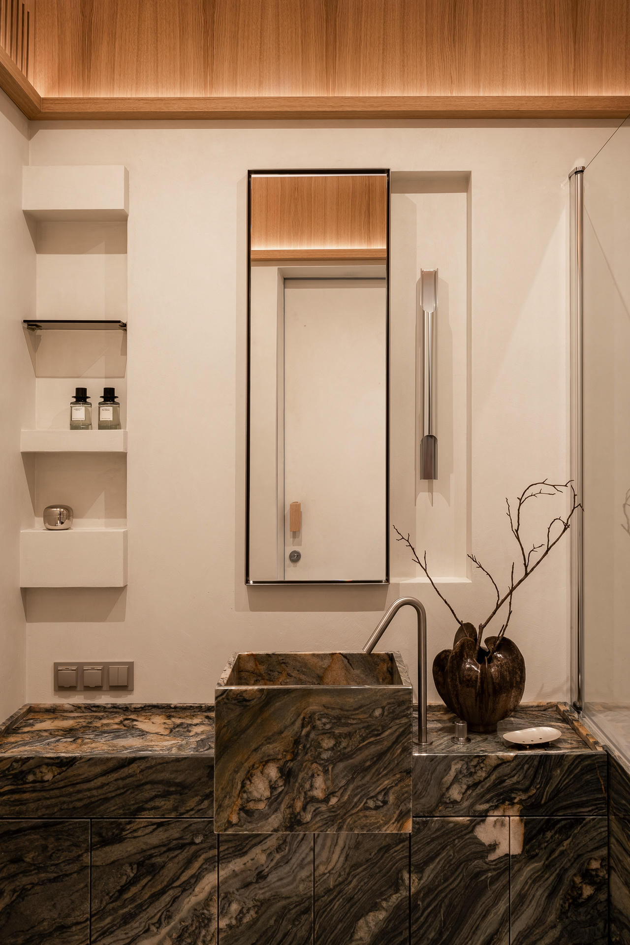 W łazience mikrocement tworzy jednolitą bazę, z której wyłania się kamień w formie rzeźbiarskiej zabudowy wanny i umywalki. Światło wydobywa jego strukturę, a fornirowana opaska pod sufitem dodaje ciepła. Aby utrzymać wizualną spójność, półki wykonano z kamienia i mikrocementu.