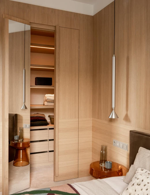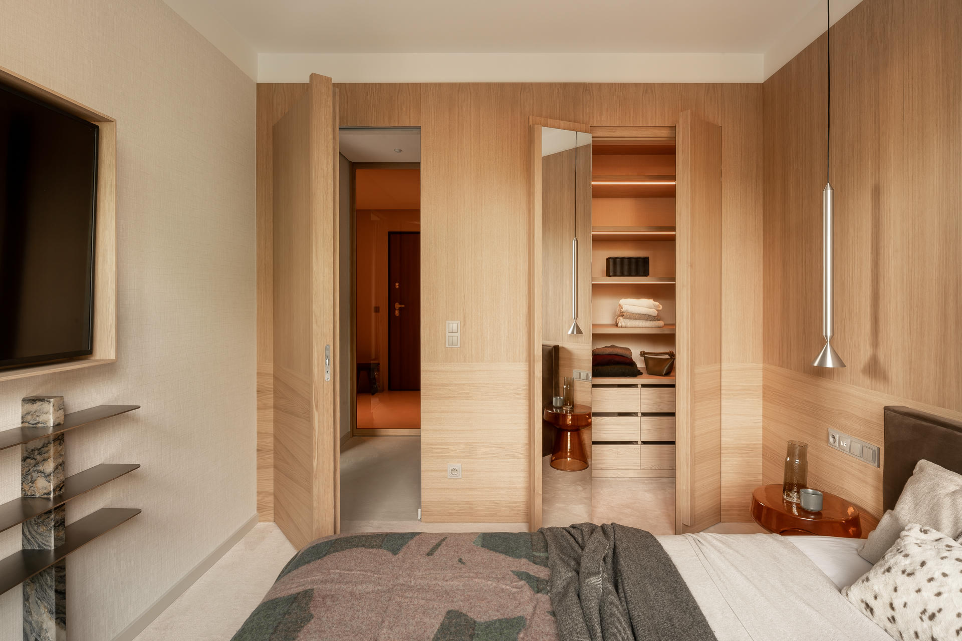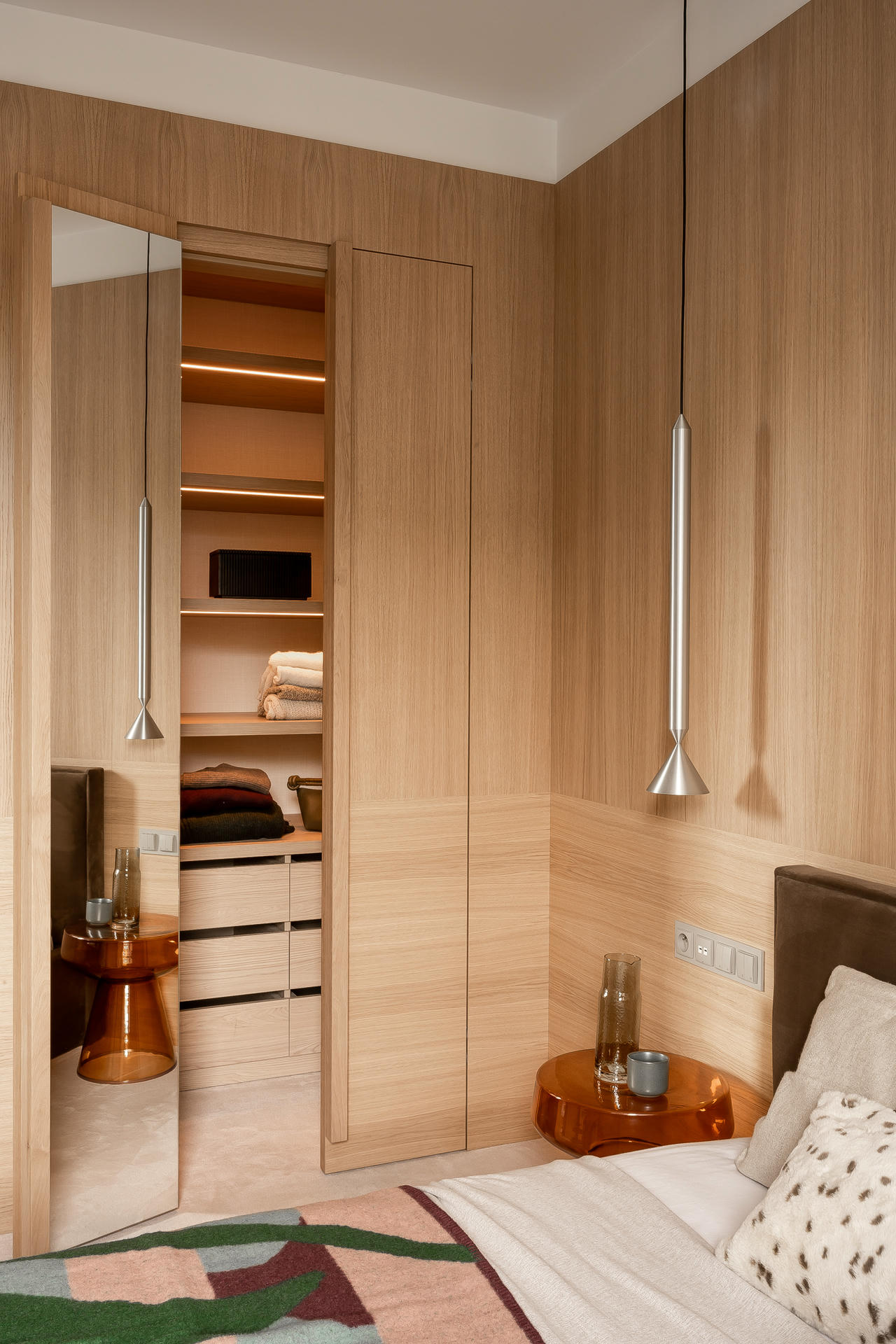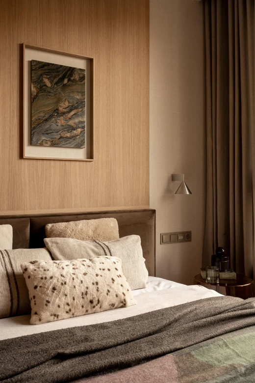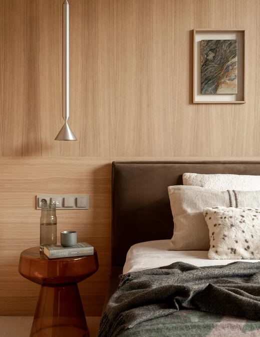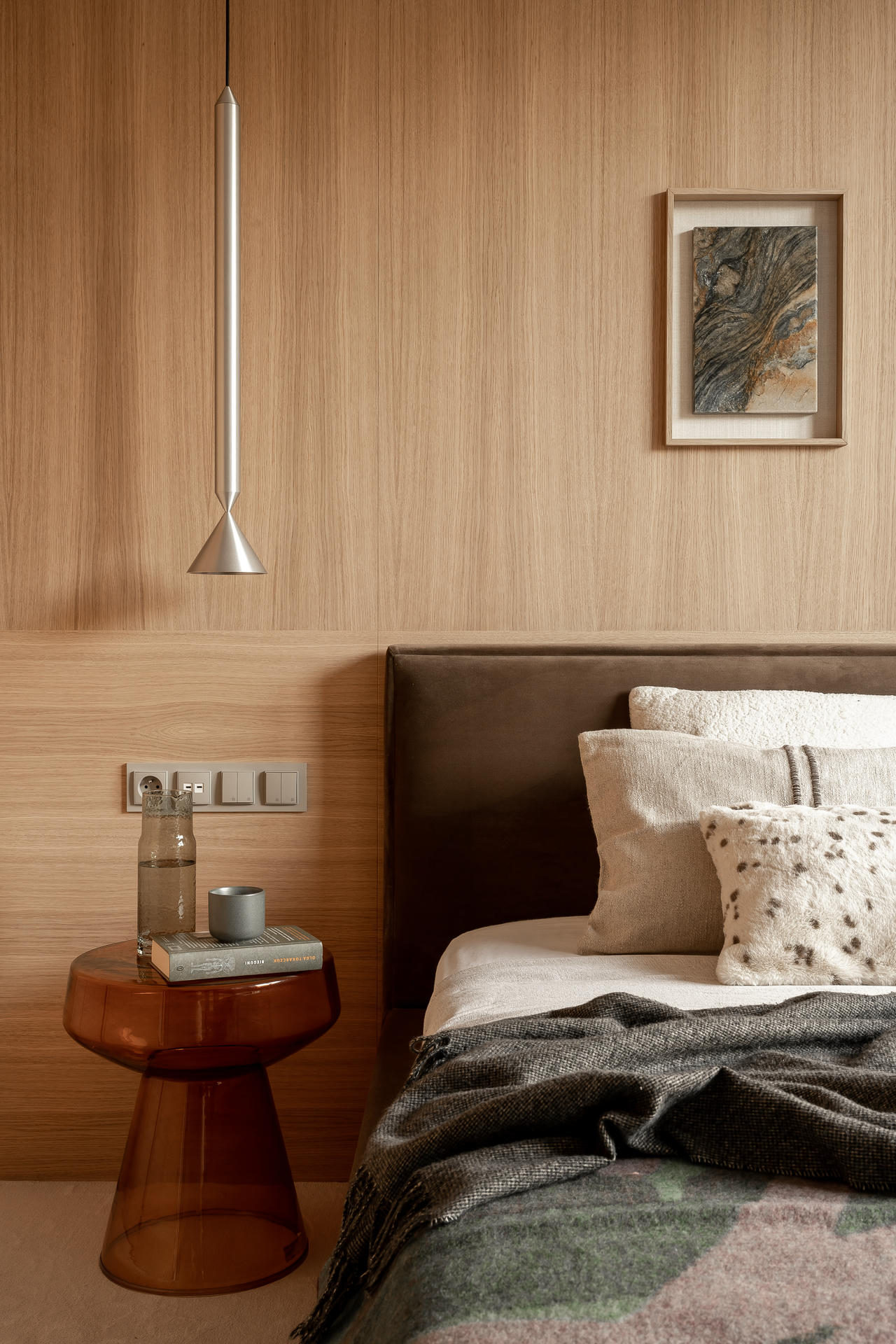 Okno w sypialni wychodzi na starodrzew, a widok ten stał się naturalnym obrazem w drewnianej ramie. Miękkie łóżko z welwetowym zagłówkiem ustawiono na tle paneli z dębowego forniru, które płynnie przechodzą w zabudowę ukrytej garderoby. Po otwarciu dwuskrzydłowych drzwi światło i zieleń zza okna odbijają się w lustrach. W tym pomieszczeniu także powraca kamień: w formie obrazów nad łóżkiem oraz w konsoli.