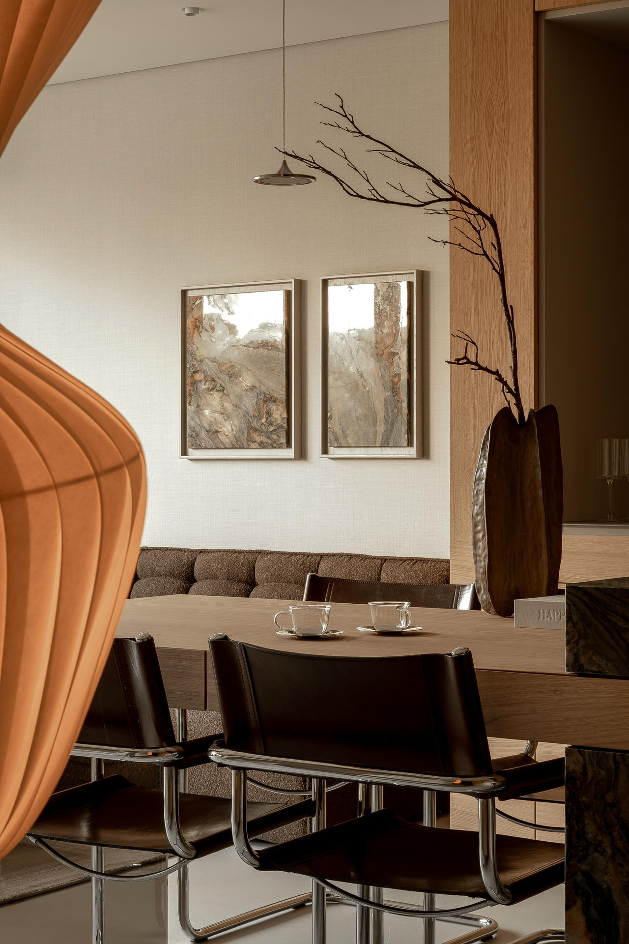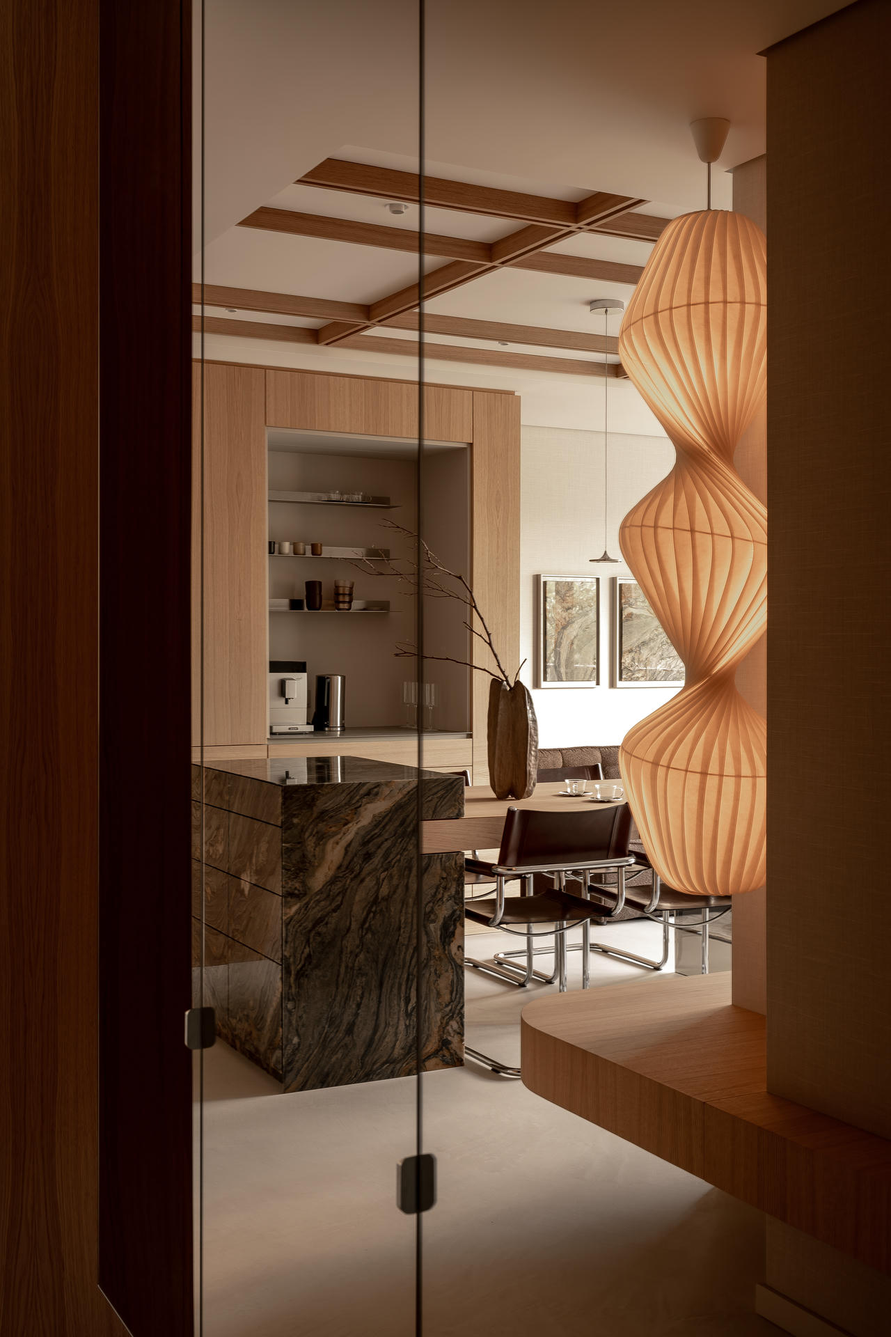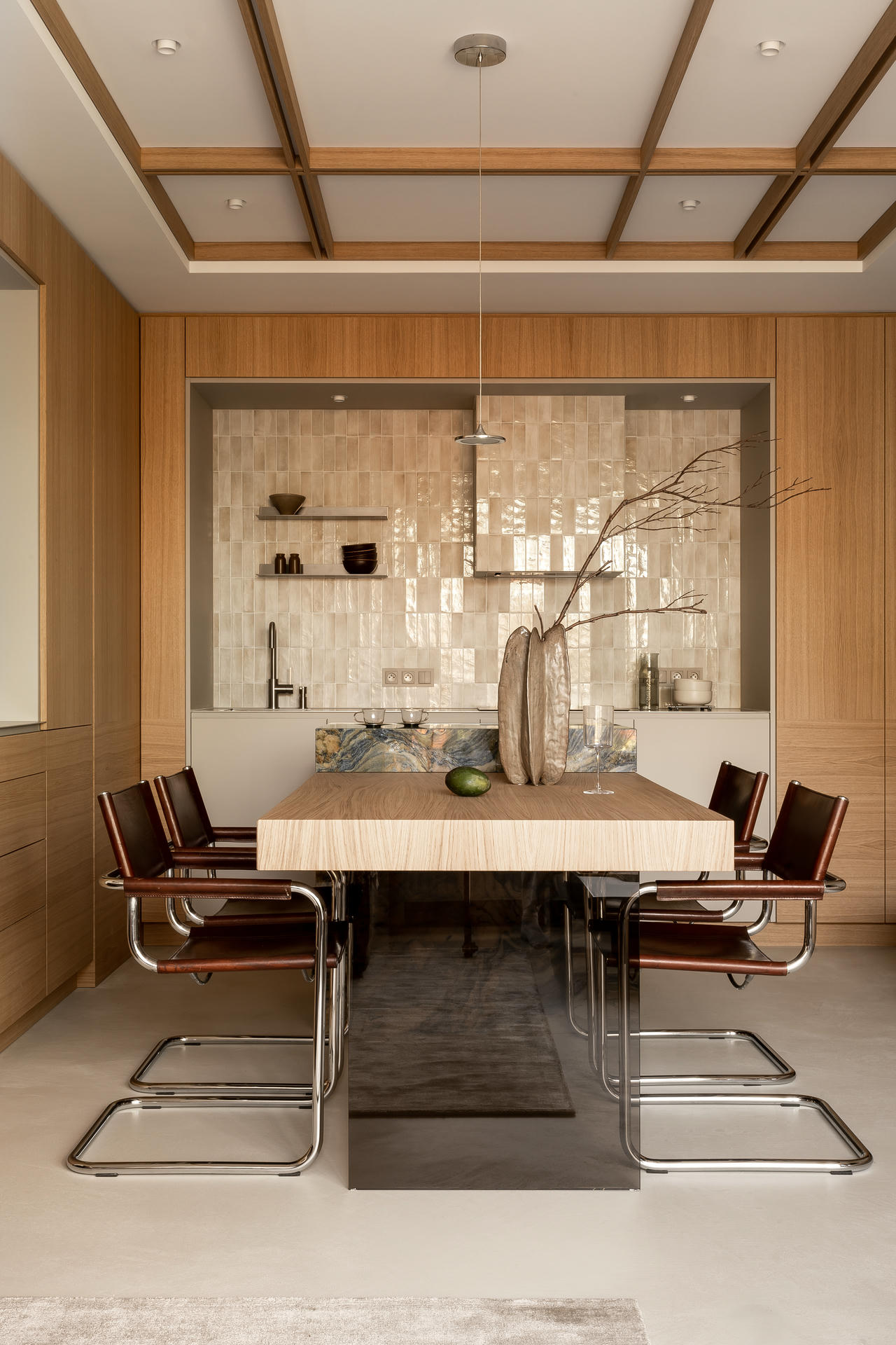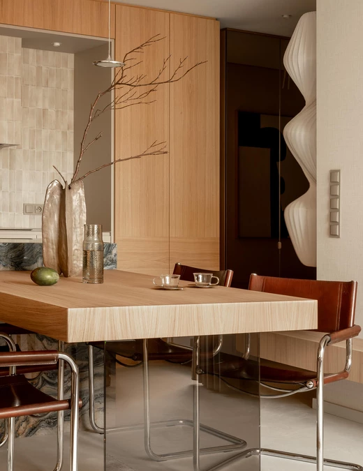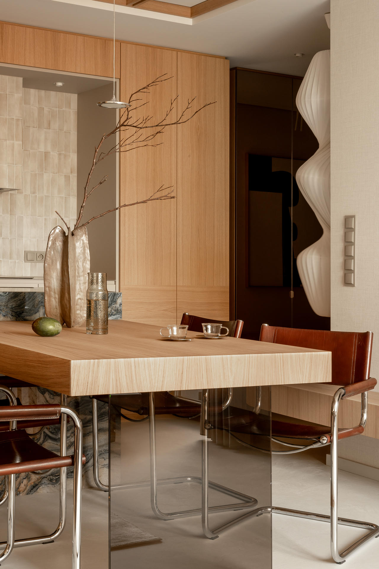 Od strony salonu lekkości przestrzeni dodaje drewniany stół na szklanej nodze. Towarzyszą mu ikoniczne krzesła wspornikowe projektu Marta Stama, które w skórzanym wykończeniu w kolorze koniaku wprowadzają ponadczasowy charakter.