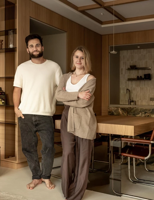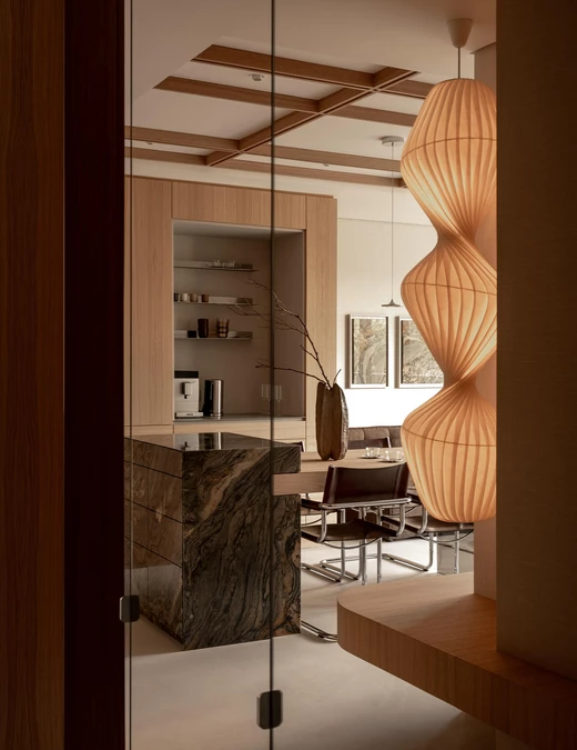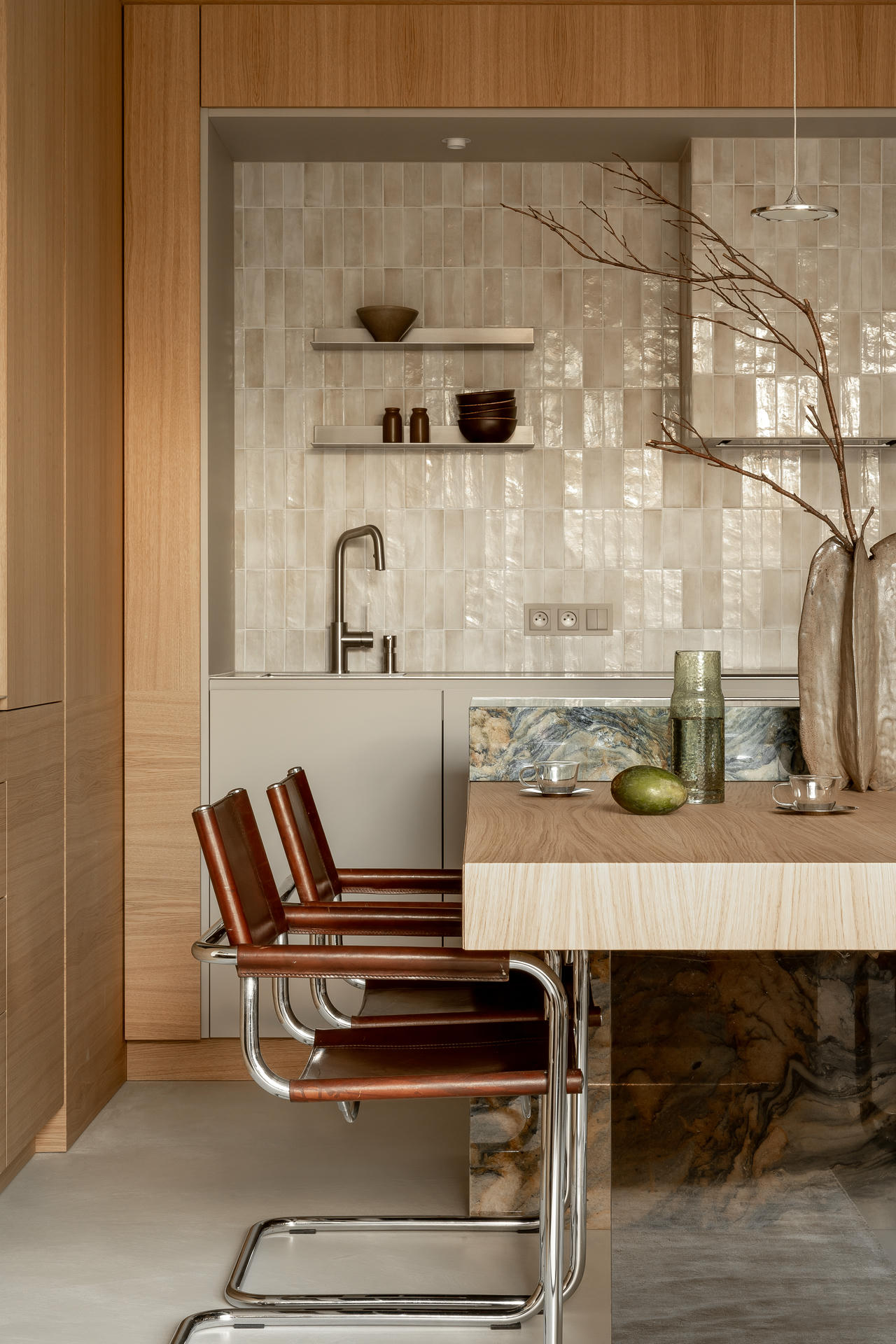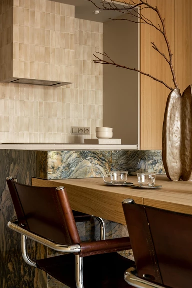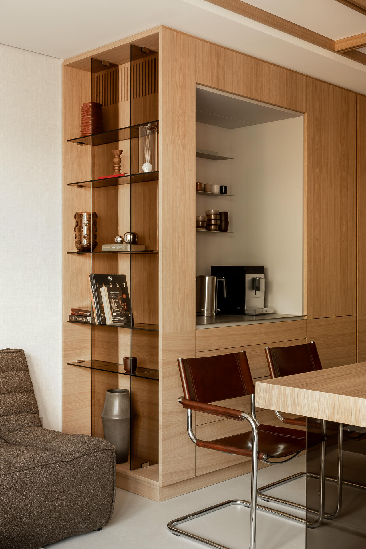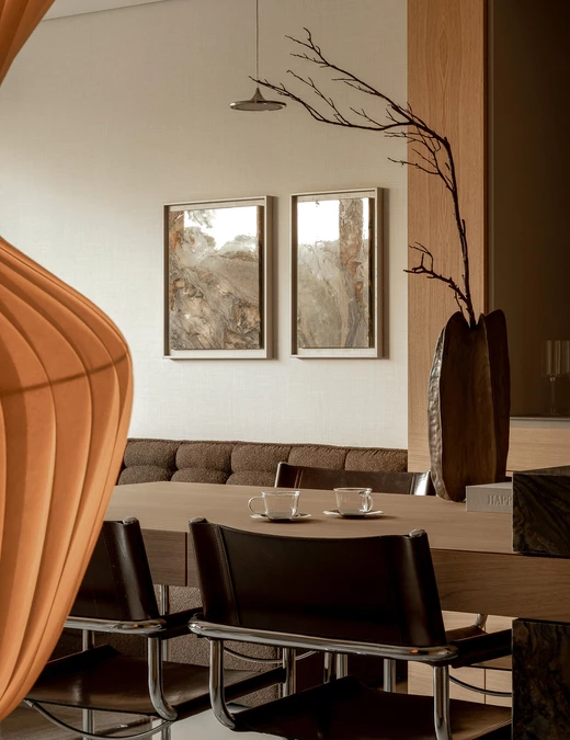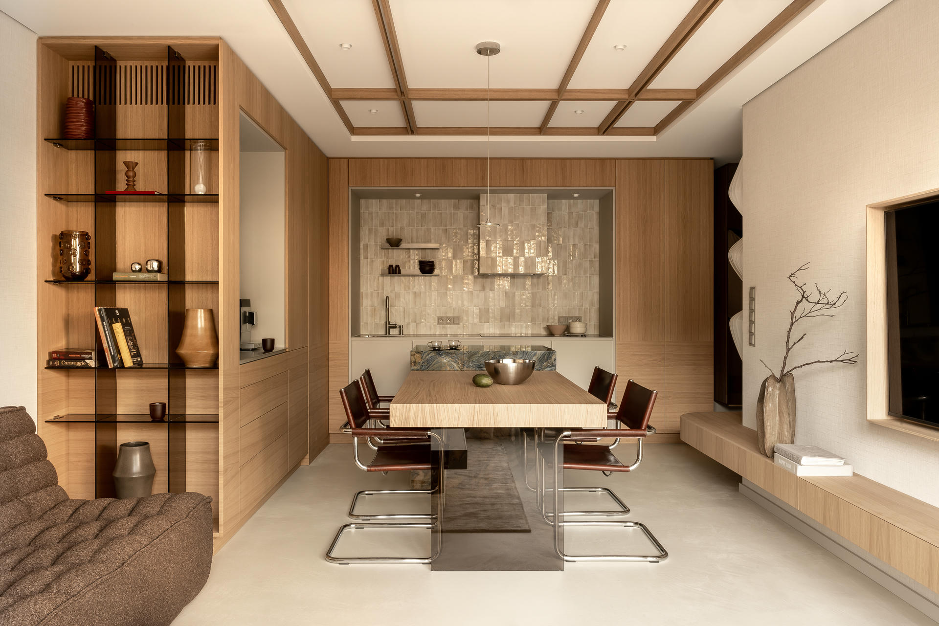 Od strony salonu lekkości przestrzeni dodaje drewniany stół na szklanej nodze. Towarzyszą mu ikoniczne krzesła wspornikowe projektu Marta Stama, które w skórzanym wykończeniu w kolorze koniaku wprowadzają ponadczasowy charakter.