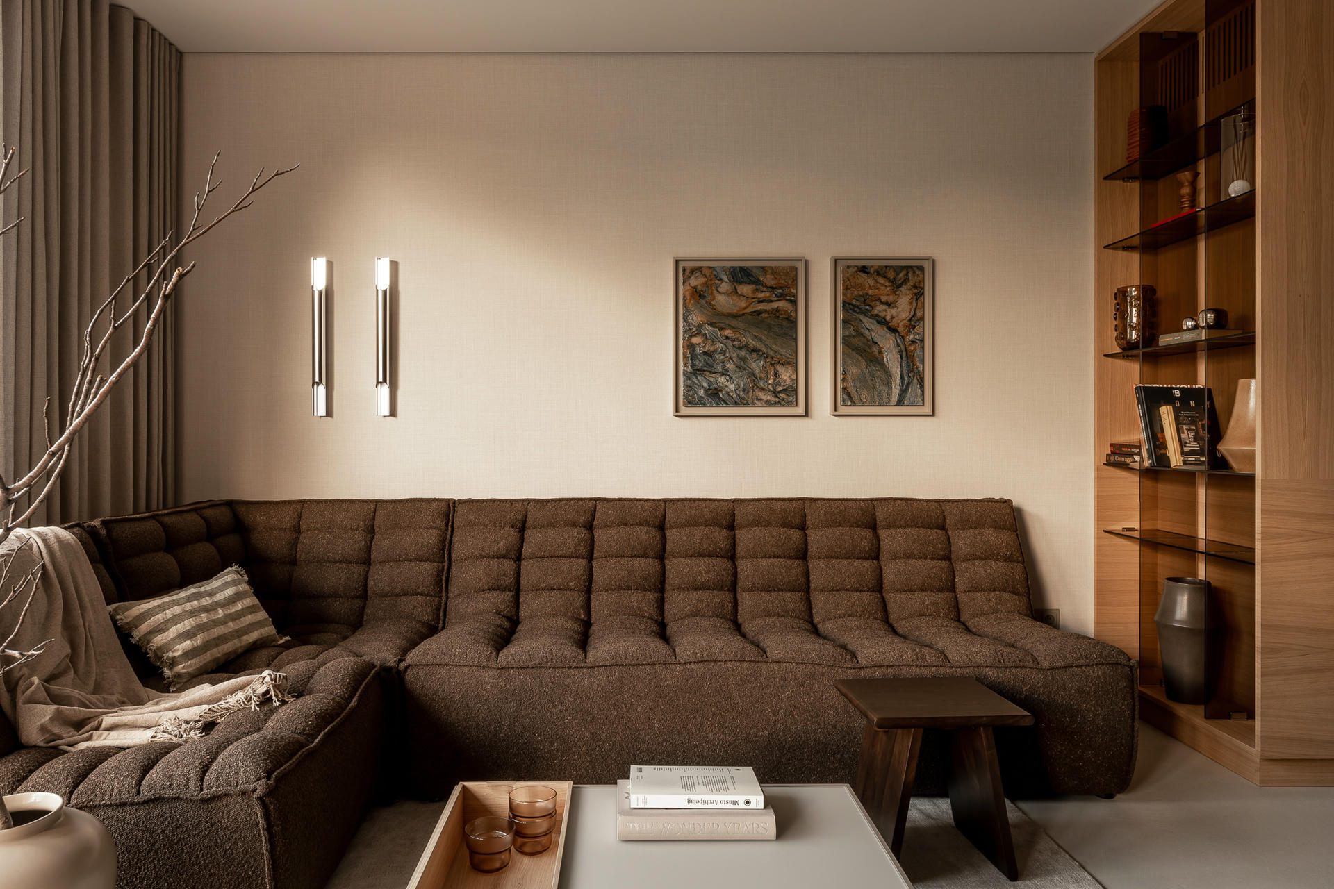 Salon jest spokojny, otwarty i jasny. Modułowa sofa sprzyja odpoczynkowi, a szklane półki obok niej służą nie tylko przechowywaniu, ale też wprowadzają dodatkowe, nastrojowe światło. Nad całością króluje drewniana kratownica sufitowa, a motyw kamienia powraca w formie obrazów na ścianach.
