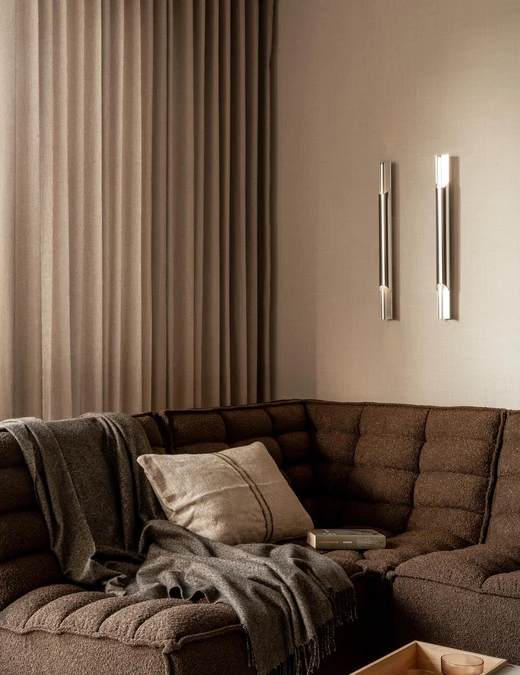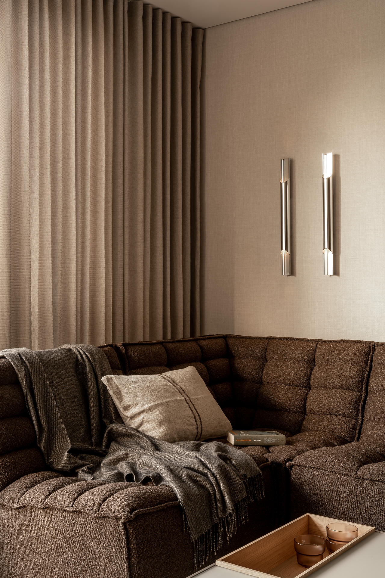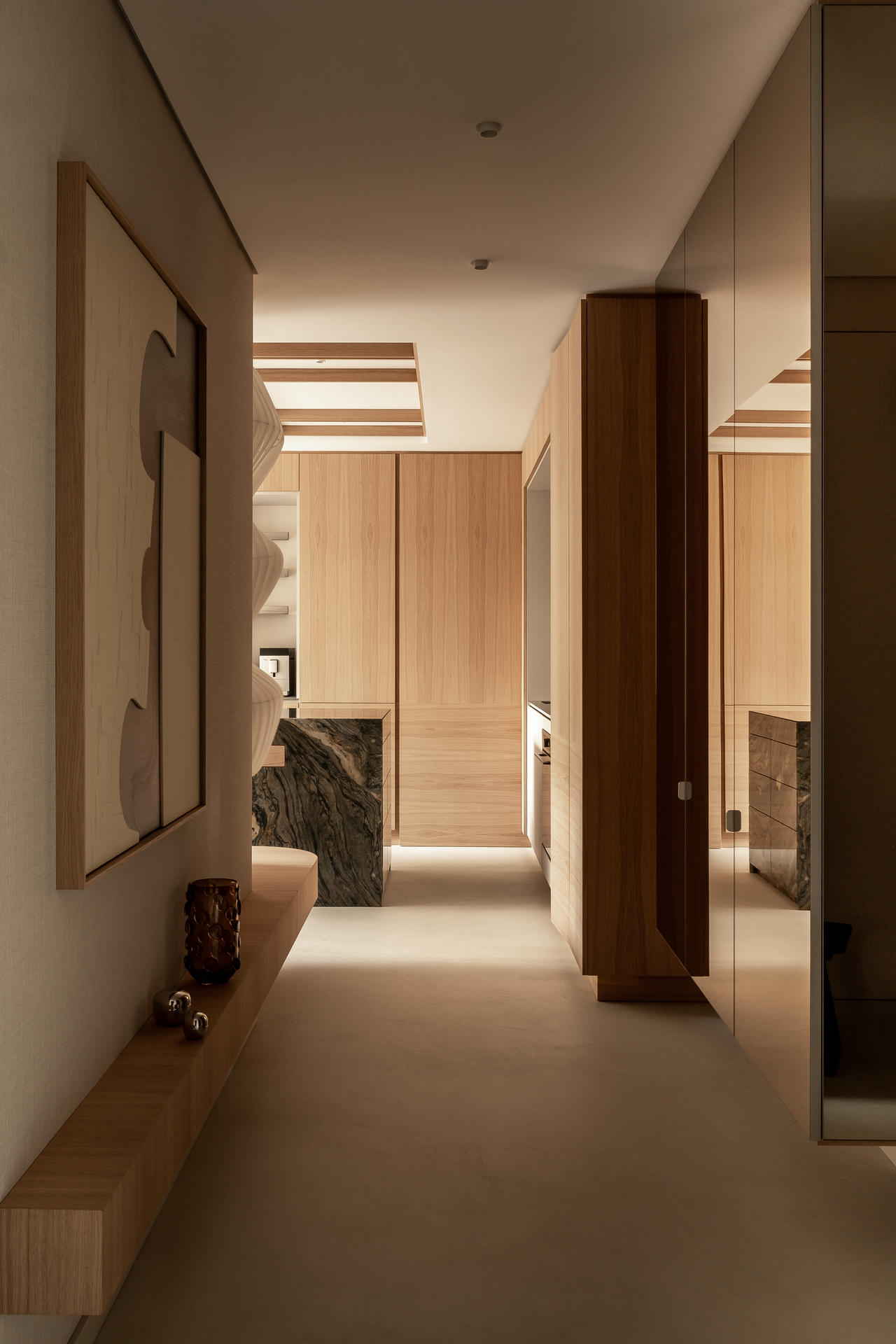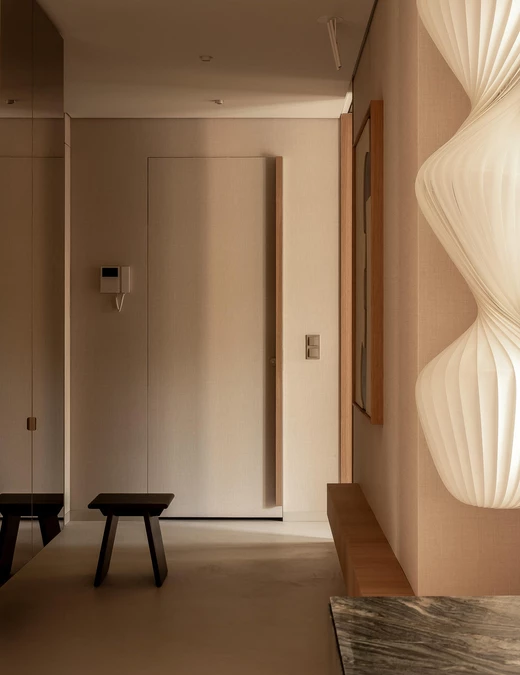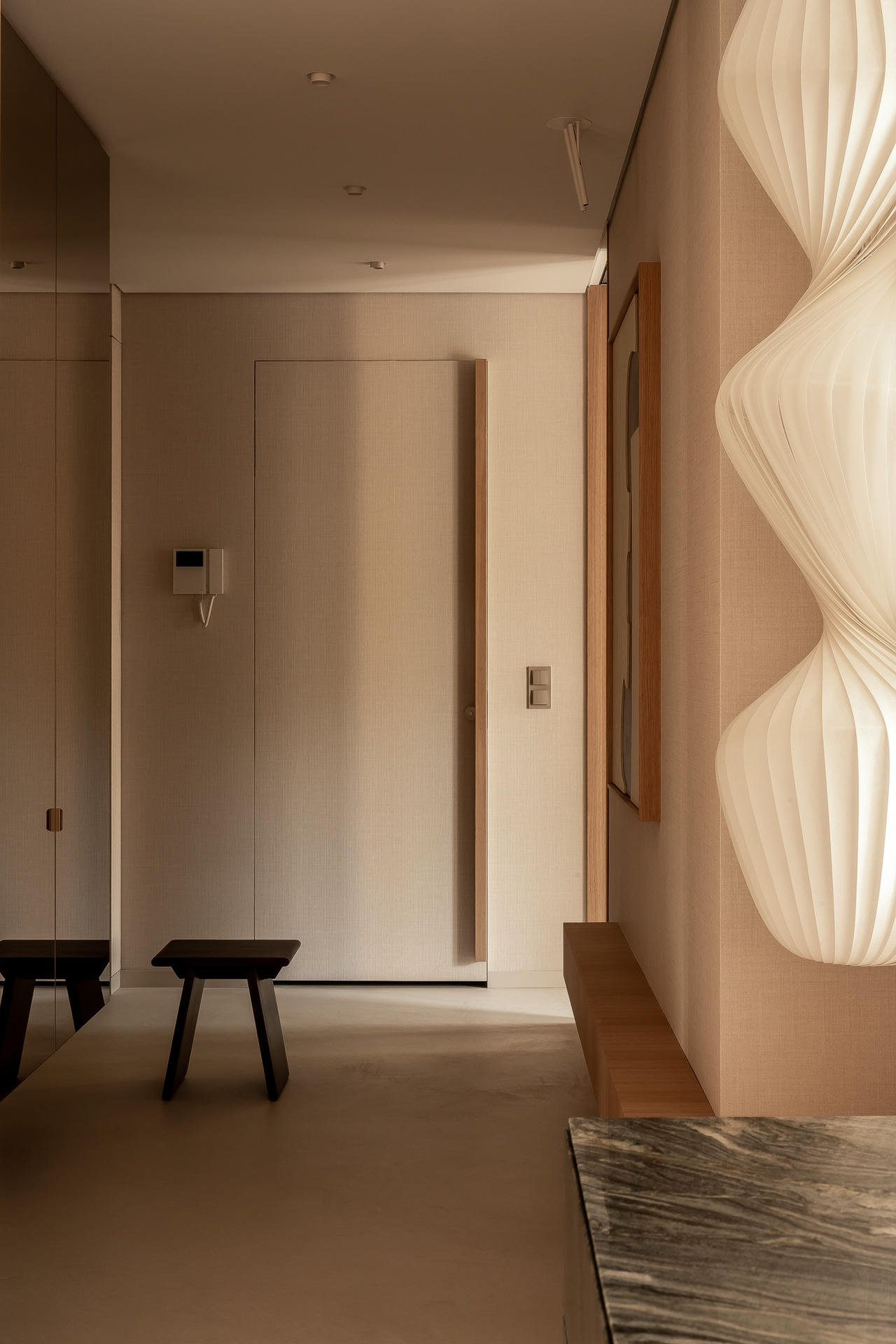 Układ mieszkania podzielono na dwie części: nocną i dzienną. W tej drugiej delikatnie podświetlona półka wisząca prowadzi wzrok w stronę salonu, a uwagę przyciąga totem w postaci lampy Toma Rossau o miękkim kształcie. Sam korytarz zyskał głębię dzięki szafie w dymionym lustrze, a zmienna głębokość zabudów wprowadza rytm i zapobiega monotonii.