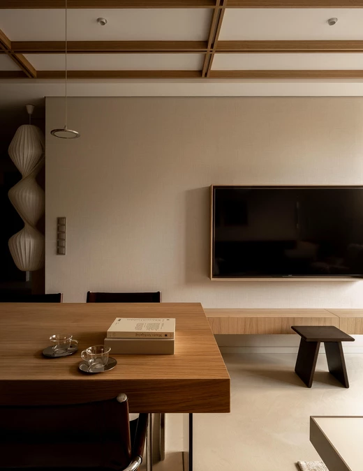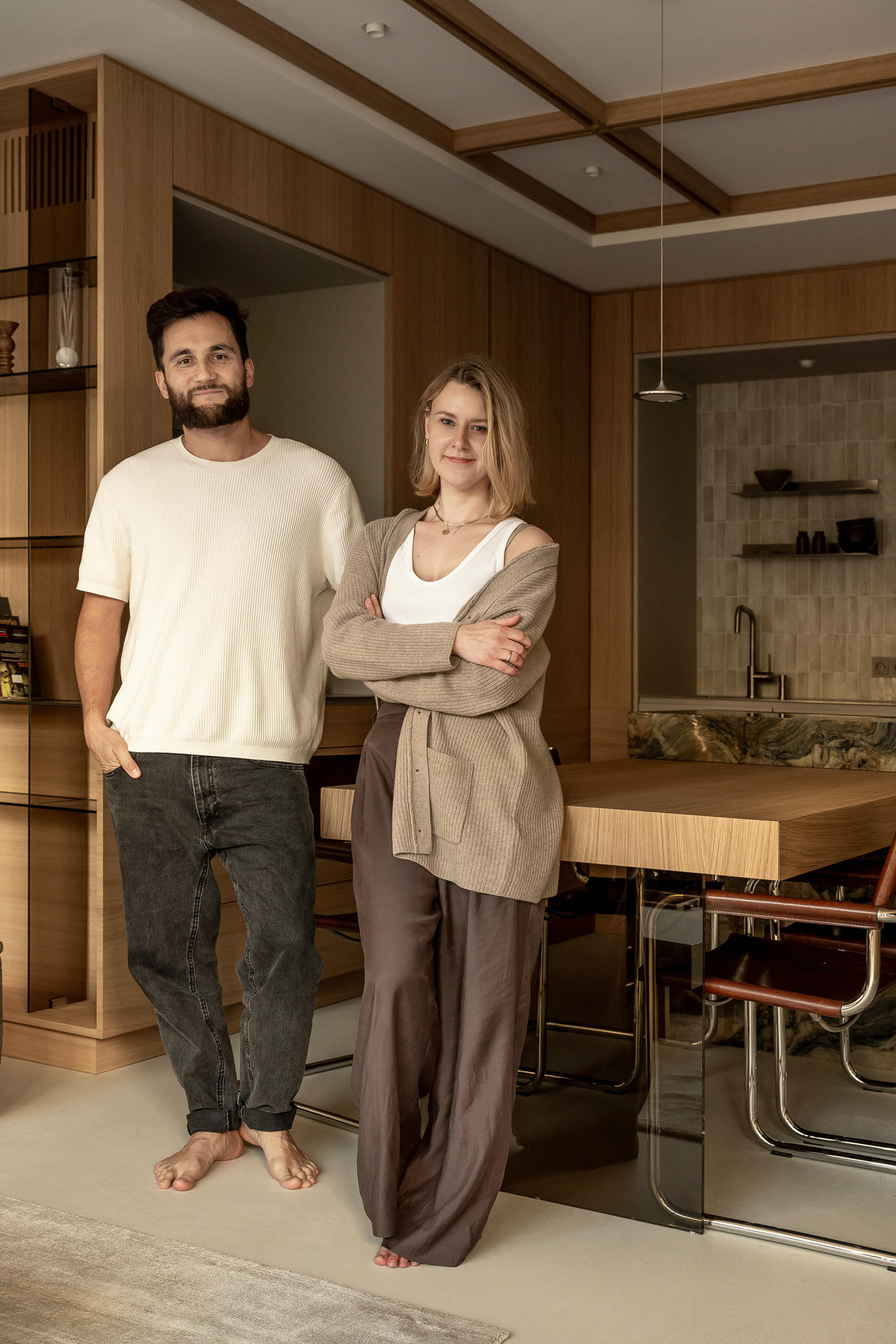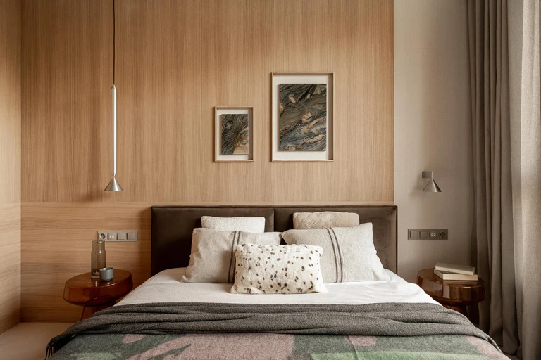 Wnętrze tworzą jasne, ciepłe tonacje. Mikrocement na podłodze i ścianach oraz tapety o strukturze tkaniny budują spokojne tło. Meble z naturalnego, jasnego dębu dopełniają kojącą, sprzyjającą odpoczynkowi przestrzeń.