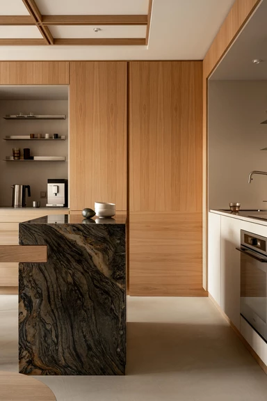 Wspomniany kamień już od progu zaznacza swoją obecność i przyjmuje postać rzeźbiarskiej wyspy kuchennej. Ustawiona centralnie na osi komunikacji przywołuje skojarzenia z obiektem w galerii sztuki i nie pozwala przejść obojętnie.