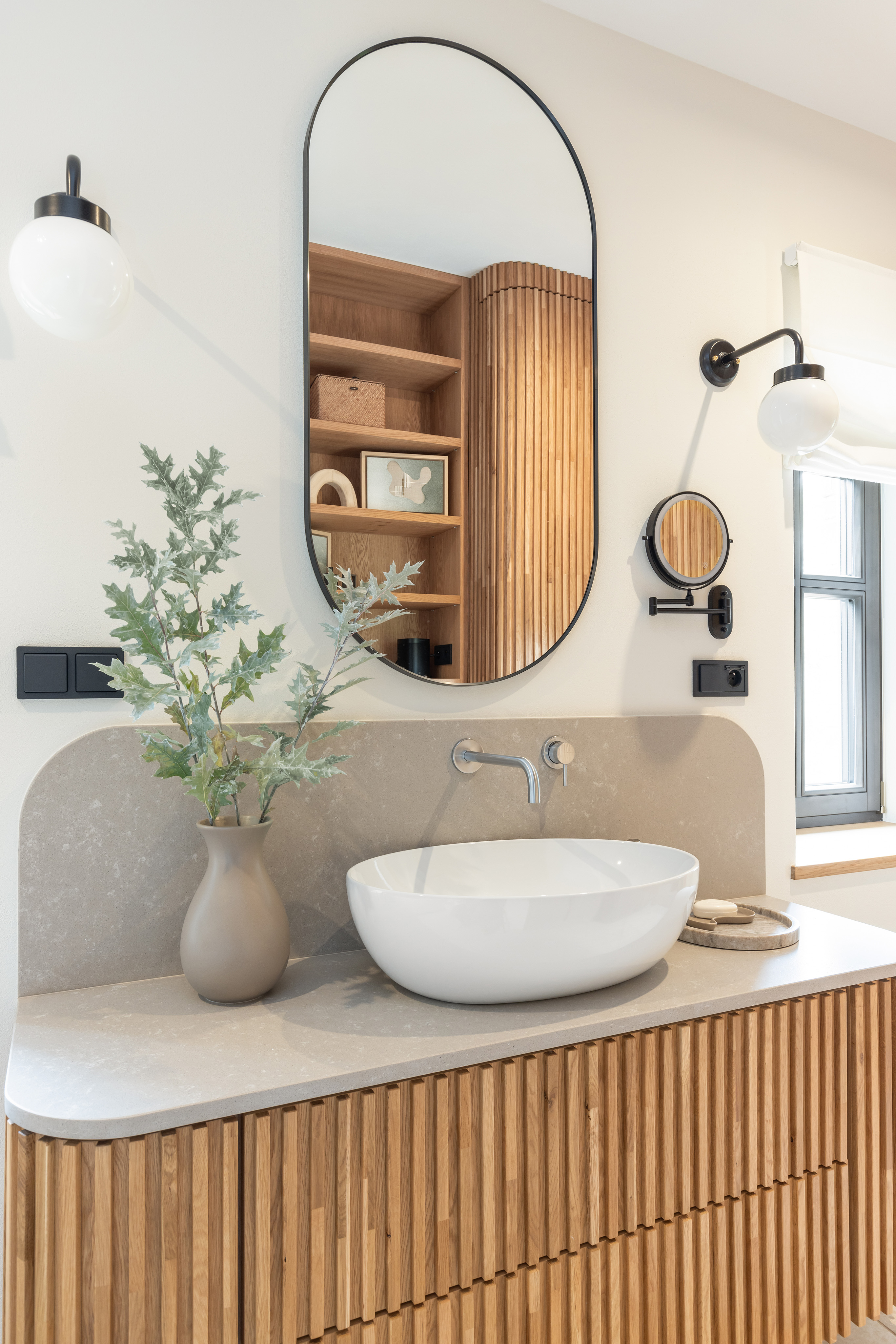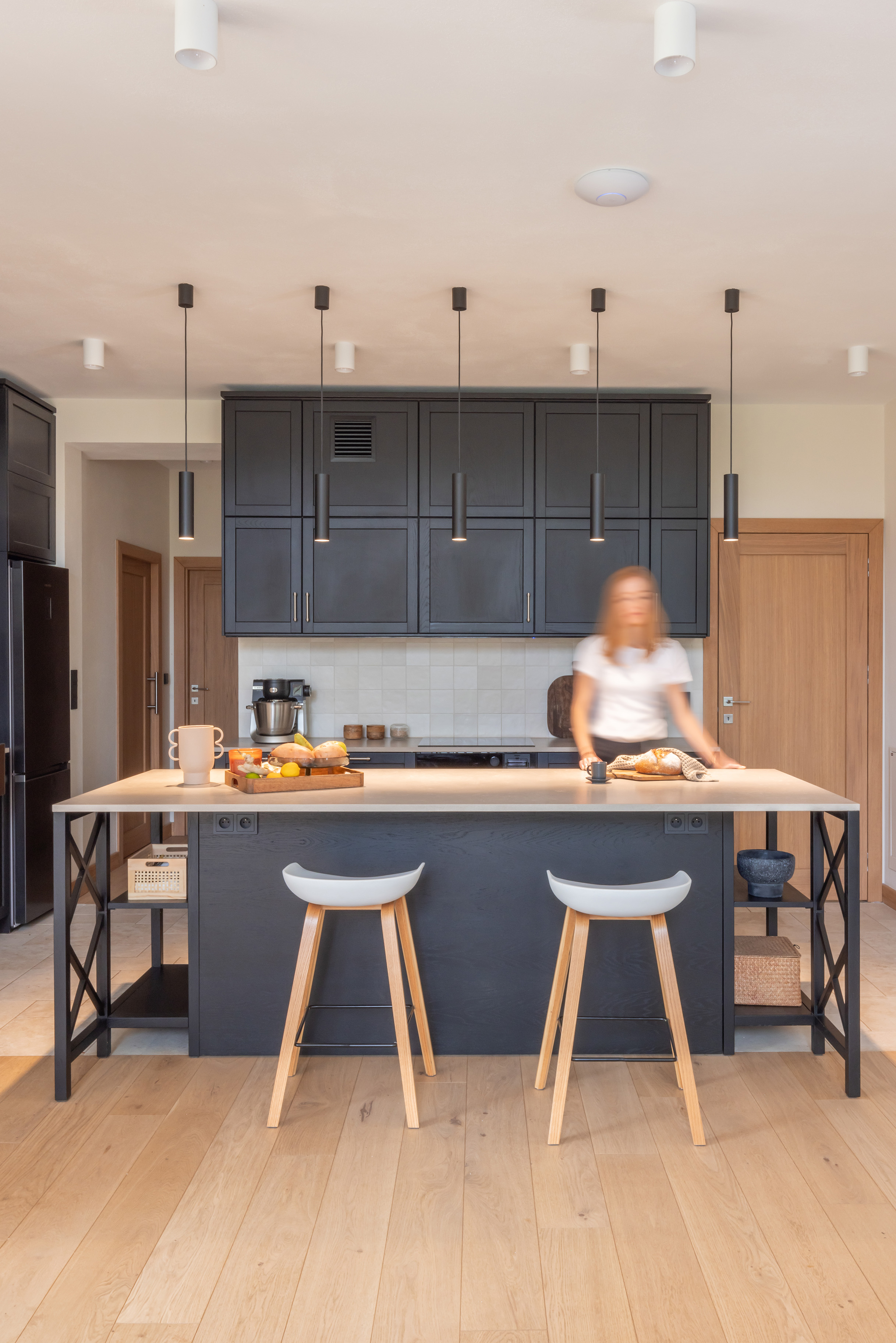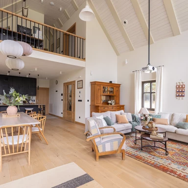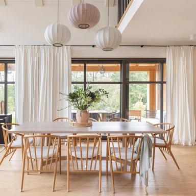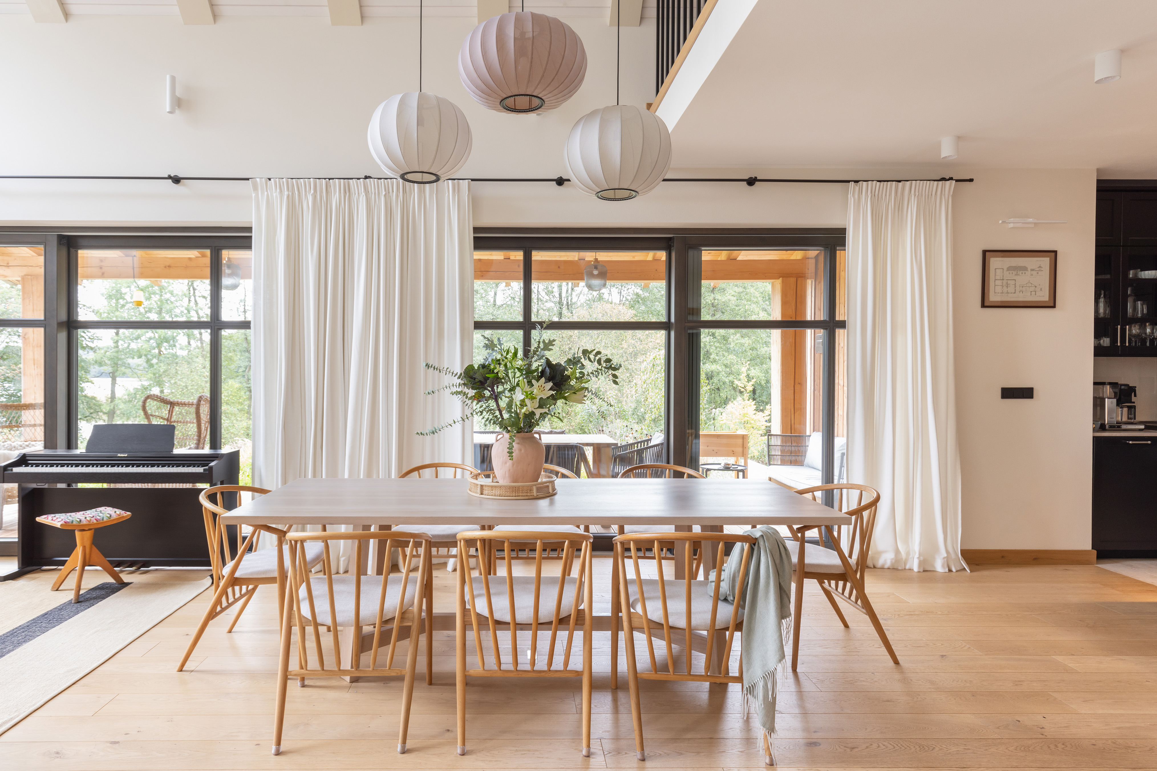 Projektantkom zależało, aby wnętrza nie były „przeprojektowane” – miały pozostać lekkie i gotowe na zmiany. W tym celu wkomponowano w nie również istniejące meble, takie jak antyczny kredens właścicielki, nadając domowi osobisty wymiar. Całość tworzy skromną, niemal niepozorną przestrzeń, która sprzyja byciu blisko natury.