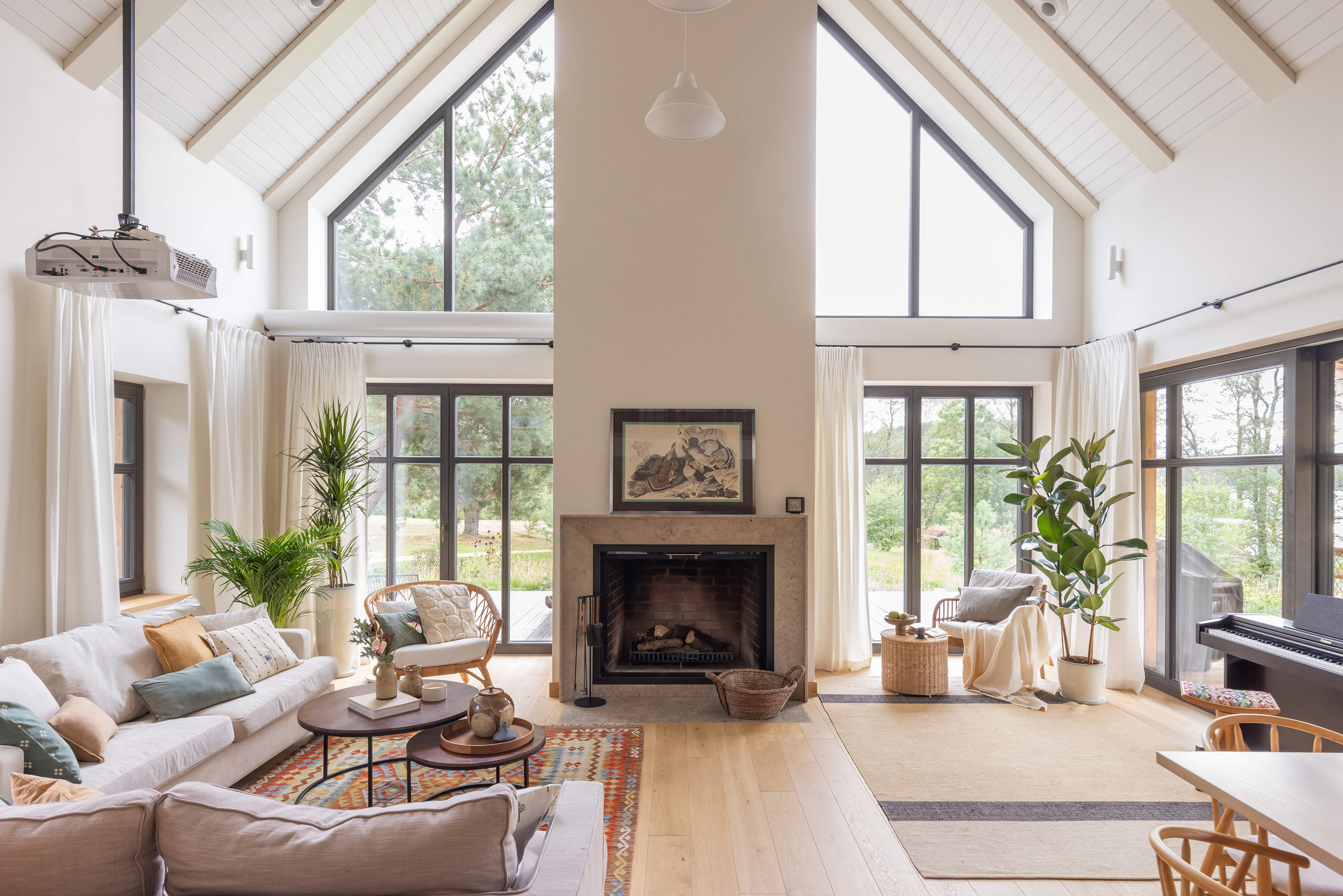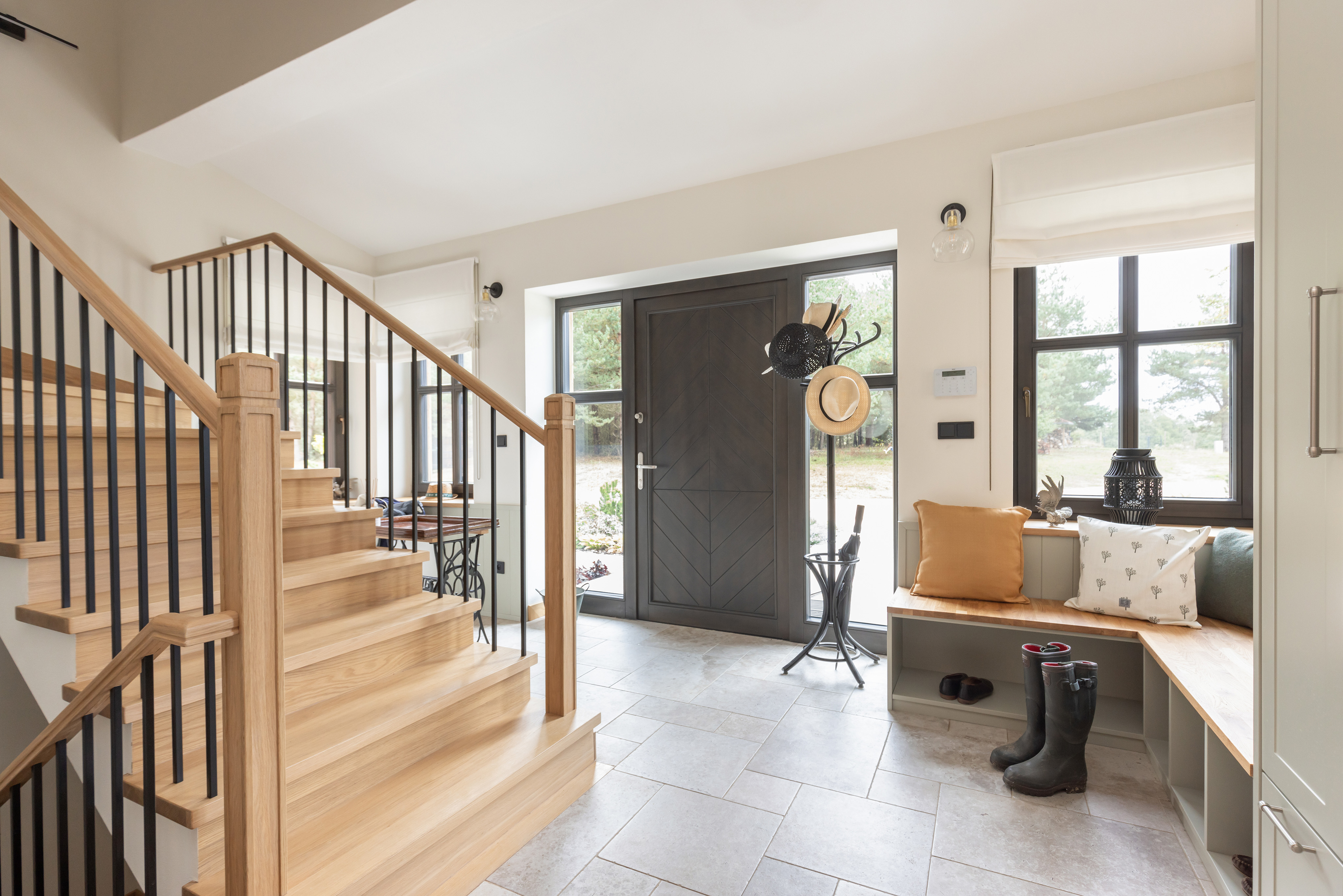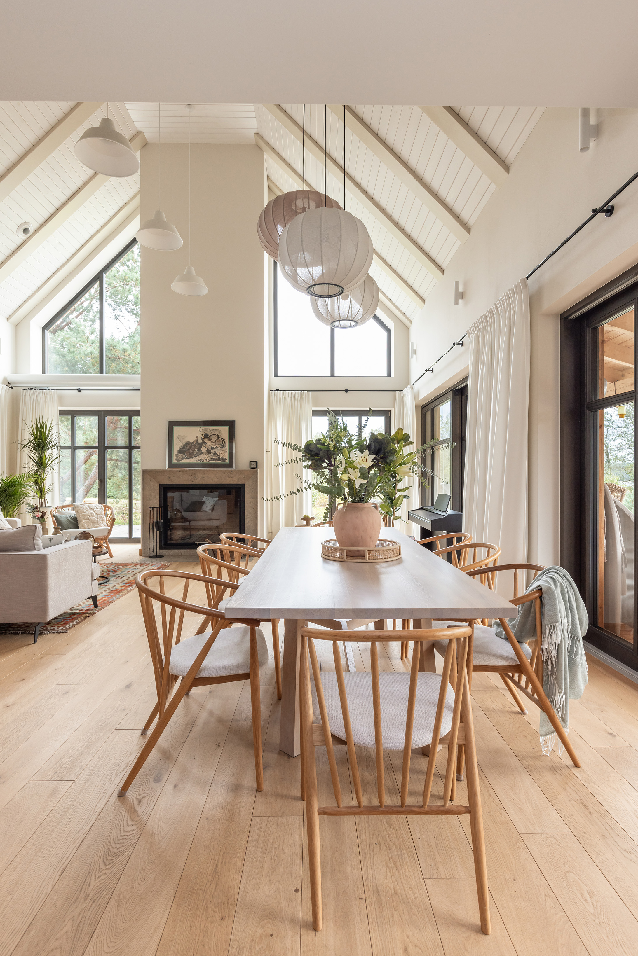 We wnętrzach dominuje dąb; drewno widoczne jest w zabudowach stolarskich i drzwiach, a sufit wykończono dwoma odcieniami farby. Ważnym elementem strefy dziennej jest wykonany na zamówienie kominek z murowaną komorą, wykończony zmatowionym wapieniem jura kalkstein, który podkreśla szlachetny charakter przestrzeni.