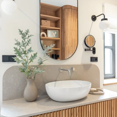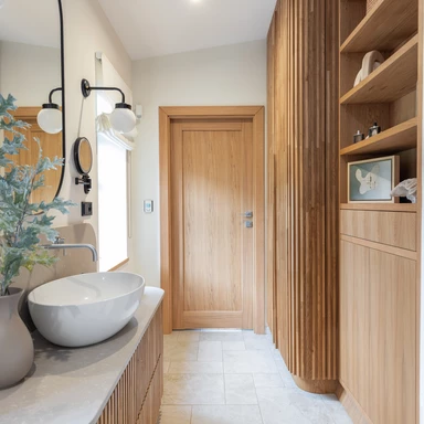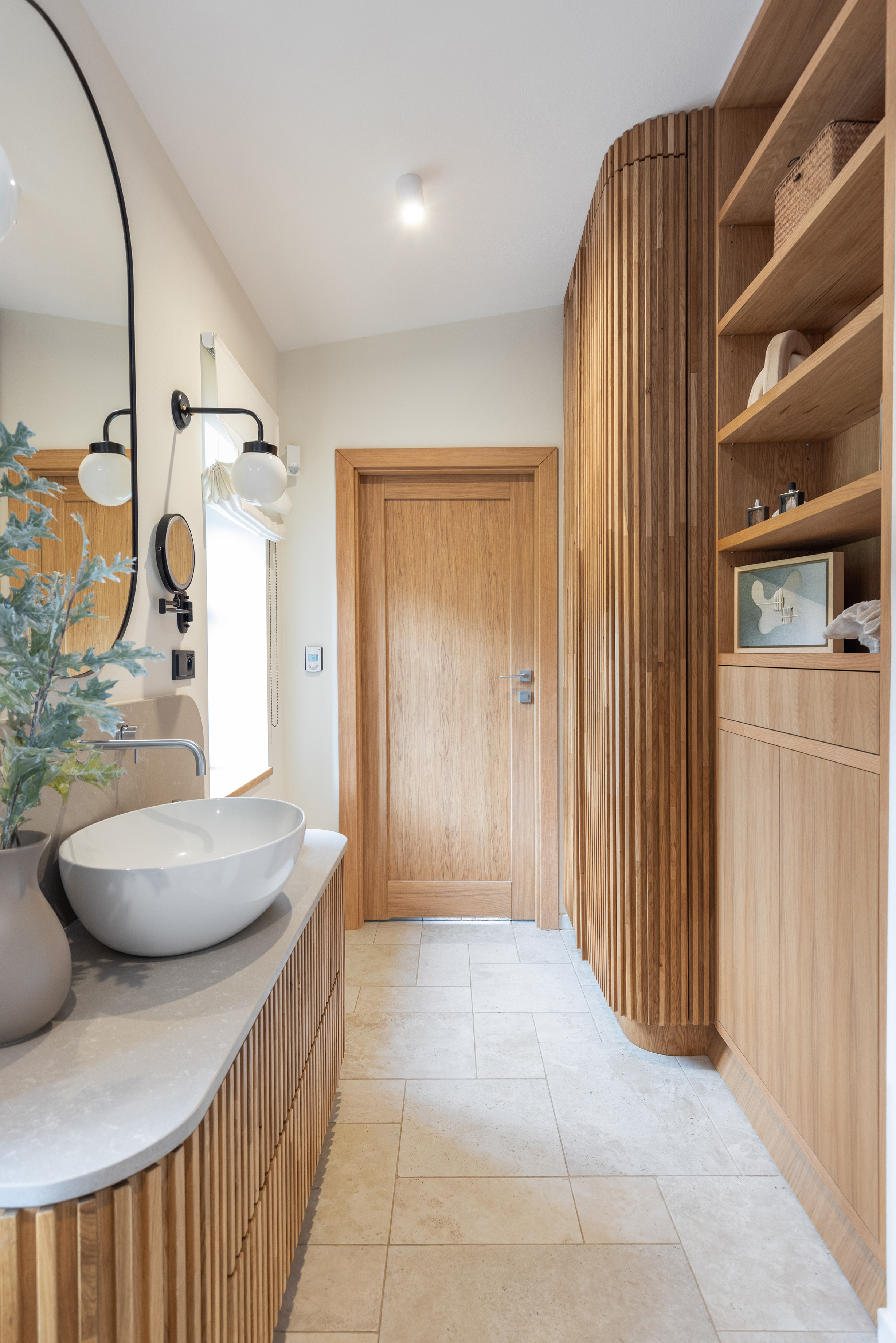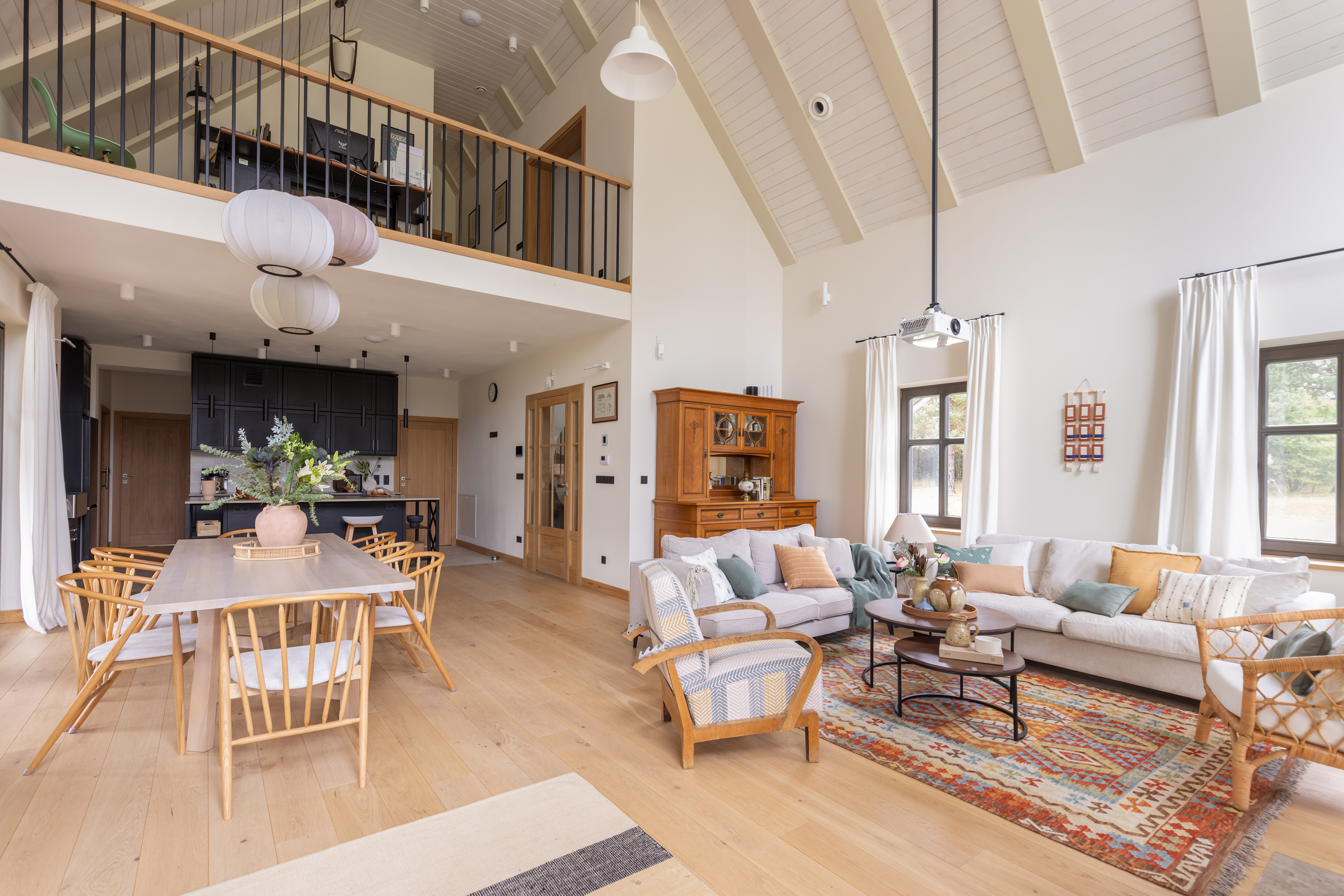 We wnętrzach dominuje dąb; drewno widoczne jest w zabudowach stolarskich i drzwiach, a sufit wykończono dwoma odcieniami farby. Ważnym elementem strefy dziennej jest wykonany na zamówienie kominek z murowaną komorą, wykończony zmatowionym wapieniem jura kalkstein, który podkreśla szlachetny charakter przestrzeni.