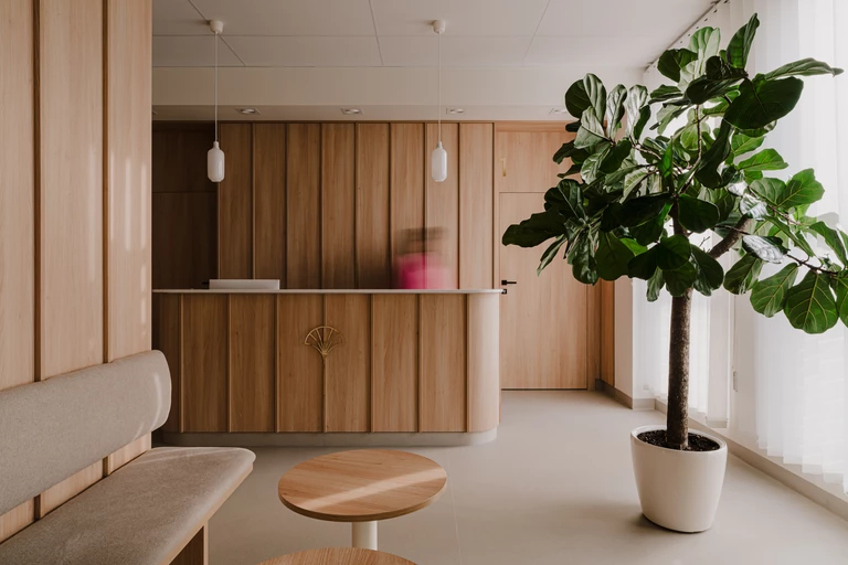 Uwagę we wnętrzu kliniki zwraca subtelny logotyp z roślinnym motywem, inspirowanym liściem miłorzębu japońskiego, za którego projekt odpowiada Wojtek J. Piotrowski. „Genezą loga była synteza połączenia mózgu z rdzeniem kręgowym” – zaznacza autor.