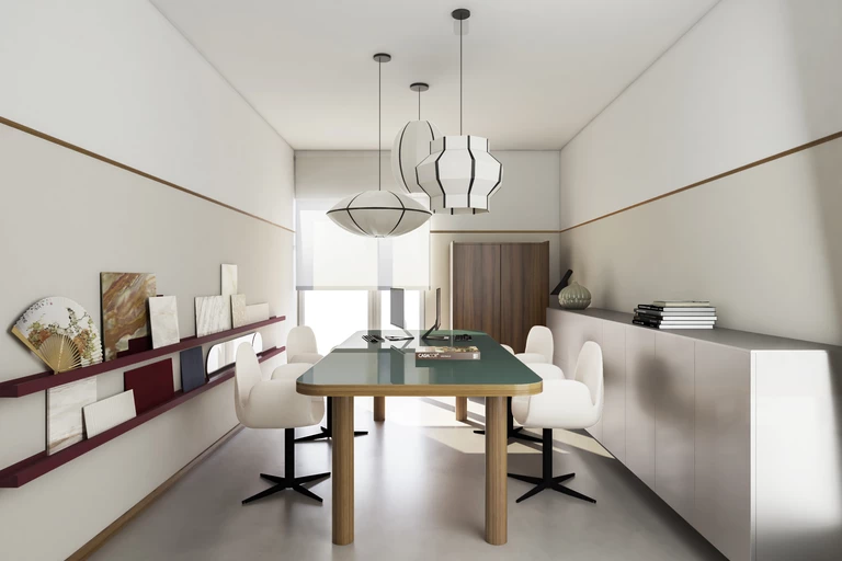 Wnętrze nawiązuje także do japońskiej minimalistyki, poprzez geometrycznego kształty na ścianach przeobrażające się w wielkoformatowe zebry i marmurowe obrazy. Samo biuro to miejsce najbardziej kreatywne. Miejsce tworzenia i spotykania się, gdzie pod materiałowymi kształtami, przy wspólnym stole powstają idee dla nowych projektów.