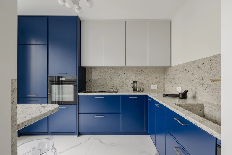 W celu przełamania stonowanej, biało-szarej kolorystyki mieszkania dodano kolorowe akcenty w postaci musztardowej tapicerki krzeseł, granatowej sofy marki Kler i złotych dodatków. W mieszkaniu przyłożono ogromną wagę do najdrobniejszych detali, od mosiężnych uchwytów meblowych od polskiej marki Pap Deco, przez ręcznie malowane lustro z efektem postarzenia przy drzwiach wejściowych.