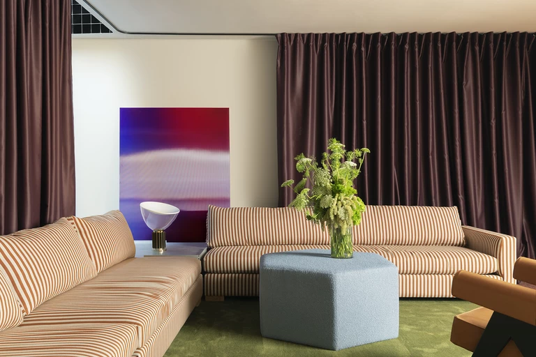 „Strefa towarzyska, znajdująca się w drugim skrzydle domu, musiała być funkcjonalna i trwała. Dlatego zdecydowaliśmy się na winylowe podłogi IQ Surface projektu Note Design” – tłumaczą Ana i Enrique. We wnętrzu główne skrzypce grają bordowe zasłony, z którym koresponduje miękki dywan w kolorze trawy.