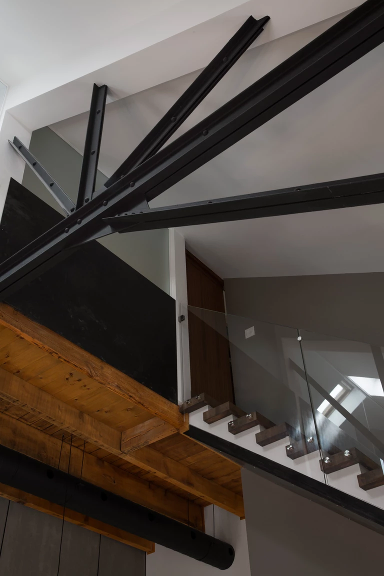 Antresola stała się prywatną enklawą rodziców, mieszczącą główną sypialnię oraz strefę wypoczynku z kominkiem i telewizorem, doświetloną przez okno dachowe. Przeszklone ściany - wykonane ze szkła przezroczystego i satynowego - izolują to miejsce od domowego zgiełku, zachowując jednocześnie kontakt wizualny z resztą mieszkania i dostęp do naturalnego światła. Szczególnym detalem jest przejście do łazienki rodziców pod skosami dachu, które prowadzi dosłownie przez stalową kratownicę konstrukcyjną. Poniżej, na głównym poziomie, pokoje dzieci zyskały własne, nowoczesne łazienki.