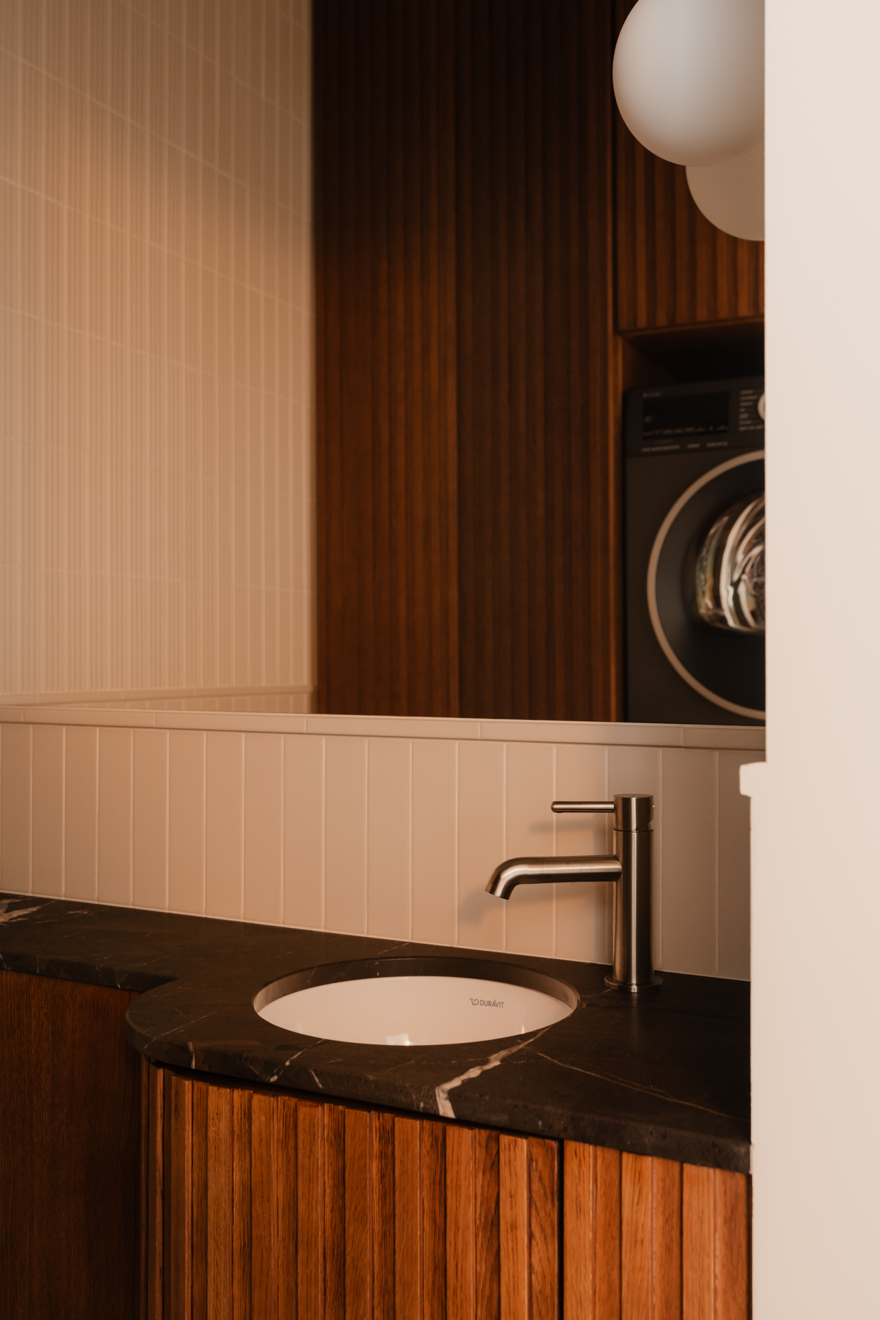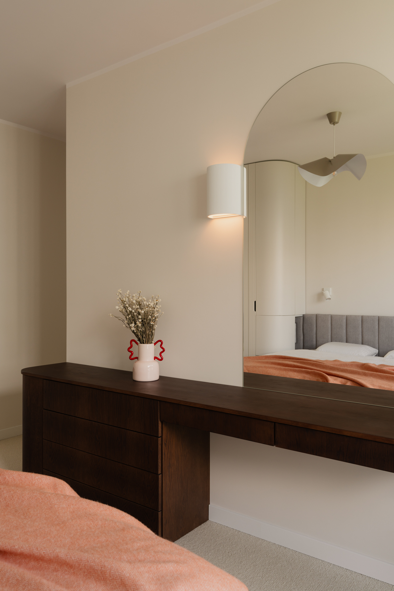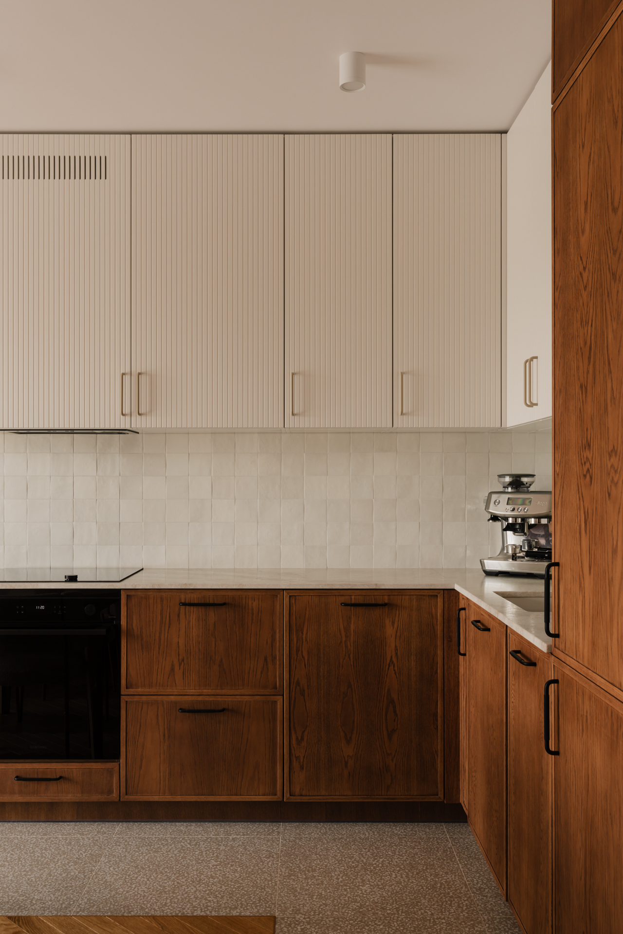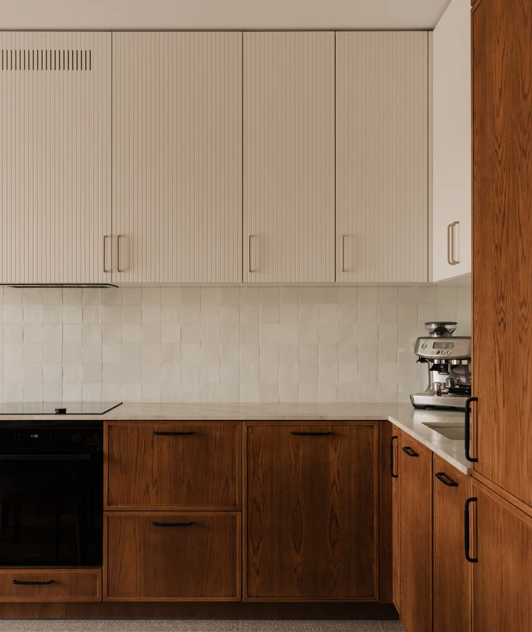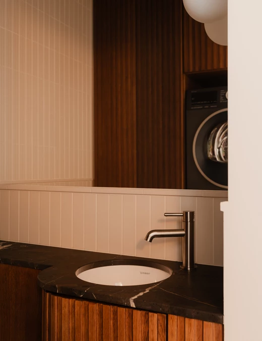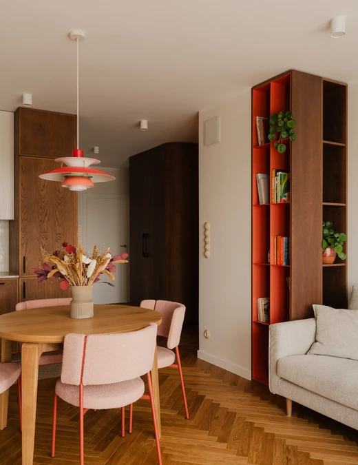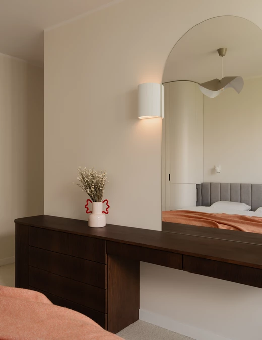 W kuchni jego głęboki odcień przełamuje kamienny blat z kwarcytu Taj Mahal, wprowadzający subtelny, świetlisty akcent. Kompozycję łagodzą jasne, ryflowane fronty górnych szafek. Stonowaną bazę ożywiają delikatne akcenty kolorystyczne – zgaszony róż, pomarańcz i zieleń – które regularnie powtarzają się w całym mieszkaniu.
