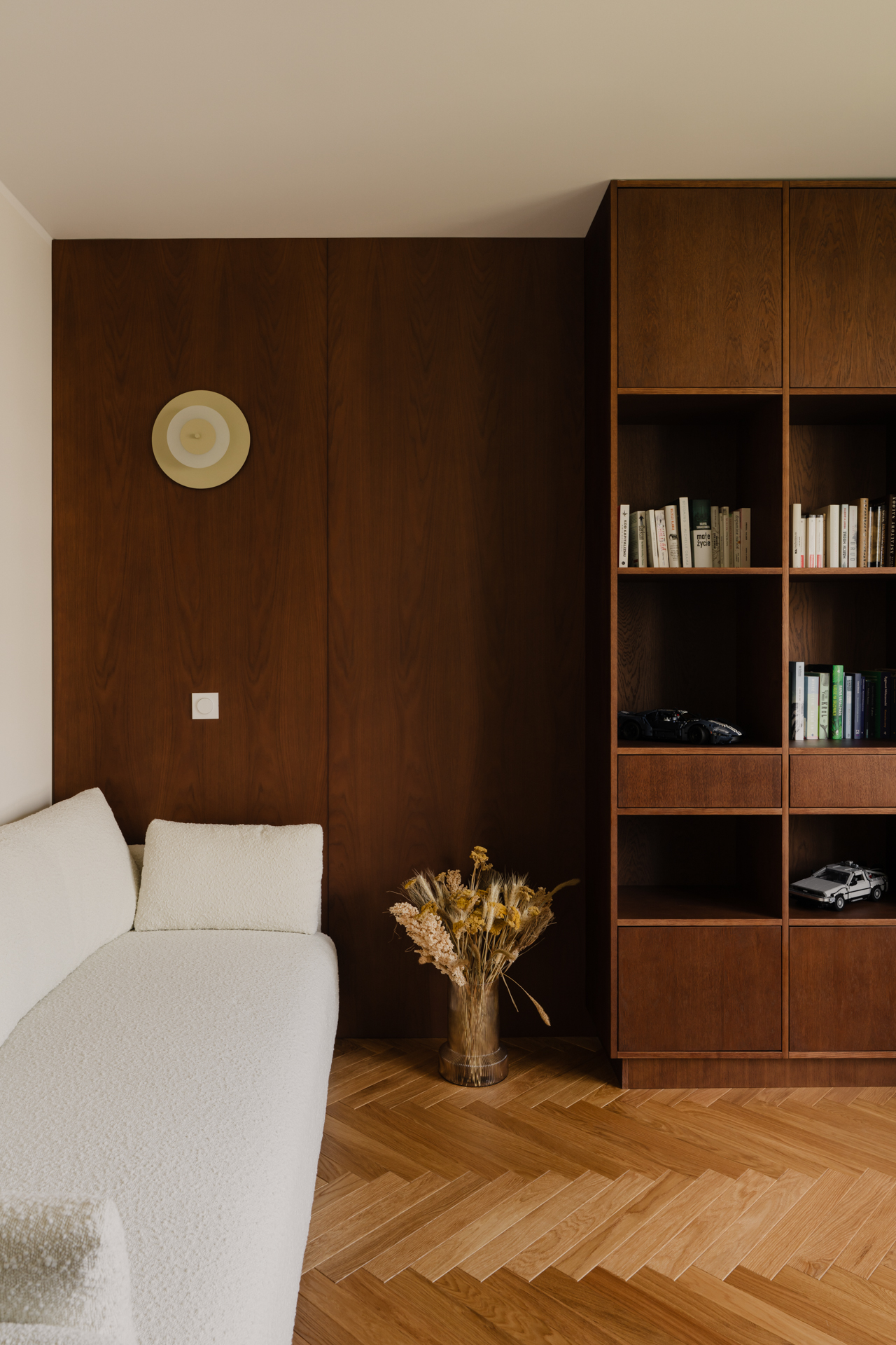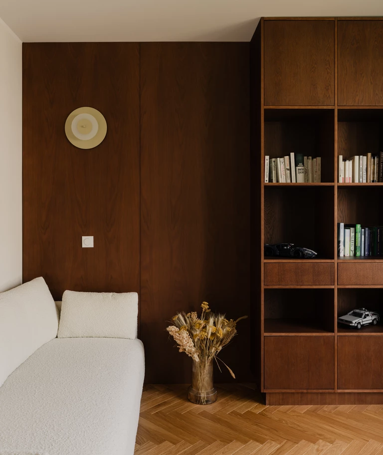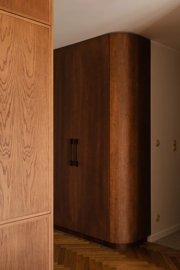 O charakterze wnętrza decyduje konsekwentnie prowadzona paleta barw i materiałów. Ciemne drewno o jednolitym wybarwieniu pojawia się we wszystkich pomieszczeniach – od zabudowy kuchennej, przez szafy, aż po panele ścienne, nadając całości spójność i ciepło.