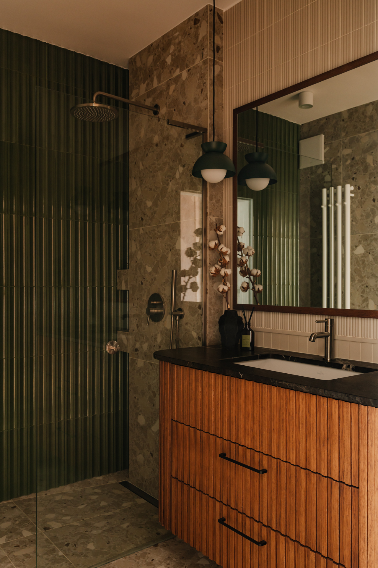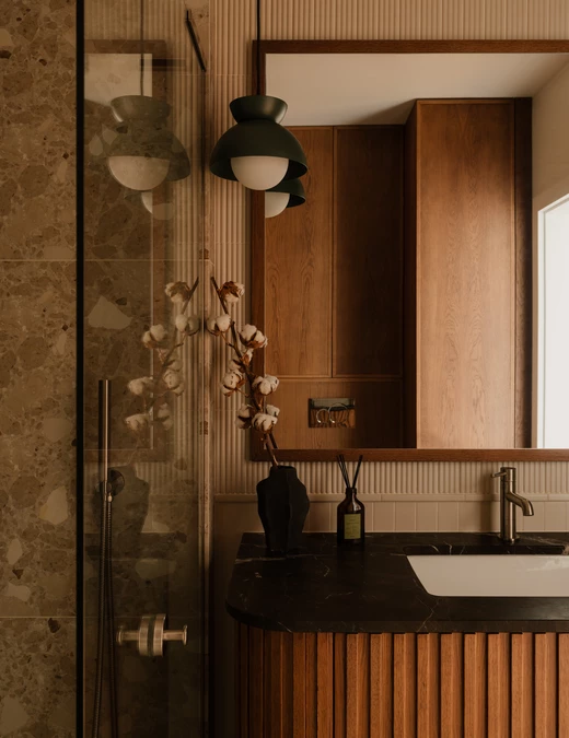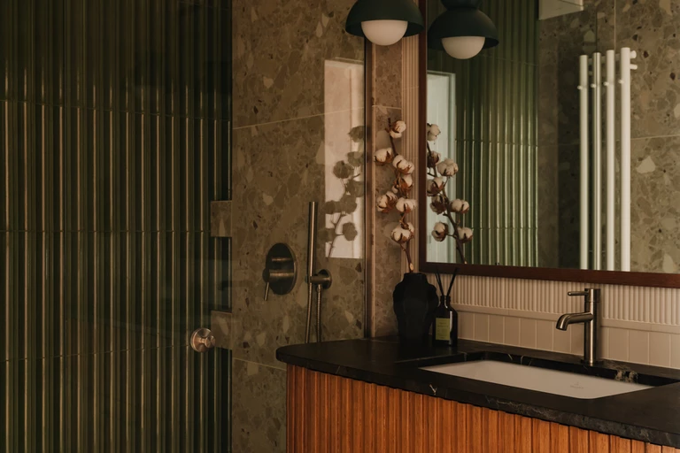 Spójność materiałowa jest kontynuowana w dwóch łazienkach, utrzymanych w tej samej, naturalnej tonacji. Ściany wykończono płytkami Equipe Costa Beige w wersji gładkiej oraz ryflowanej, co wprowadza do wnętrza subtelny rytm i grę światła. W strefie prysznica zastosowano natomiast zielone płytki Natucer Green, które tworzą wyrazisty, lecz harmonijny kontrapunkt dla drewna i beżu