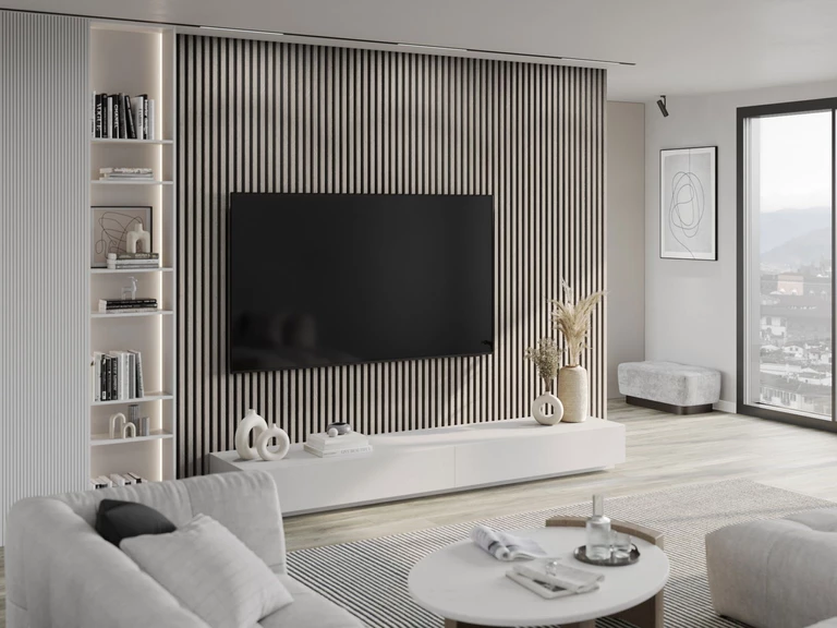 Filc wydaje się „cieplejszy”, bardziej domowy. W odróżnieniu od lameli na płycie — nie odbija światła mocno, dzięki czemu tworzy przyjemniejszy klimat. Filc łatwo dopasuje się do nierówności ściany. Docięcie panelu to kwestia ostrego noża lub nożyka tapicerskiego. Lamele na filcu w dużych, wysokich wnętrzach wyglądają bardziej miękko i naturalnie.