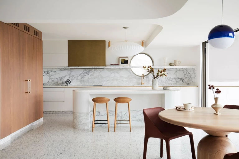 W kuchni zachwyca duża powierzchnia ściany wykończona marmurem Calacatta. Zabudowę szafek dolnych wykonano z białej płyty meblowej, główną szafę zaś z drewna dębowego. Warto zwrócić uwagę na rzeźbiarskie hokery BAR marki Great Dane i lampę “Saucer Bubble” projektu Georga Nelsona wiszącą nad wyspą.