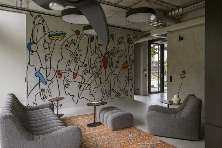 Obok nich szeroka i wysoka na niespełna 3,5m ściana pokryta mikrocementem została oddana w ręce muralistki, Moniki Prus. Plątanina czarnych strukturalnych linii z mocnymi plamami koloru, tworzy nieoczywiste, dynamiczne sylwetki postaci. Mamy wrażenie burzy mózgów, bez której nie istnieje praca twórcza, tak obecna w kreatywnej branży, jaką jest działalność OTO Film.
