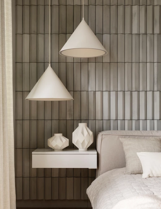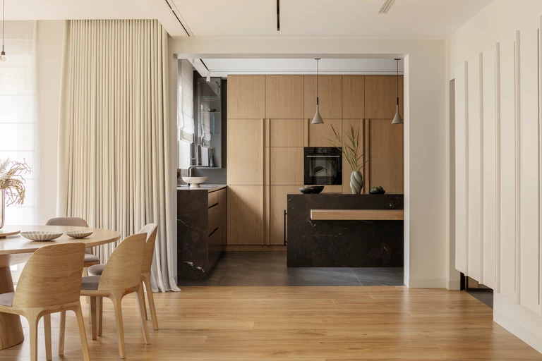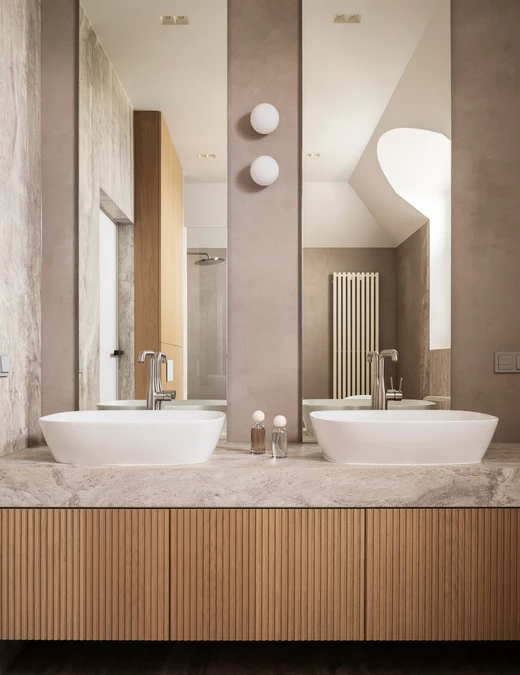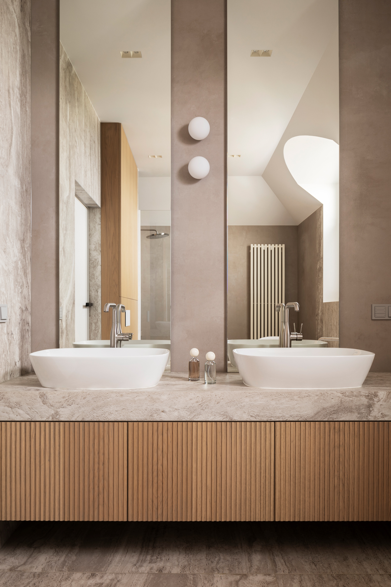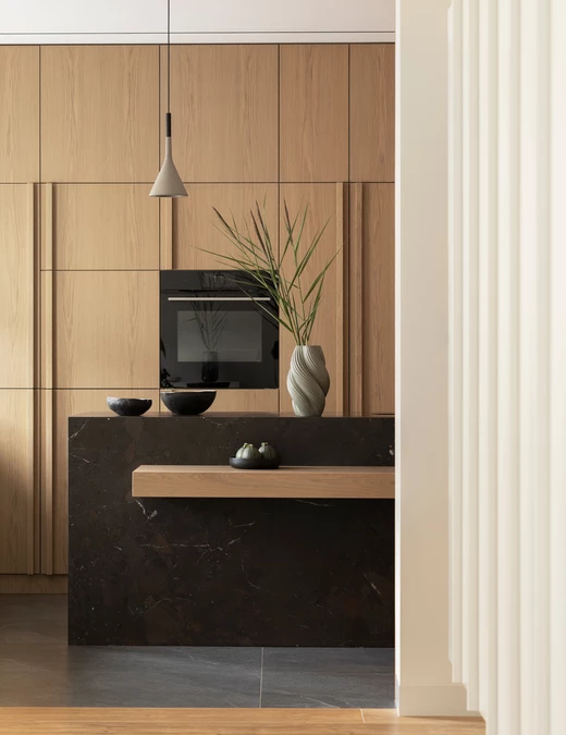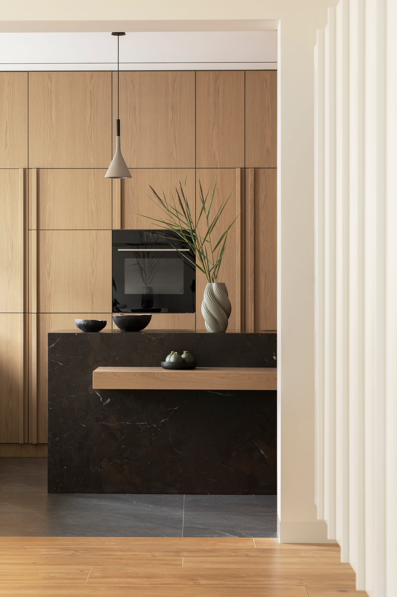 Projektanci postawili na tekstury i detale, by dodać wnętrzu głębi: pionowe lamele, ryflowane fronty i organiczne kształty przełamują prostotę form, wnosząc subtelne ciepło.