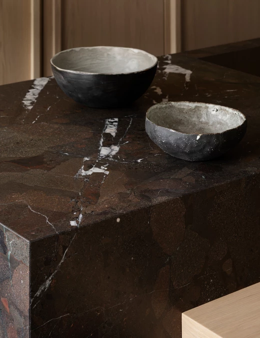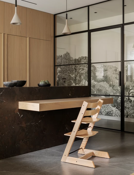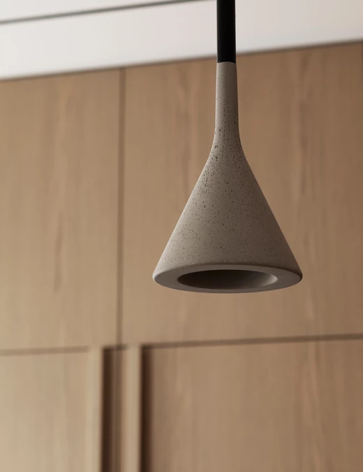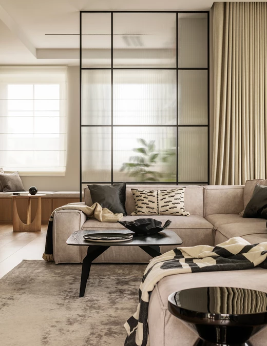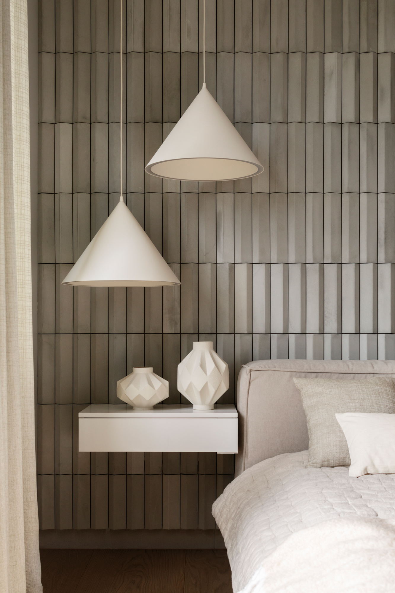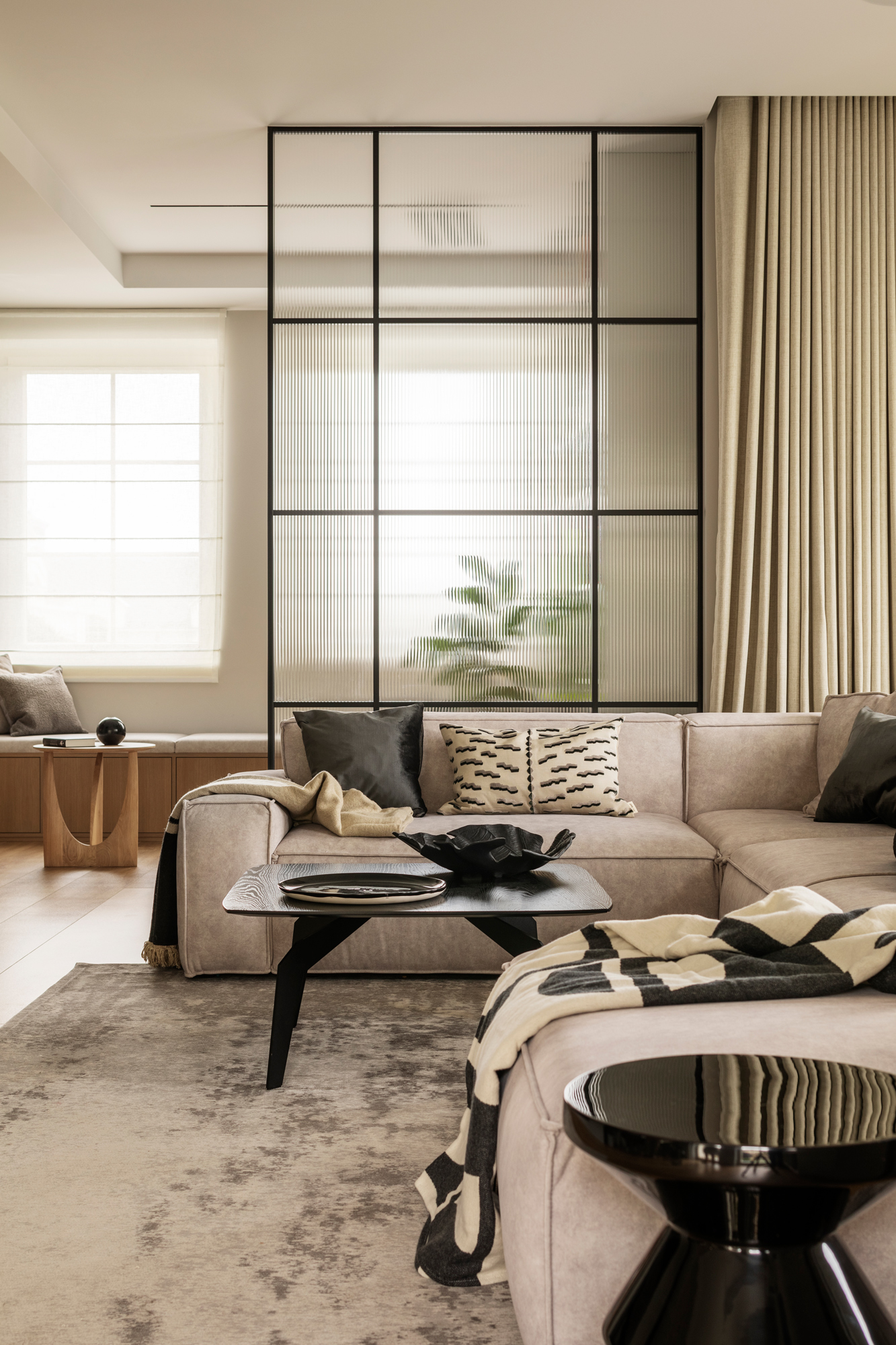 Projektanci postawili na tekstury i detale, by dodać wnętrzu głębi: pionowe lamele, ryflowane fronty i organiczne kształty przełamują prostotę form, wnosząc subtelne ciepło.