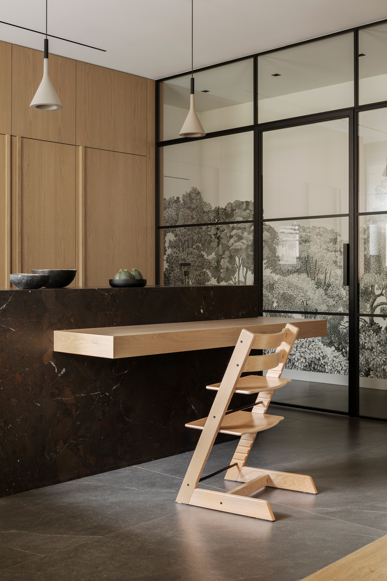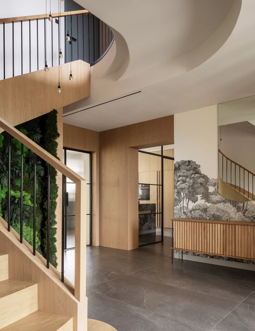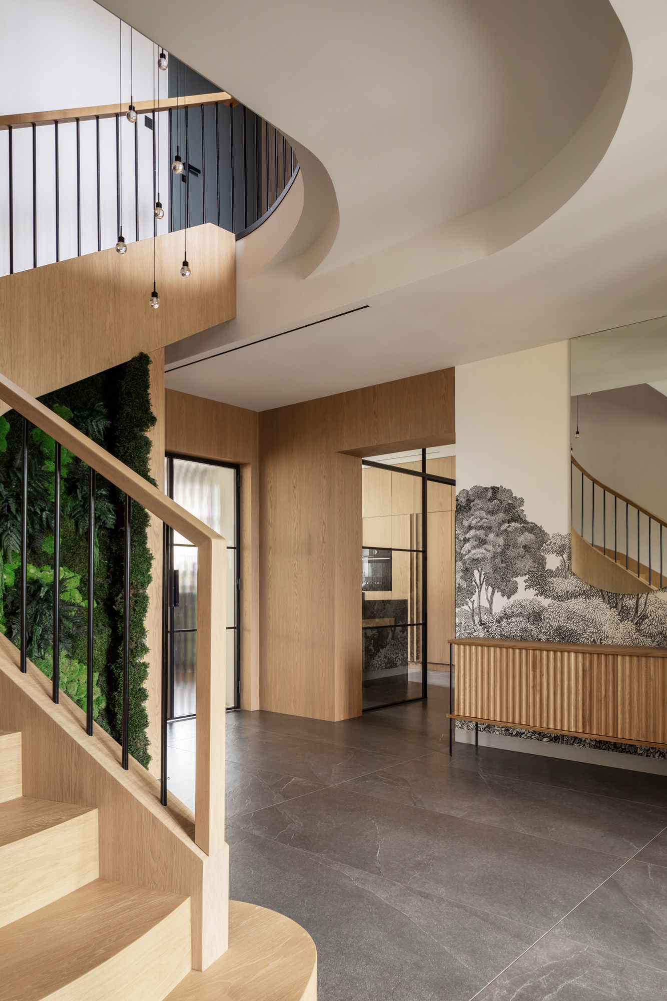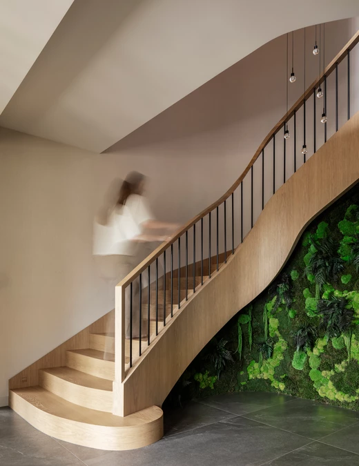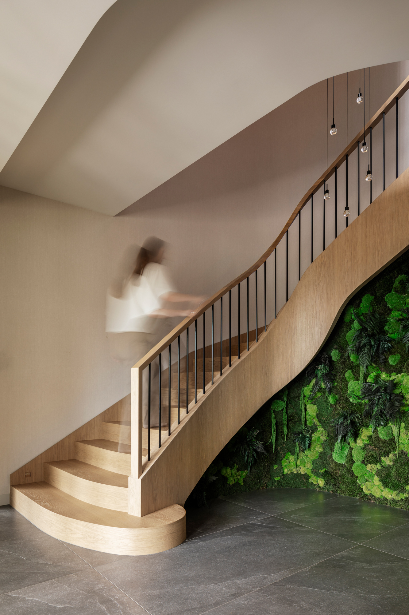 Centralnym punktem mieszkania jest kręta klatka schodowa – rzeźbiarska forma, która przyciąga wzrok i nadaje wnętrzu lekkości. Jej dopełnieniem jest żywa ściana z mchu, wprowadzająca dosłownie fragment natury do strefy dziennej.