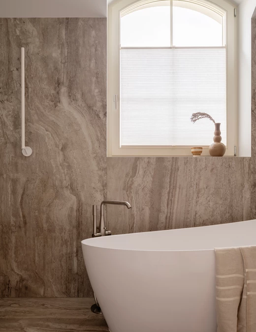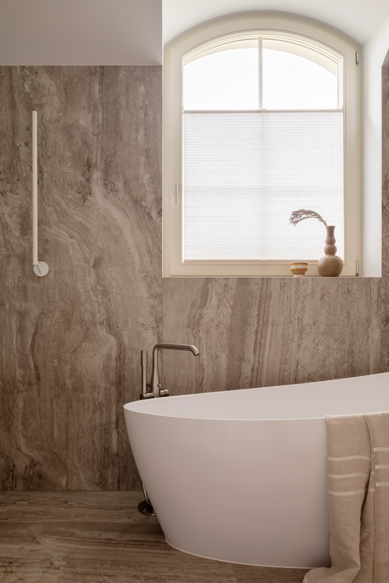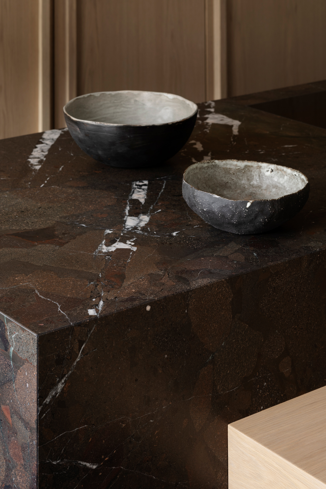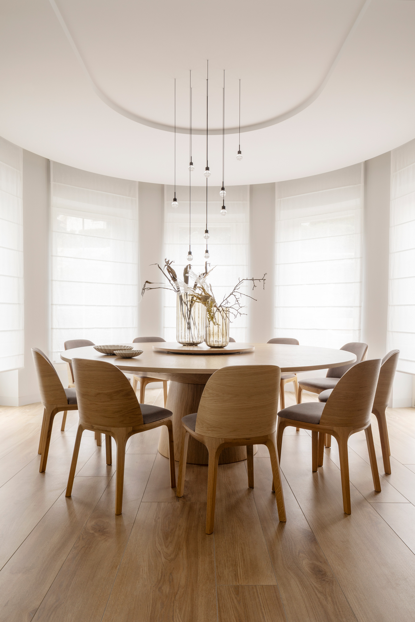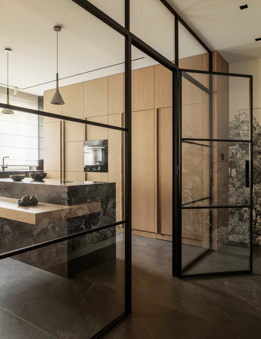 Wnętrze opiera się na ograniczonej, ale wyrafinowanej palecie barw i faktur. Dominują tu ciepłe odcienie drewna, surowy kamień, szkło i miękkie tkaniny o naturalnych splotach.