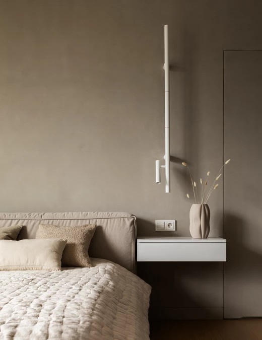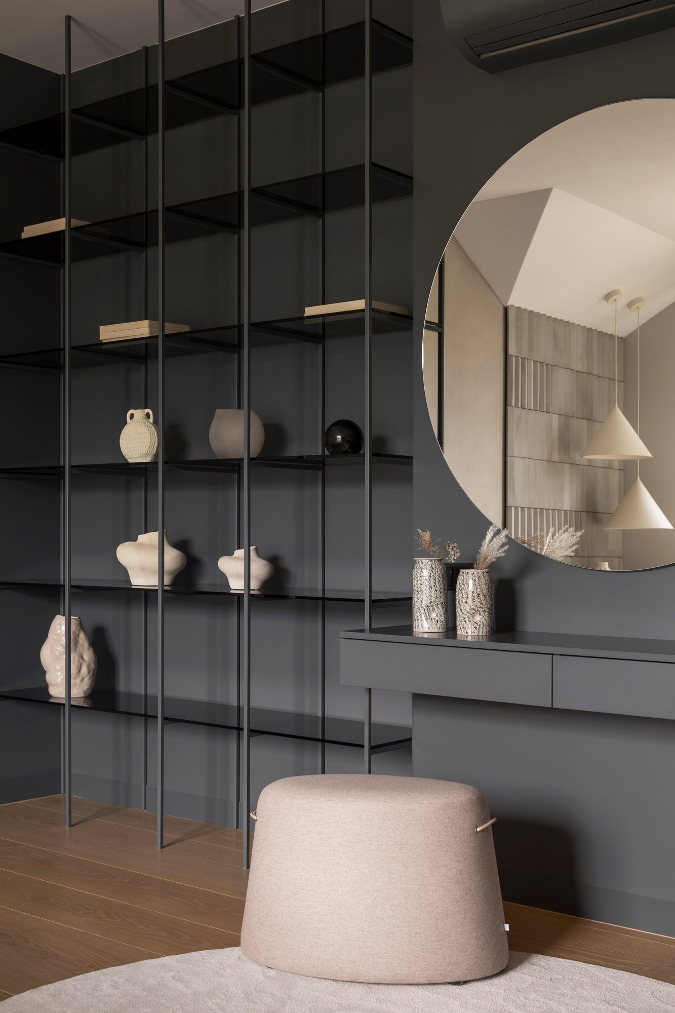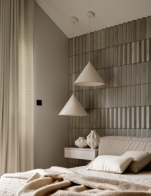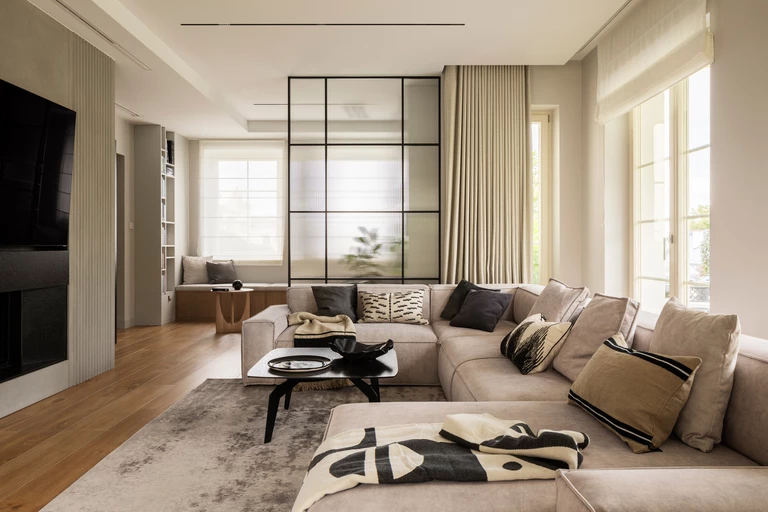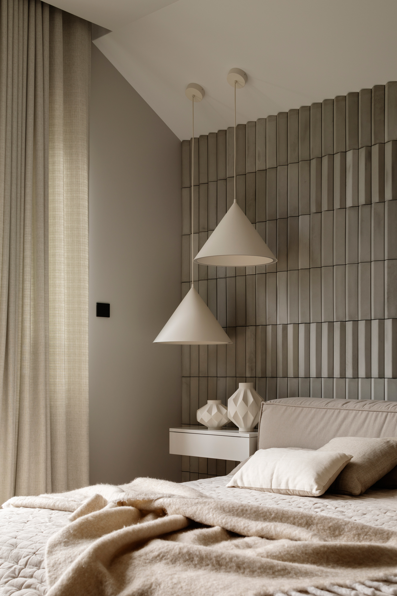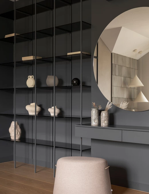Neutralna baza – beże i szarości – została przełamana grafitowymi i czarnymi detalami, które nadają przestrzeni charakteru. Taki dobór materiałów pozwolił zachować równowagę między eleganckim minimalizmem a przytulnością.