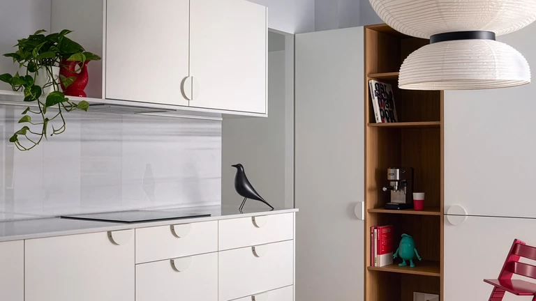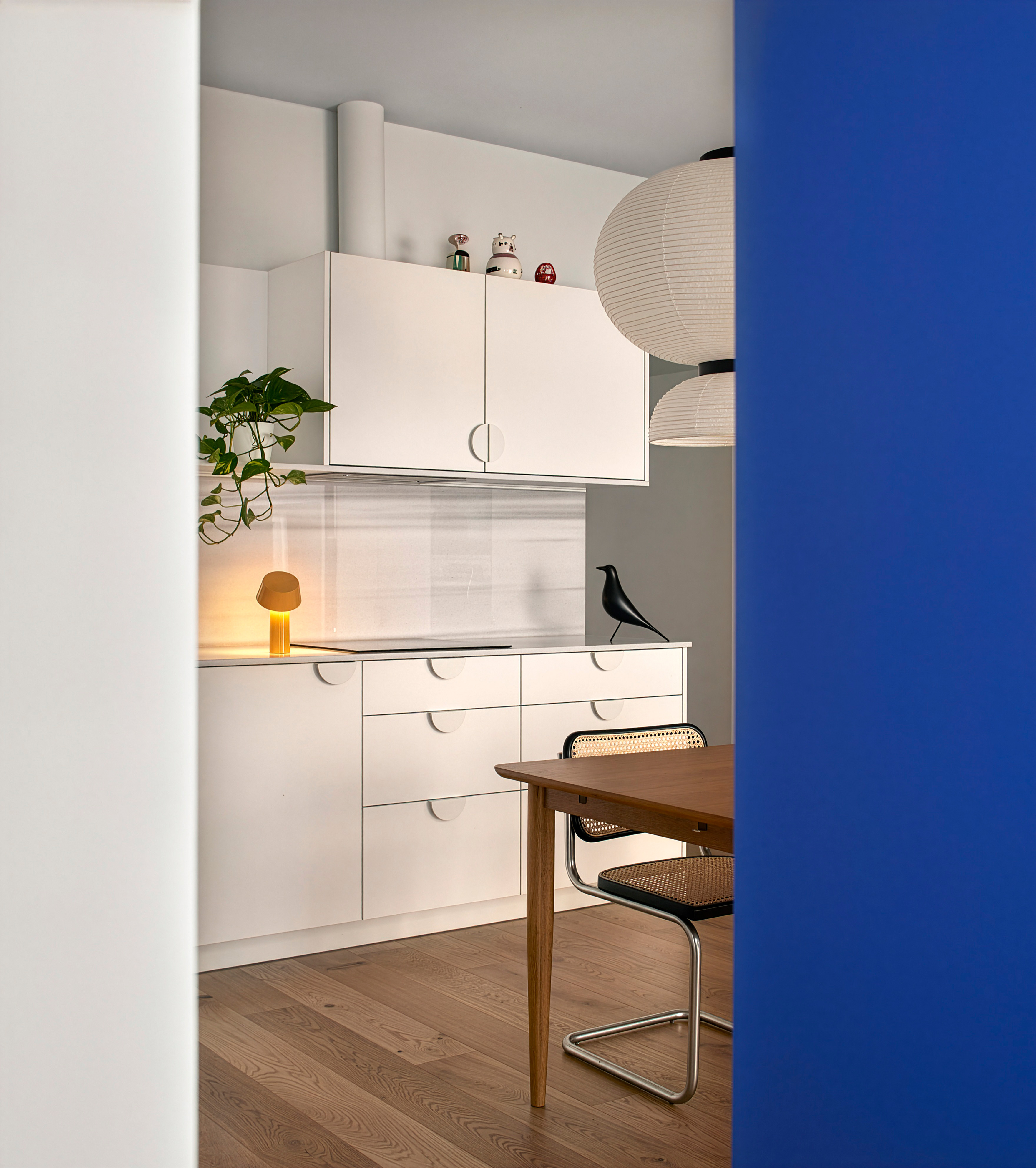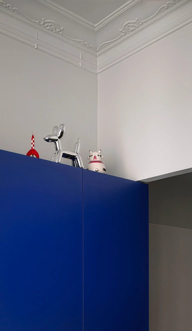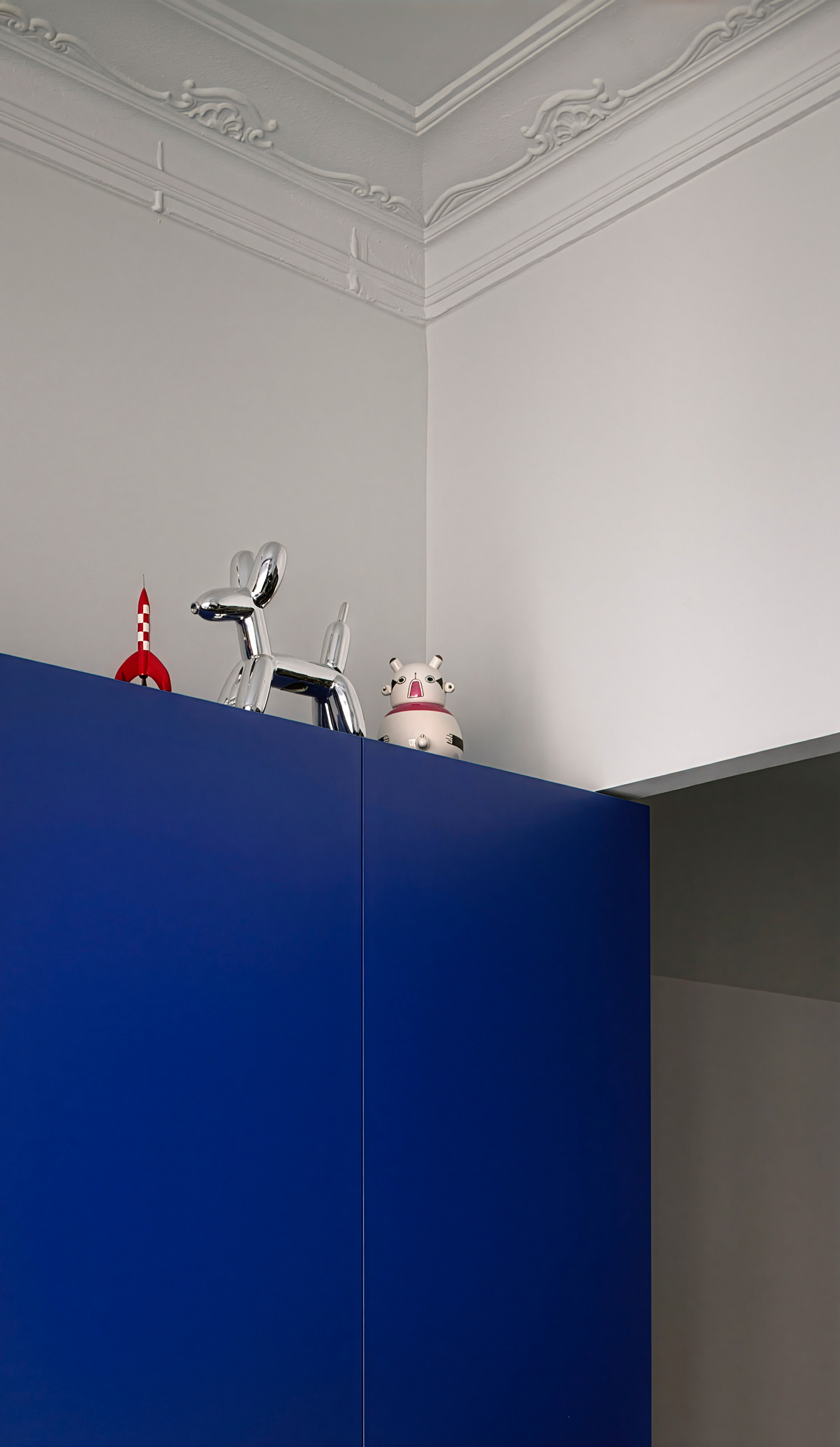 Gra kolorów jest tu bezkompromisowa. Podobnie jak linia widnokręgu oddziela błękit nieba od granatu oceanu, tak w projekcie CHANCHS oddzielono kolor "petrol blue" oryginalnych sztukaterii od nasyconego błękitu Kleina (Klein Blue), który pokrywa nową zabudowę meblową. Ta granica nie jest jednak tylko linią podziału. Posiada swoją fizyczną grubość, stając się półką na kolekcję przedmiotów i pamiątek zgromadzonych przez właścicieli w ciągu 10 lat podróży po świecie.