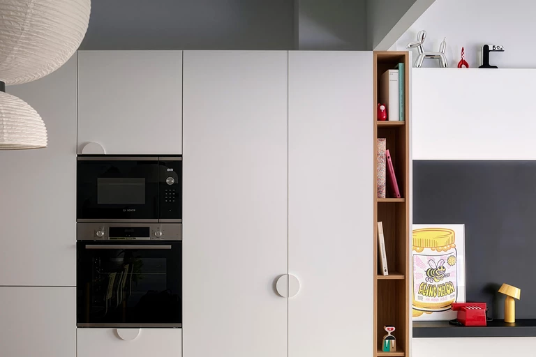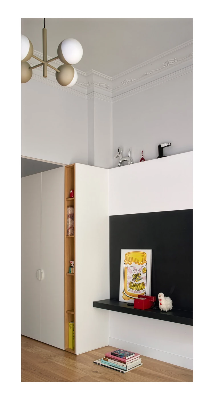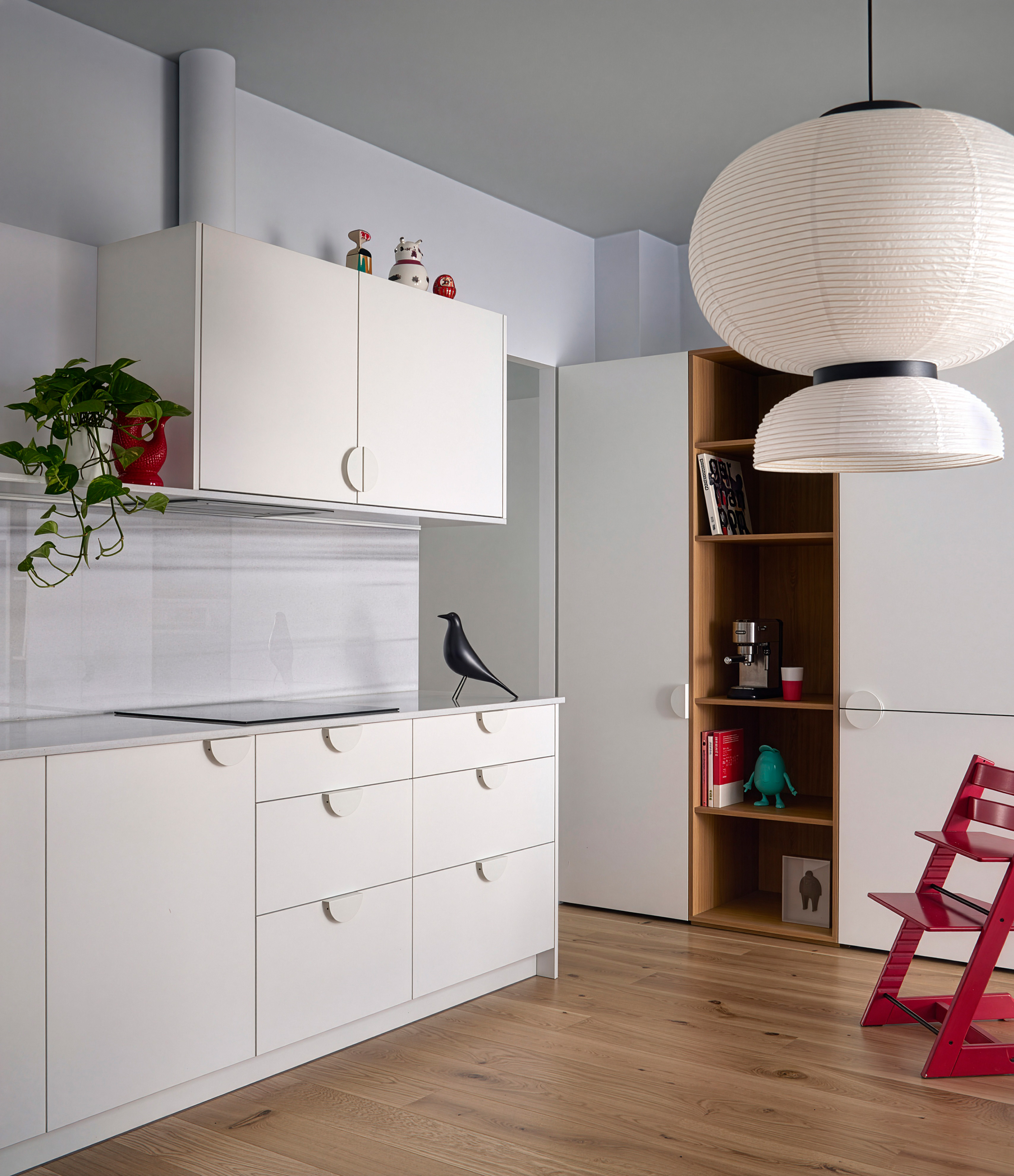 Układ funkcjonalny mieszkania został całkowicie redefiniowany. Wejście prowadzi bezpośrednio do serca domu – otwartej strefy dziennej łączącej kuchnię, jadalnię, salon oraz biuro. Całość orbituje wokół centralnego elementu – kubika w intensywnym odcieniu błękitu Kleina, na którym "spoczywają" oryginalne gzymsy i sztukaterie sufitowe.
