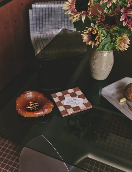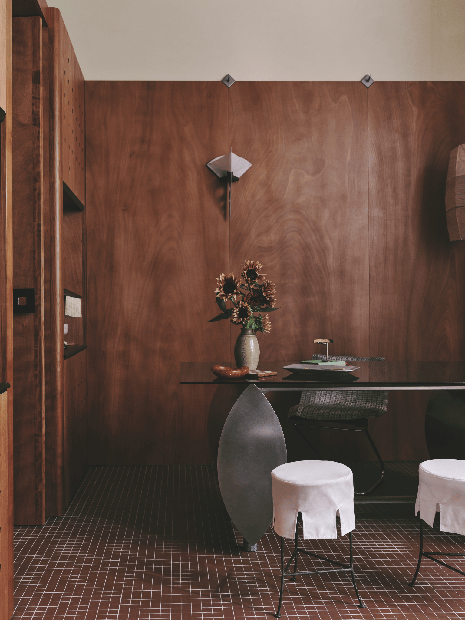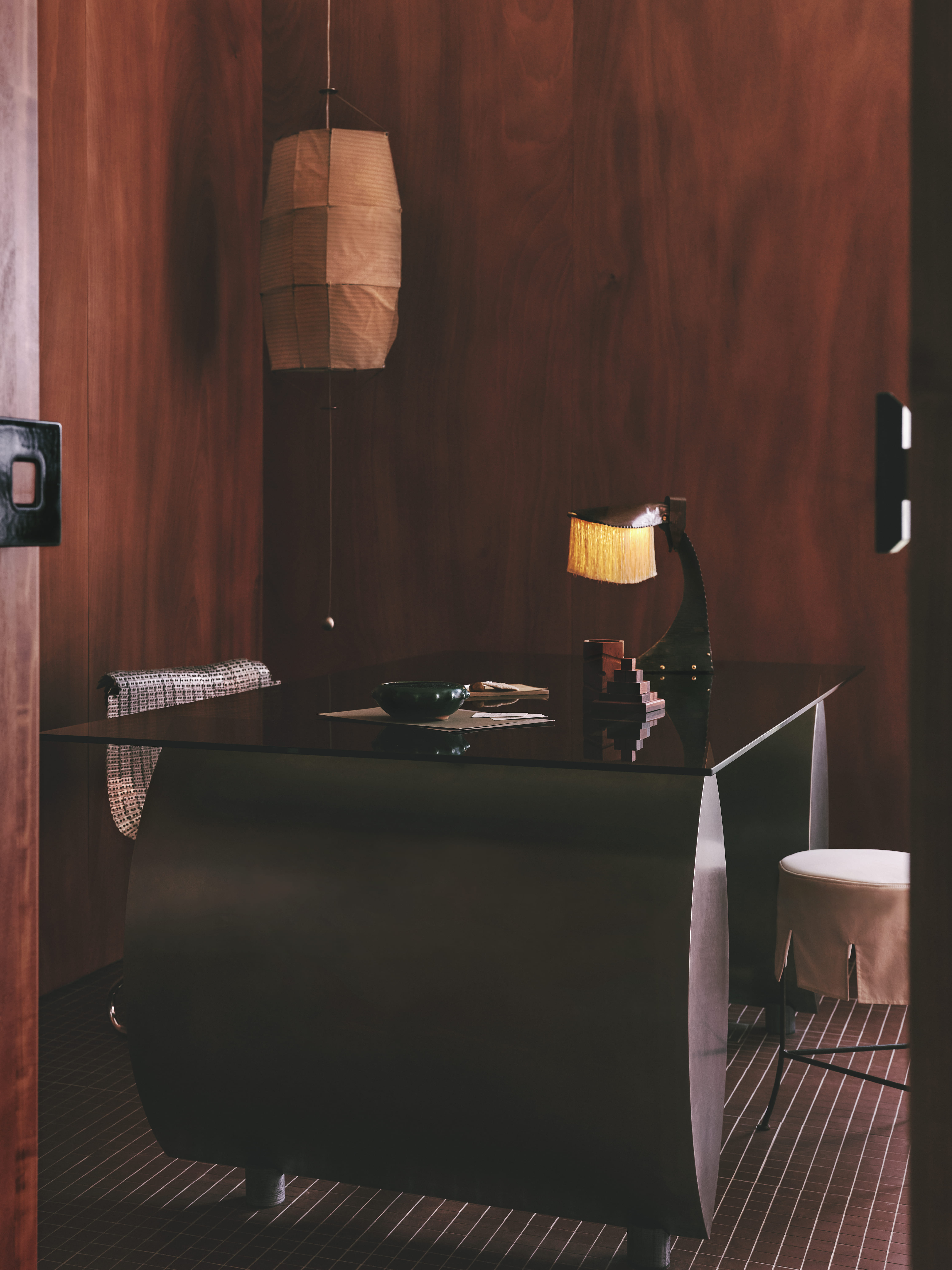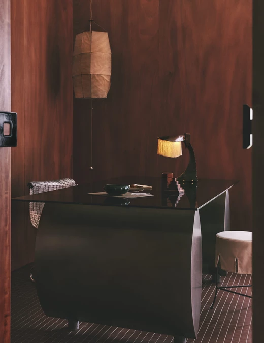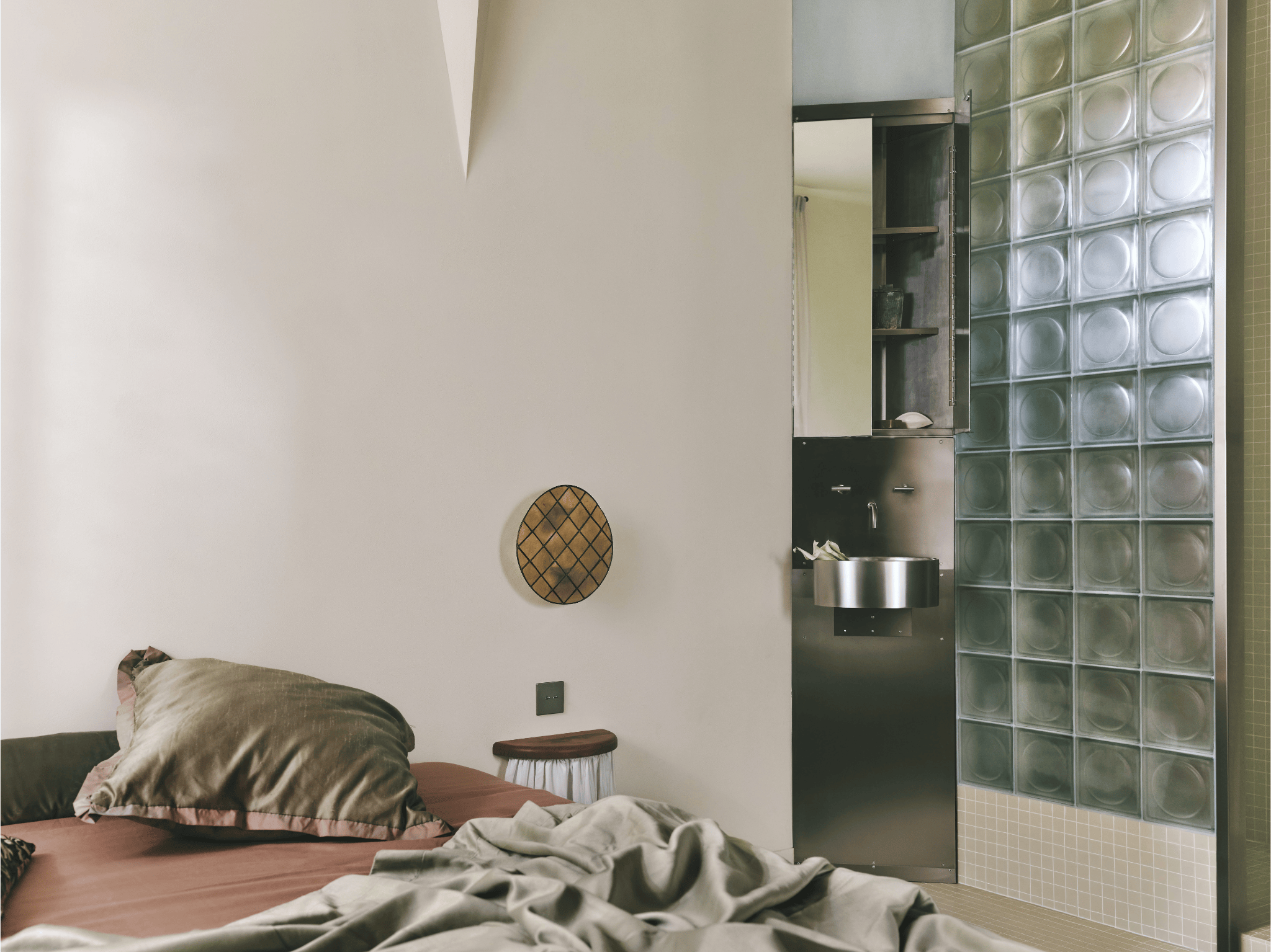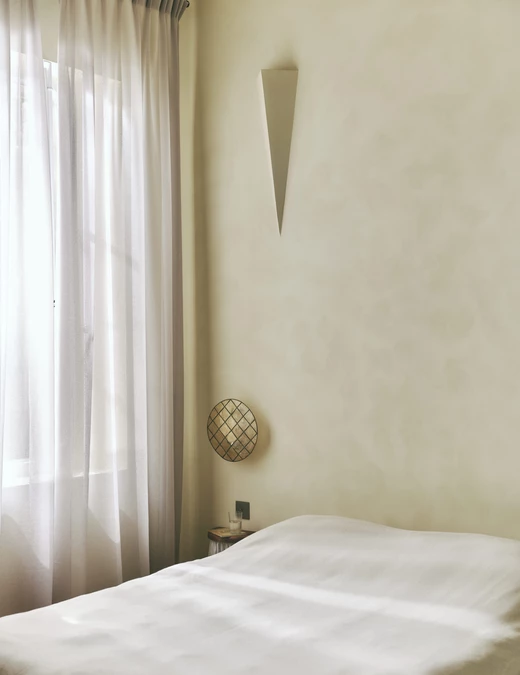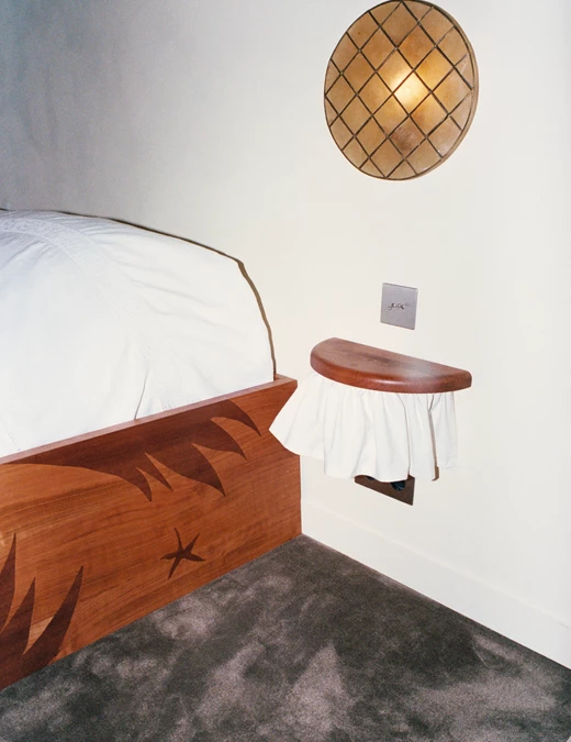 Wiele elementów wyposażenia zostało zaprojektowanych specjalnie przez Bétyle Studio: łóżko z intarsją przedstawiającą motywy gwiazd i symboliczne betyle, stoliki nocne oraz klamki drzwi wykonane z drewna i czarnego lakieru. Każdy detal ma tu znaczenie, ale nie jako ozdoba, lecz nośnik emocji, pamięci i rzemieślniczej precyzji.