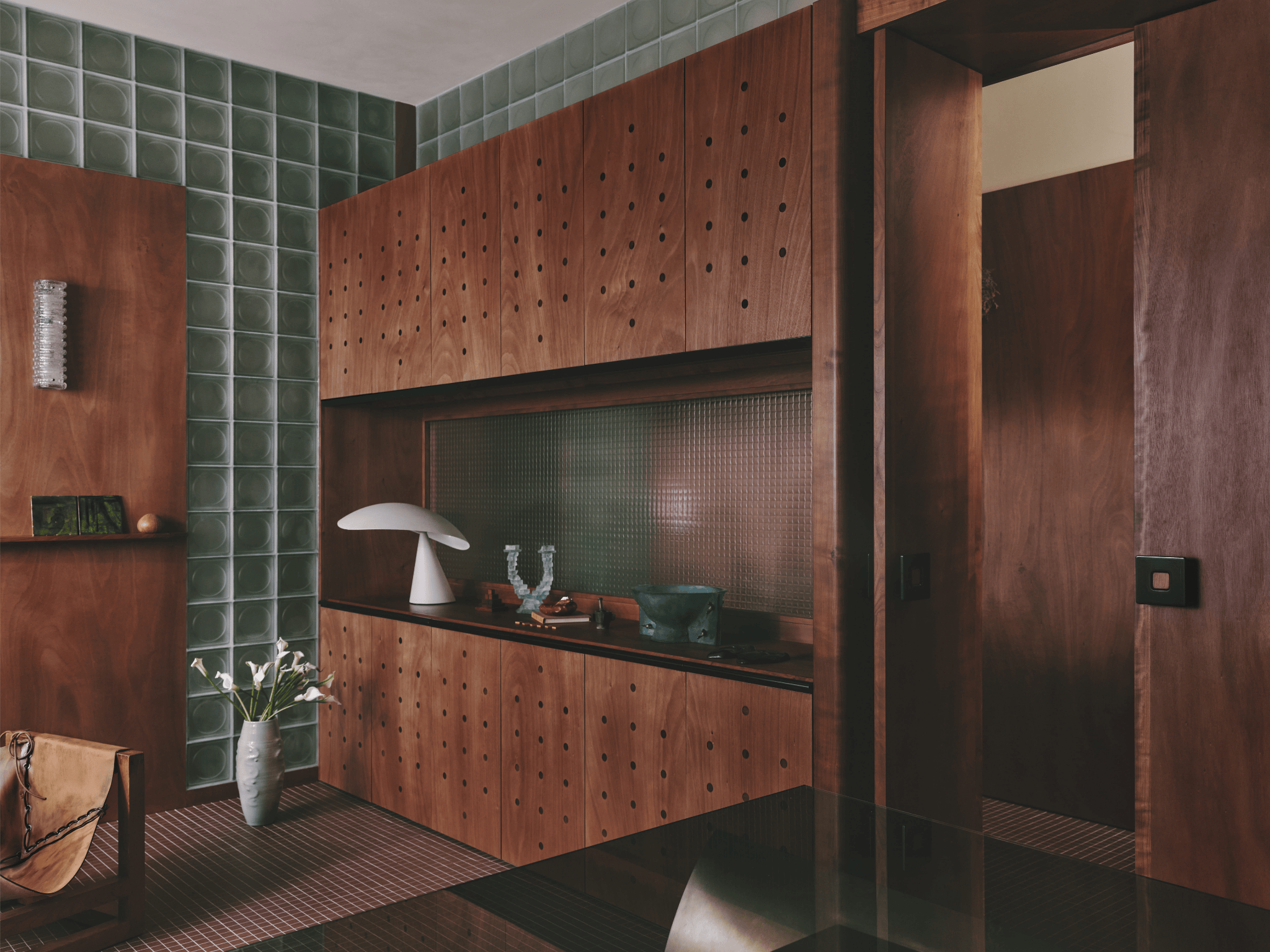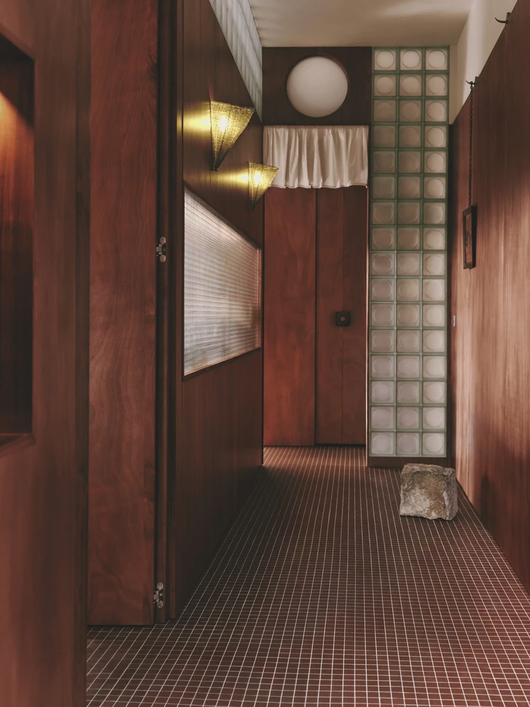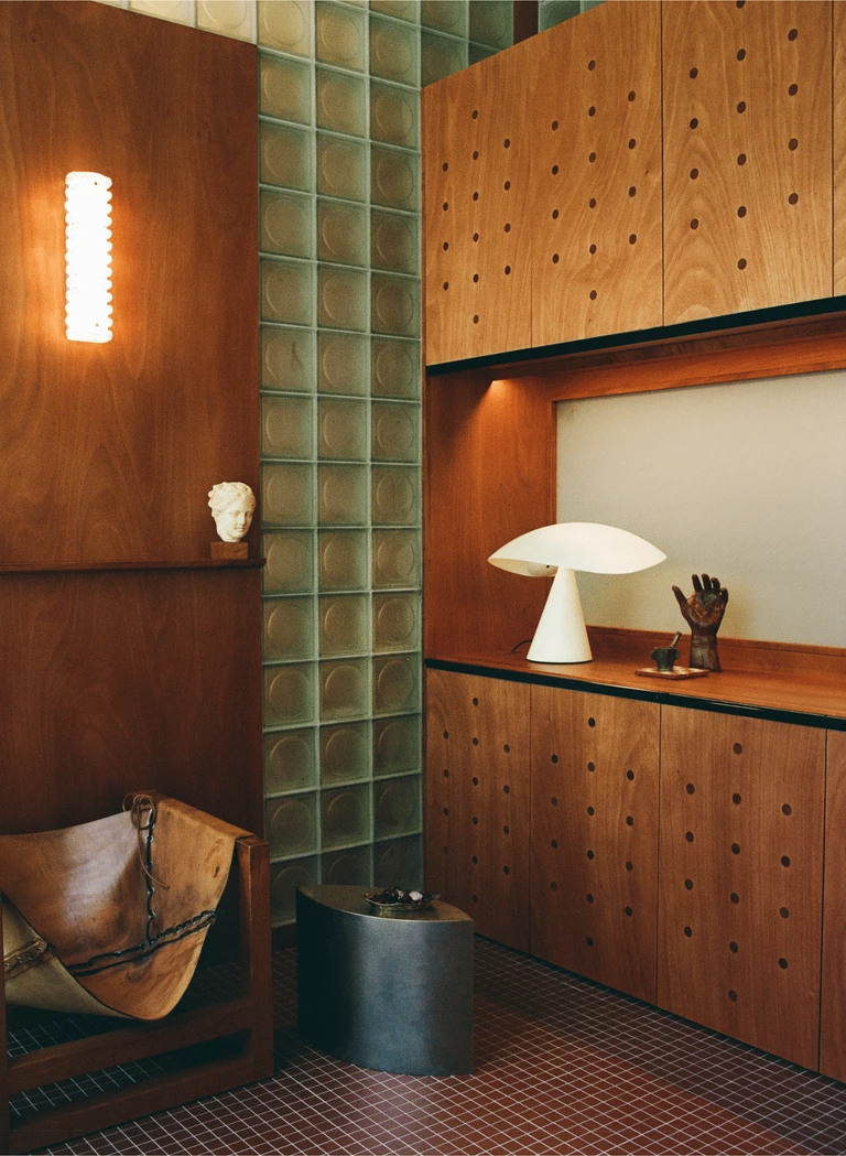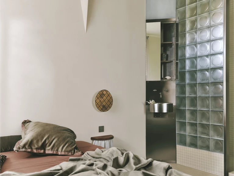 Delikatnie mleczne szklane pustaki rozpraszają światło, budując specyficzną atmosferę głębokiej intymności i spokoju.
