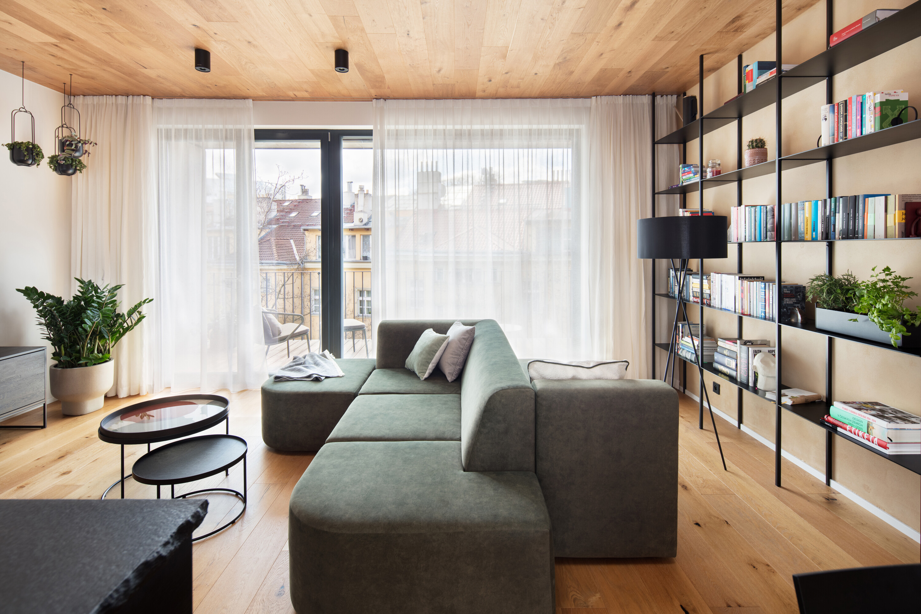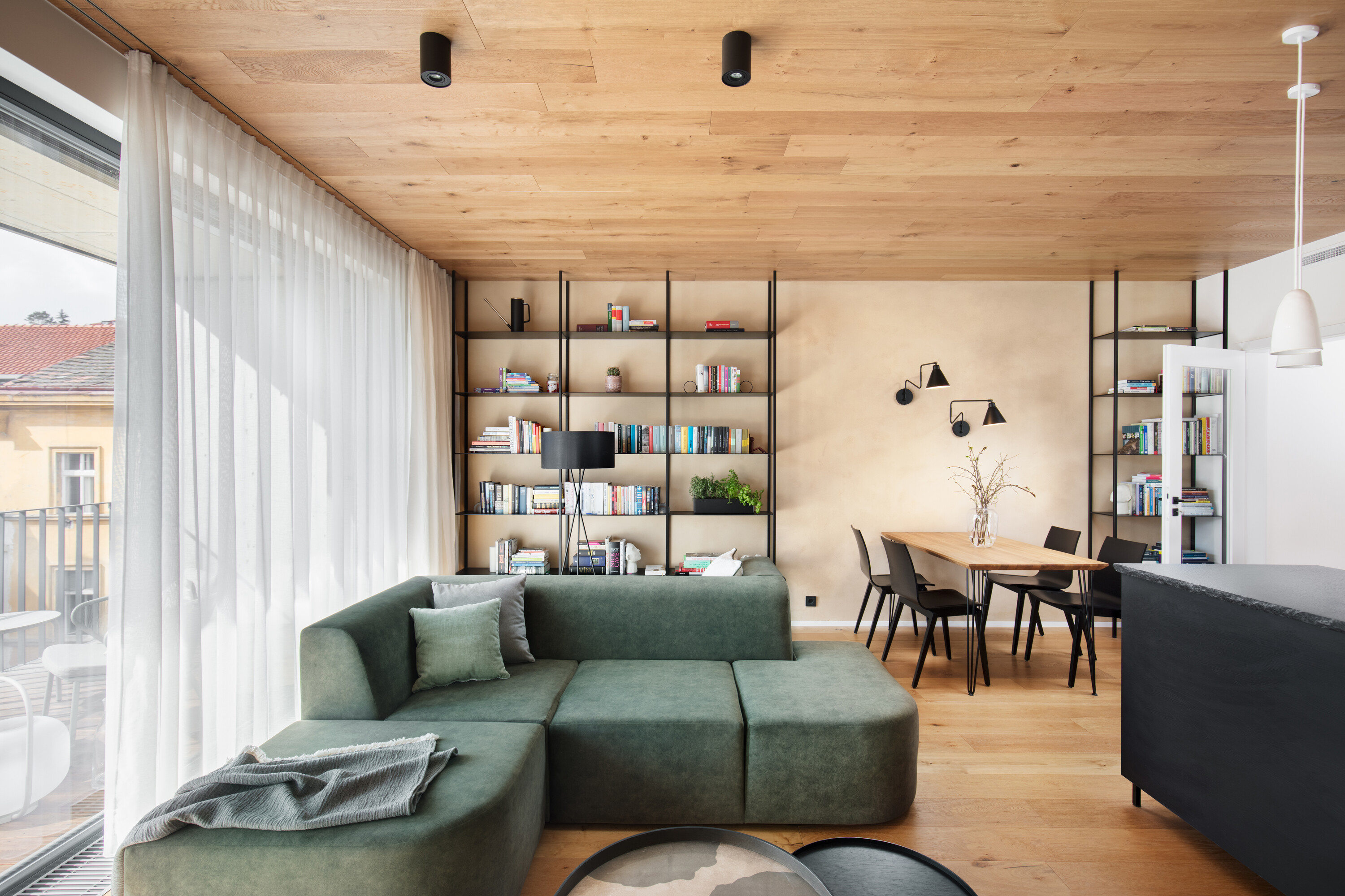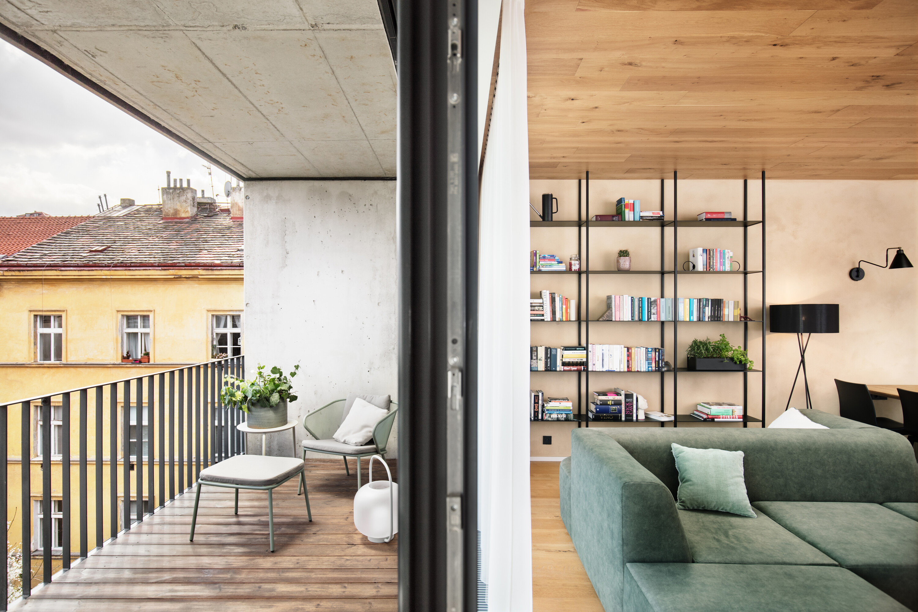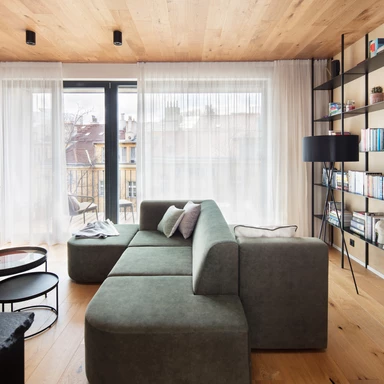 Budynek Neugraf od progu pokazuje swoją techniczną, „twardą” twarz: połacie betonu, ciemne ramy okien, szarość elewacji i metalowe detale. To architektura, która niczego nie udaje - jest czysta, chłodna i bardzo miejska. Wyzwanie, przed którym stanęło Iva Hajkova Studio, polegało na stworzeniu wewnątrz tej industrialnej skorupy miejsca, które pozwoli domownikom odetchnąć.
