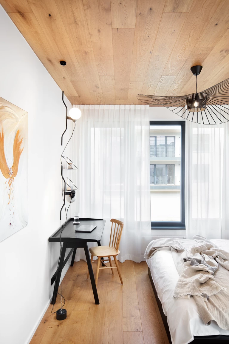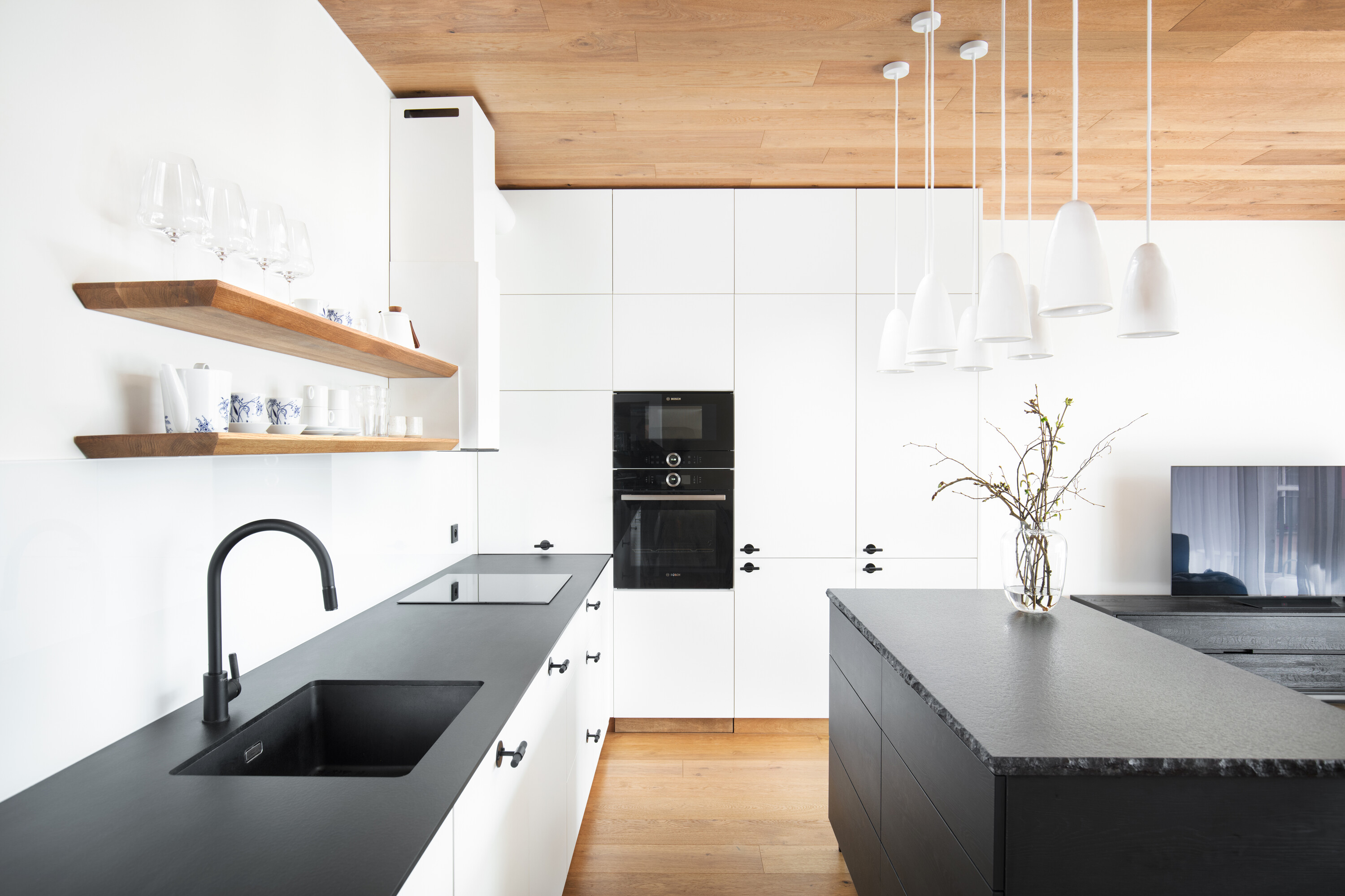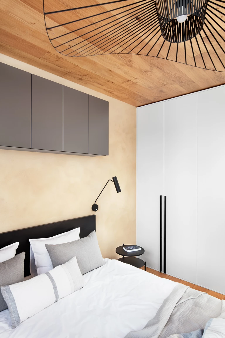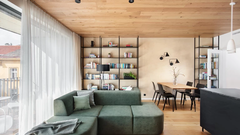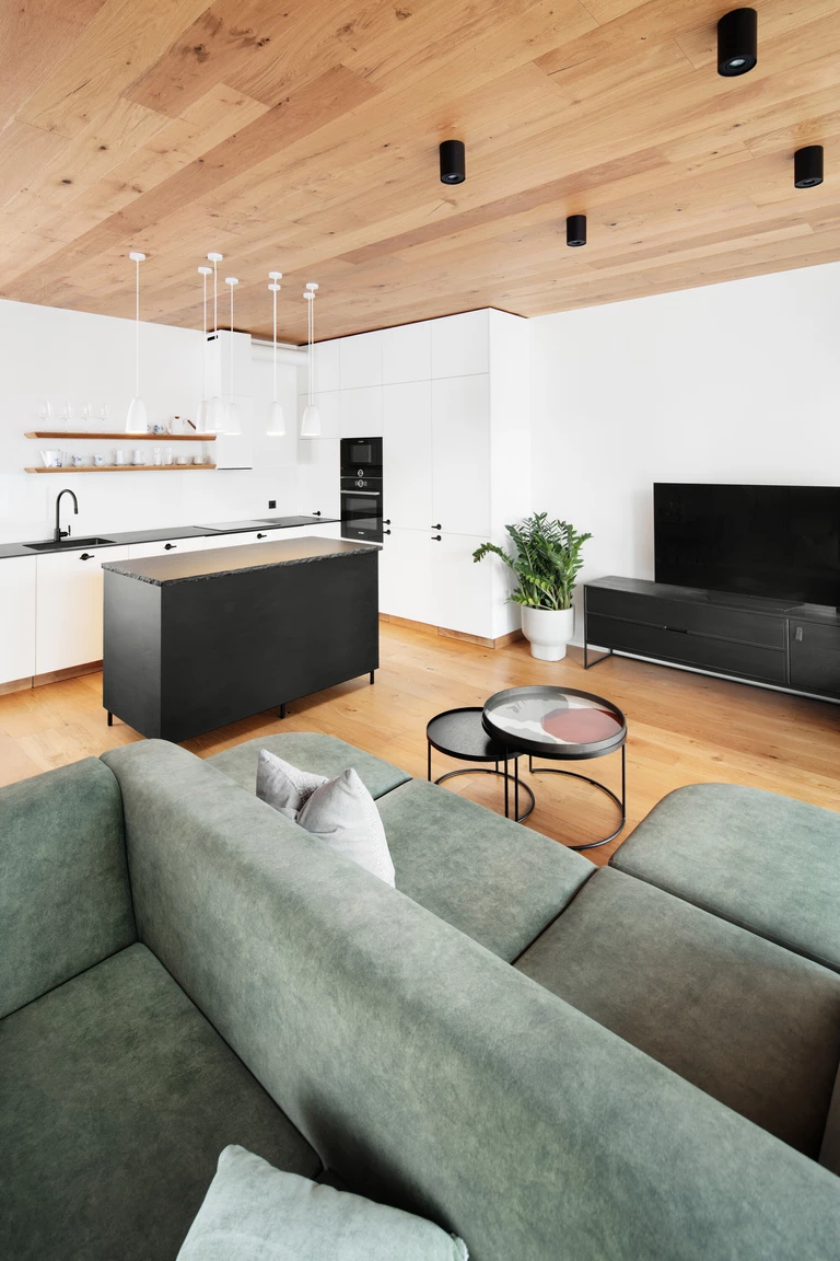 Dominują tu jasne dębowe podłogi i robione na zamówienie meble, które płynnie wpisują się w układ pomieszczeń. To właśnie stolarka, wykonana przez pracownię HAKO nábytek, nadaje ton całemu wnętrzu, porządkując przestrzeń i eliminując wizualny chaos.