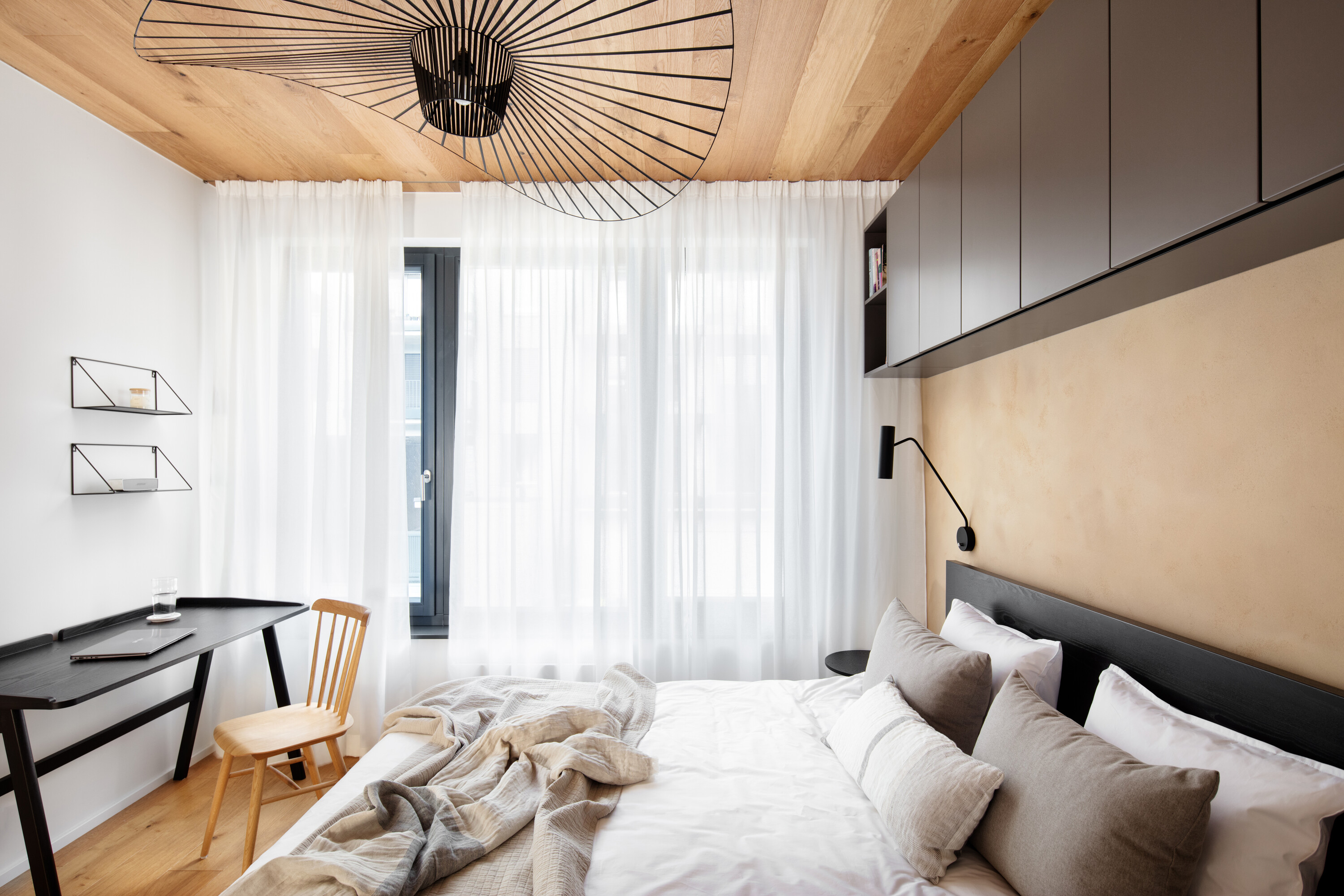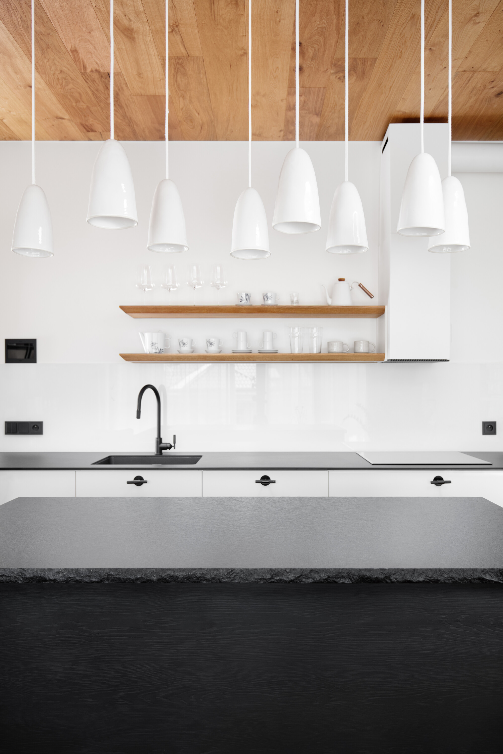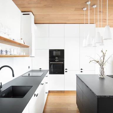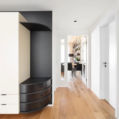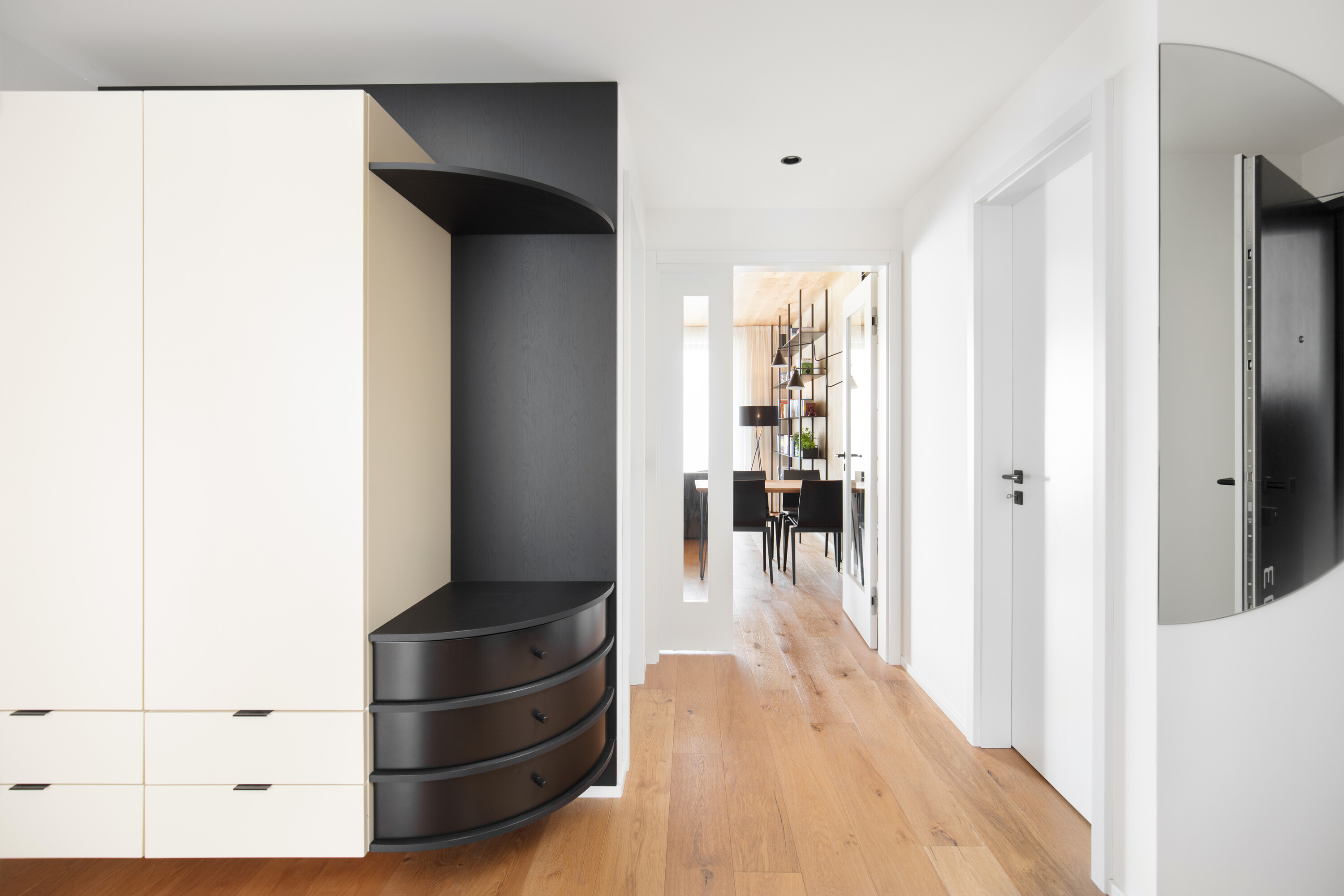 Dominują tu jasne dębowe podłogi i robione na zamówienie meble, które płynnie wpisują się w układ pomieszczeń. To właśnie stolarka, wykonana przez pracownię HAKO nábytek, nadaje ton całemu wnętrzu, porządkując przestrzeń i eliminując wizualny chaos.