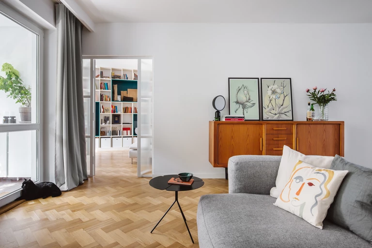 W łazienkach występuje jasnoszare lastryko, które zostało docieplone jesionową zabudową. W mieszkaniu można znaleźć również projekty z historią. W salonie znajduję się duńska komoda z lat 60, którą udało się znaleźć w Yestersen, a nad stołem wisi lampa LES ACROBATES projektu Bernard Albin Gras produkcji francuskiej firmy DCW. W gabinecie znajduję się vintage krzesło do biurka wyszukane na warszawskiej Pradze.