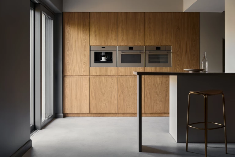 Wyzwaniem projektowym było sprostać układowi pomieszczenia, który łączył dwie części budynku. Monumentalna kuchnia płynnie przez nie przechodzi, otwierając się na część jadalnianą półwyspem. Pomieszczenie jest ciepłe, przytulne, ale też minimalistyczne. Efekt ten został osiągnięty dzięki dominującemu w zabudowie kuchennej fornirowi - dąb naturalny z kolekcji Norwegian Wood marki FRØPT, który doskonale komponuje się z gładkimi frontami lakierowanymi w odcieniu piaskowym, blatem ze spieku kwarcowego oraz szklanym sprzętem AGD, w kolorze szampańskim. Co więcej, aby podkreślić linie podziałów szafek, ale i móc zrezygnować z dodatkowych elementów, w projekcie frontów dębowych zastosowano uchwyty frezowane Blade.