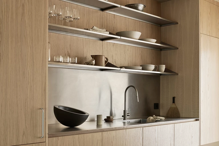 Szafki z litego dębu pozwalają ukryć przed oczami to, co nie wymaga eksponowania. Szuflady z litego dębu sprawiają jednak, że zabudowa kuchenna jest zachwycająca nawet wewnątrz. Blat ze stali nierdzewnej i osłona przeciwbryzgowa dodały przestrzeni profesjonalnego charakteru, zamieniając zwykłe domowe pomieszczenie w przestrzeń rodem z restauracji w skandynawskim stylu.
