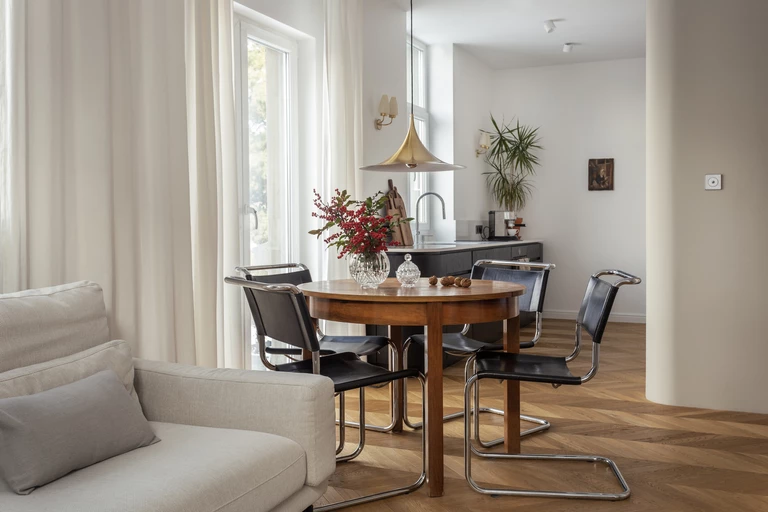 Prosta stylistyka wnętrza o subtelnej kolorystyce została wzbogacona o dodatki vintage, które podkreślają przedwojenny charakter architektury. Beż i biel przeplatają się tu z wyrazistą bejcą drewna, czarną skórą oraz złotymi i chromowanymi akcentami.
