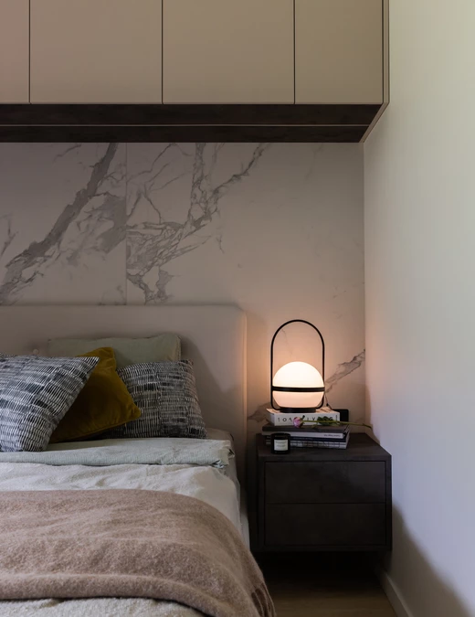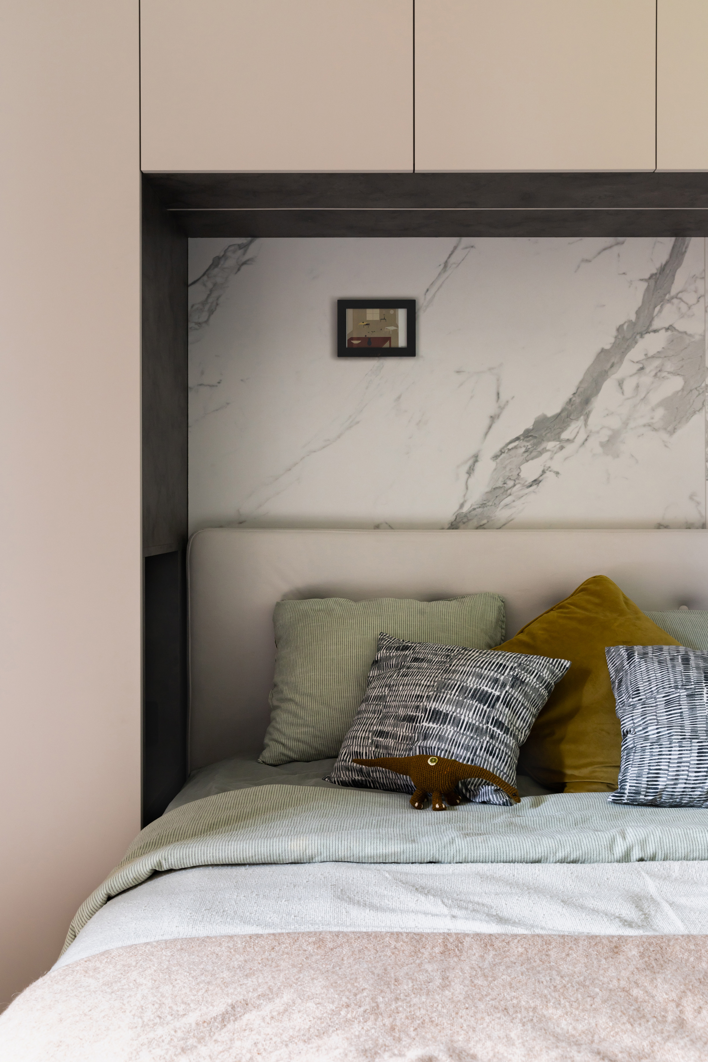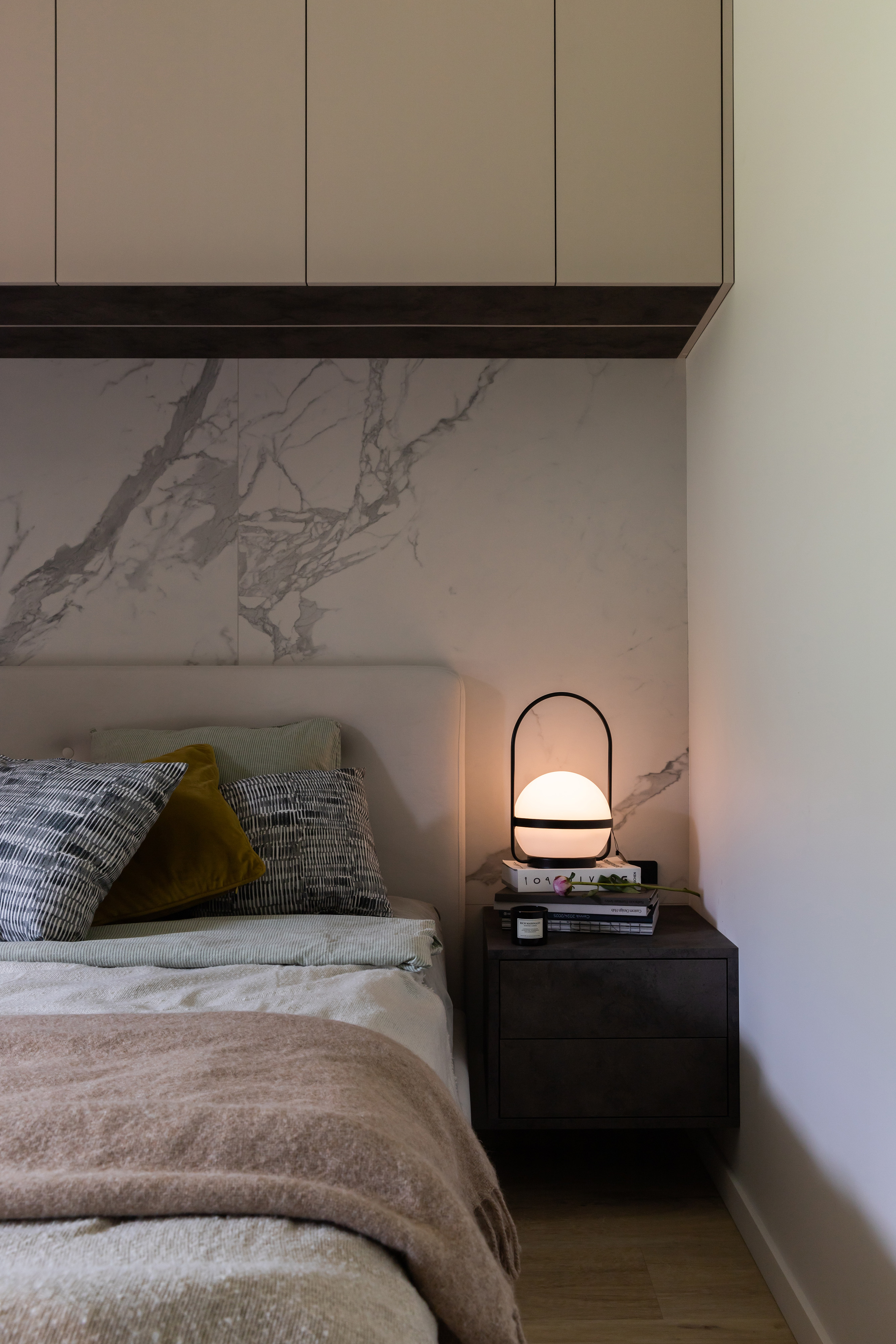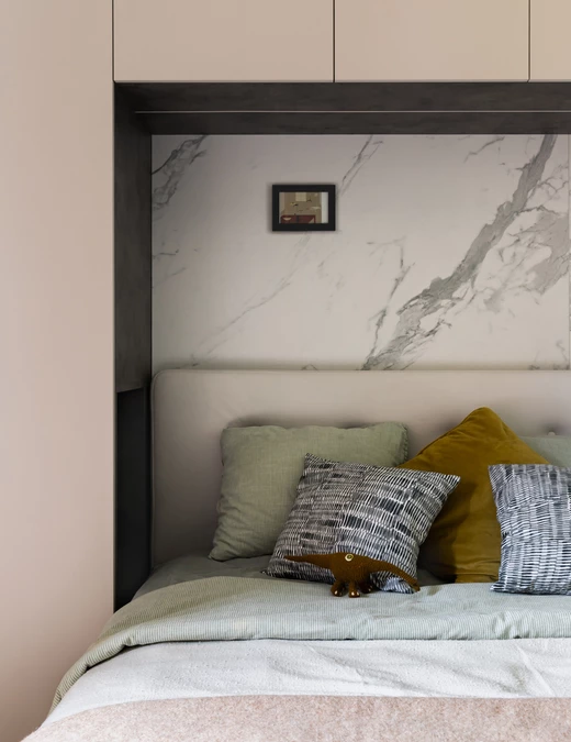 Sypialnia to królestwo spokoju i delikatności. Za łóżkiem znalazła się dekoracyjna płytka imitująca kamień, która podkreśla atmosferę wyciszenia. Szafa z frontami w cienkiej, metalowej ramie optycznie powiększa przestrzeń i odbija zieleń zza okna, integrując w sobie jednocześnie miejsce do pracy.