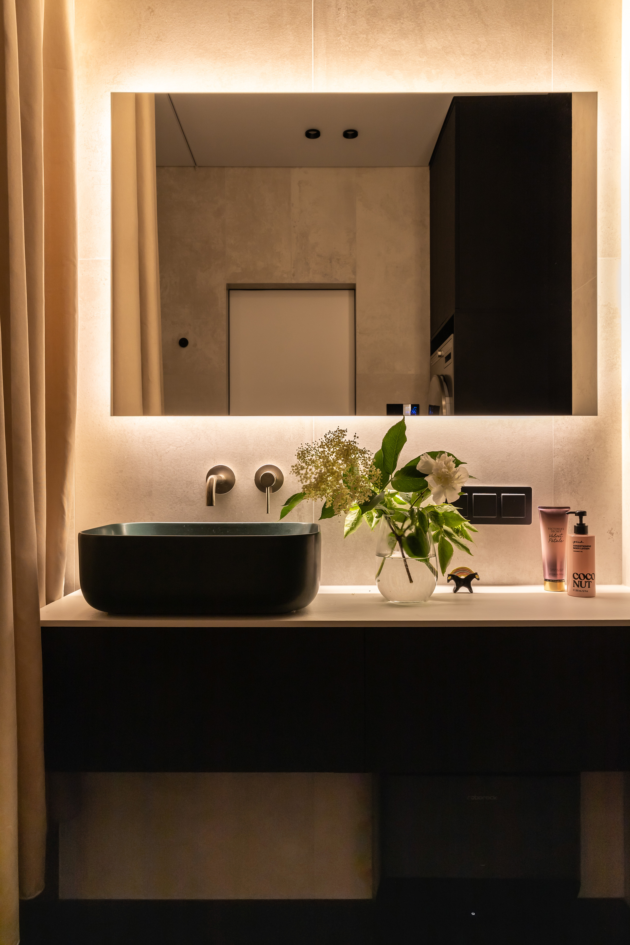 Nawet w łazience kontynuowany jest leitmotiv całego projektu: kontrasty i zmysłowe powierzchnie. Matowe płytki Imola Ceramics przypominają ręcznie wygładzony tynk.